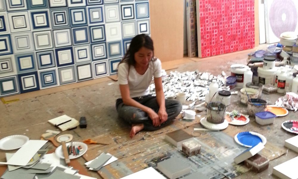 I am a painter, from small to large scale paintings to mural to installation. I am not bound to fixed subjects; the choice of subject matter is based on the concept of the specific artwork. There are minimal to maximal grids, abstract forms, geometric shapes, figures, or exploring color schemes. I use collage method incorporated into a painting. Rather than direct application of paint onto the panel, I use collage as a second medium because it motivates to labor and creates a sense of elementary. The spontaneous decision-making, finding surprises, outcome of unknown are the reasons of my collaged process. I work on two sets of process: At first, I paint on the thinly sliced/cut tapes/papers/canvas/fabric, and etc. Once I have enough accumulated pieces, I paste them by random choice onto the wooden panel. Before these “collaged painting” process, I set the goal to make something that is defined to be perfect, knowing that it is impossible to accomplish without measuring tools. Instead, my approach to accomplish the perfection is to use my hand and trust myself to be precise, over and over again. I’ve been interested in the process of exploring the “idea” of shapes as opposed to their measured reality. Upon closer scrutiny, the viewers will find my hand-drawn subtle variations of lines, colors, textures, and layers of mediums. And the paintings may look singular but consist of thousands of multiples of the same. Sometimes the paintings may look over-loaded with many elements but these are hand-drawn repeated single element that are collaged onto the panel.