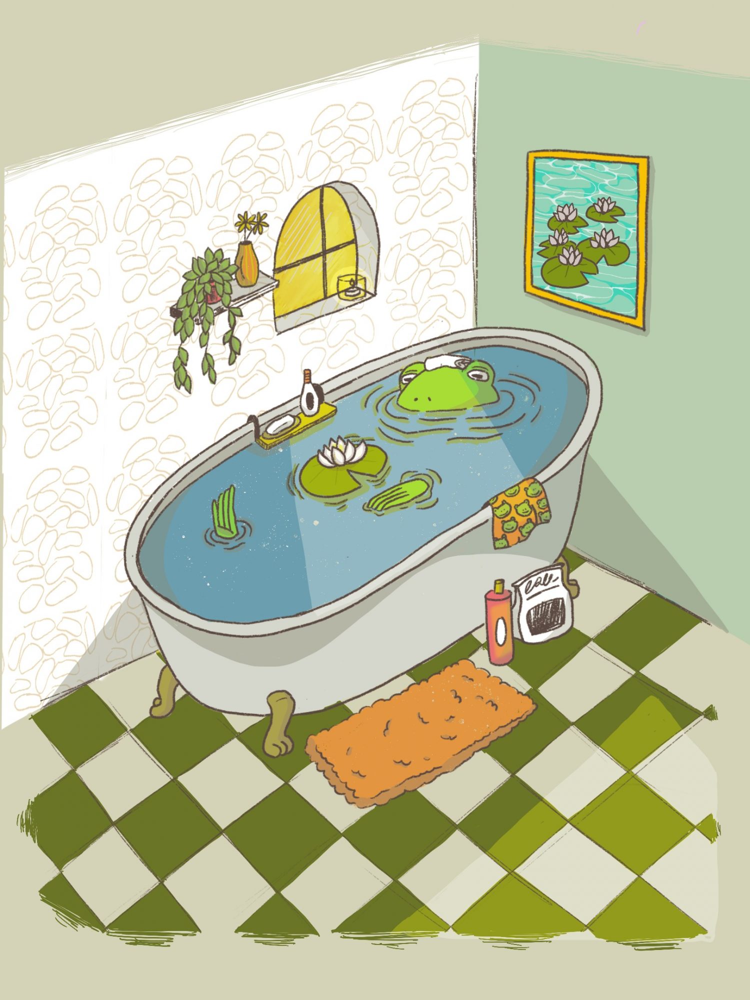 I’m also happy with my illustration “Frog Girl Takes a Bath”, one of multiple Frog Girl works that shows a soft and healing moment. The colors and light with her positioning in the tub felt personal to me, as I relate strongly to this character.