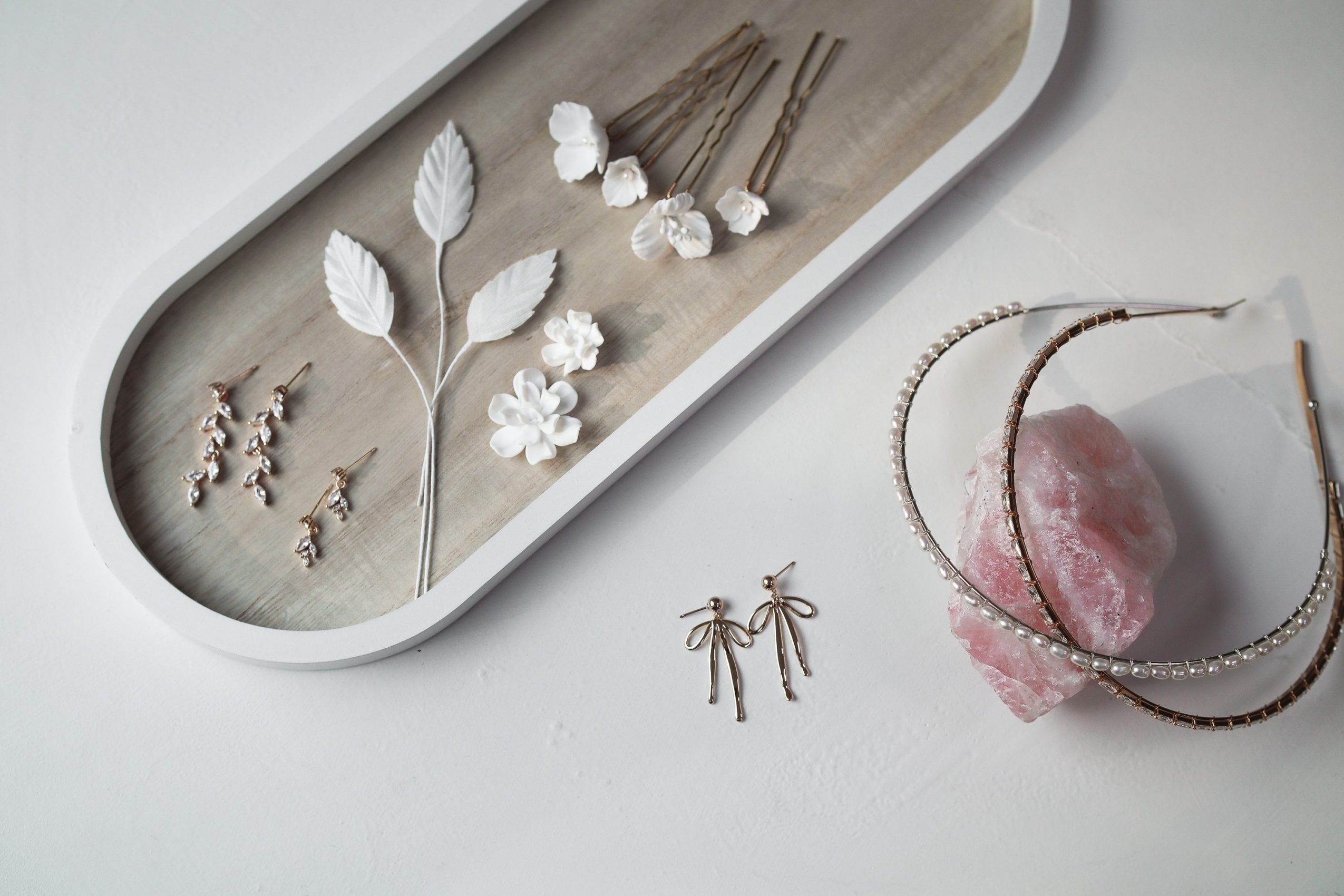 Recently I started working with polymer clay flowers and they are my current favorite component to work into styles. The finish is velvety soft and smooth, they look luxurious like a ceramic, but they’re also lightweight and easy to wear. I’ve been putting them on crowns, earrings, hair pins, hair slides… anywhere I can. I’m obsessed.