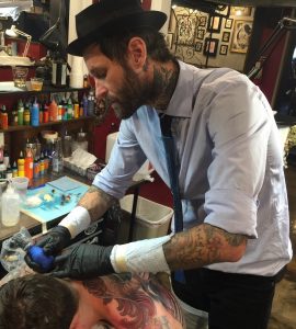 I was living in East Salinas, California, in the winter of 1994. I built a prison-style tattoo gun out of a walkman motor, a bent toothbrush and the high E string from my electric guitar. It didn’t take much to convince my friend to tattoo the cover of The Red Hot Chili Peppers album, Blood Sugar Sex Magik, on his forearm. After a few months of this kitchen wizardry, I upped my game, and I ordered: “The Cadillac” of tattoo machines from a Spaulding & Rogers advertisement in the back of Tattoo Magazine. I thought I was well on my way to becoming a tattoo artist when that package showed up at my door. By 1996 the Owner of Gold Coast Tattoo tracked me down, and I was offered a legitimate apprenticeship under the tutelage of the now famed Filthy Bill Henderson. I stayed at Gold Coast in Monterey, CA, for 7 years and tattooed P.G. (Pre Google) when you could not google an image but had to tattoo pre-drawn designs from our “flash” selection on the walls or you had to actually use your imagination to create custom tattoos (I know…they were archaic times).