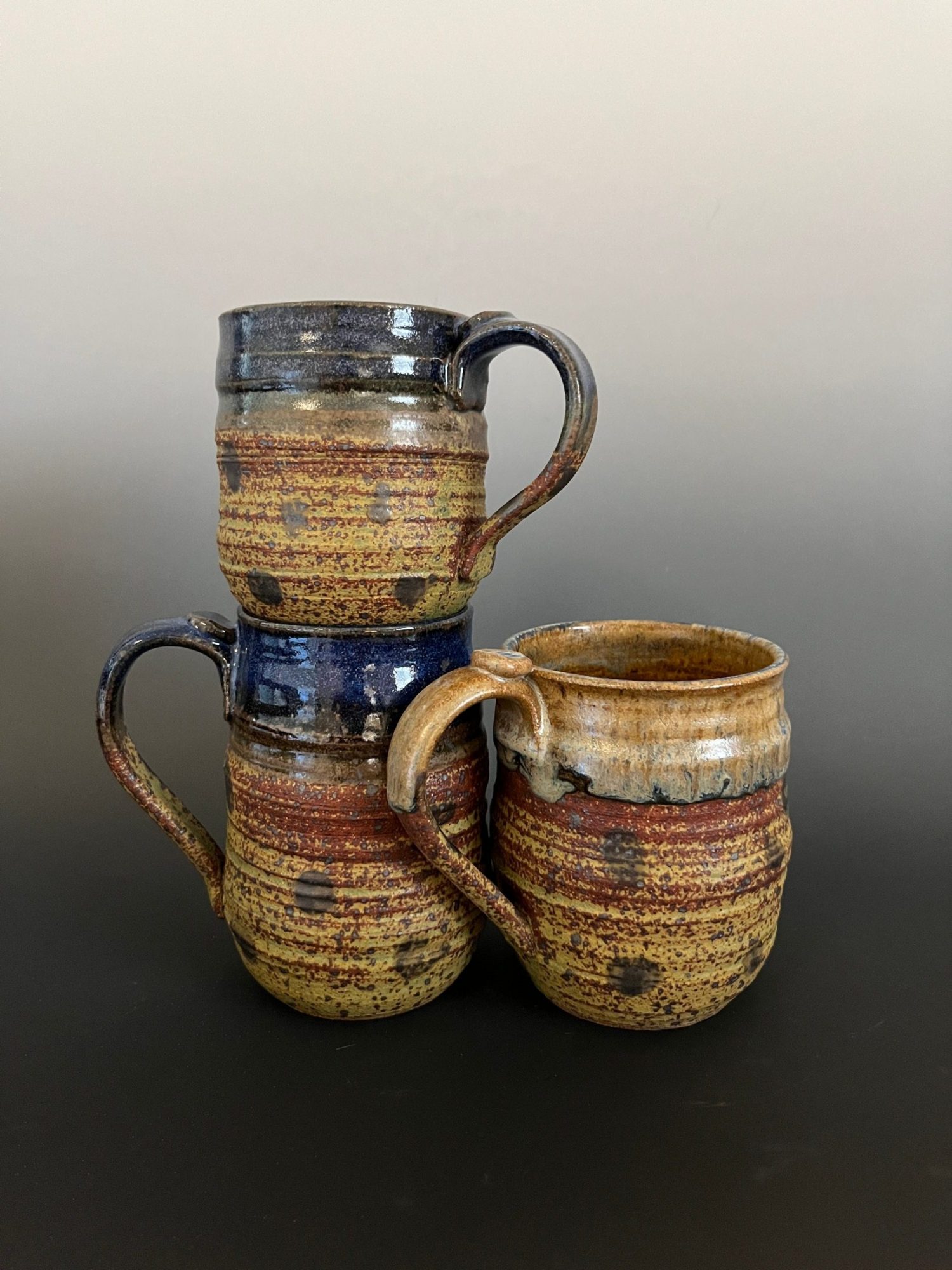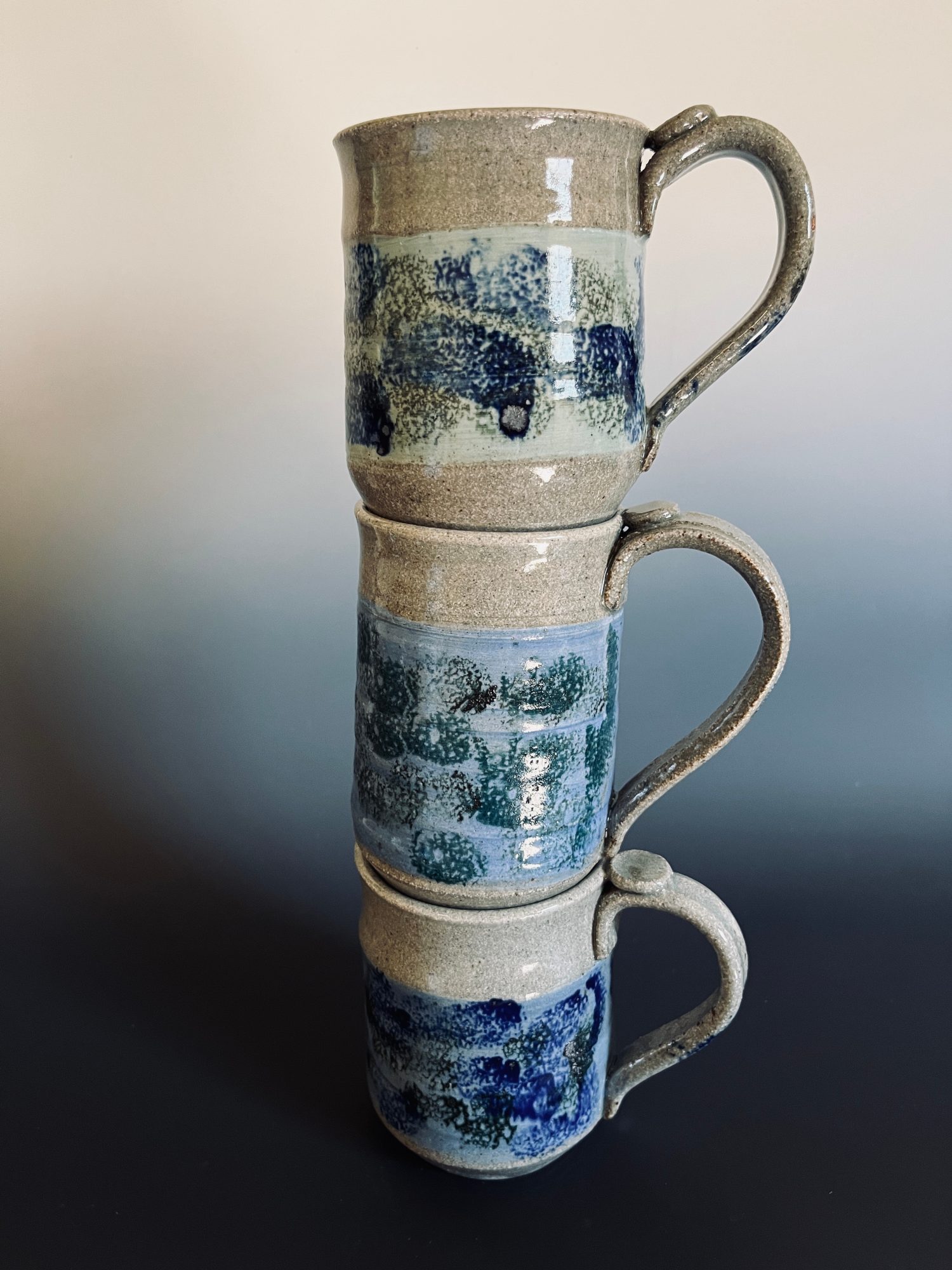 I have been a functional potter for most of my pottery career. I tend to be a minimalist in my decorating style. I like pots to have a purpose and a reason. (BTW, potters will call any vessel a ‘pot’.) Plus, I think food and liquid taste better in a handmade high-fire, stoneware vessel. My mugs are popular. They were honed from selling to my co-workers at the Hospital. The Sisters of Carondolet were at the forefront of realizing the wastefulness of Styrofoam and it was banned. My mugs had to fit many different size hands, be sturdy and keep the liquid hot for as long as possible. My customers worked right next to me and were not shy to critique!