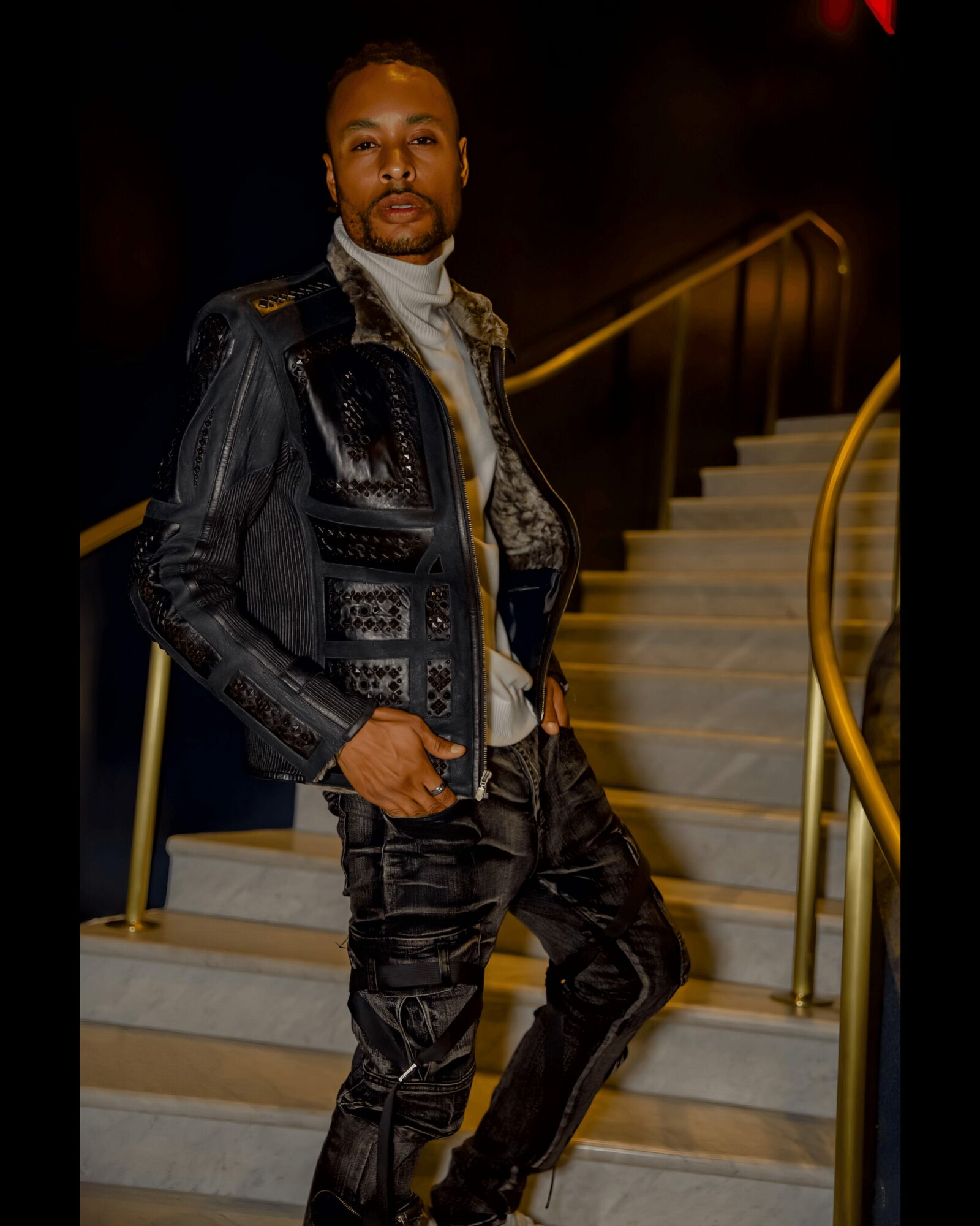 Black outfit, golden stairs –