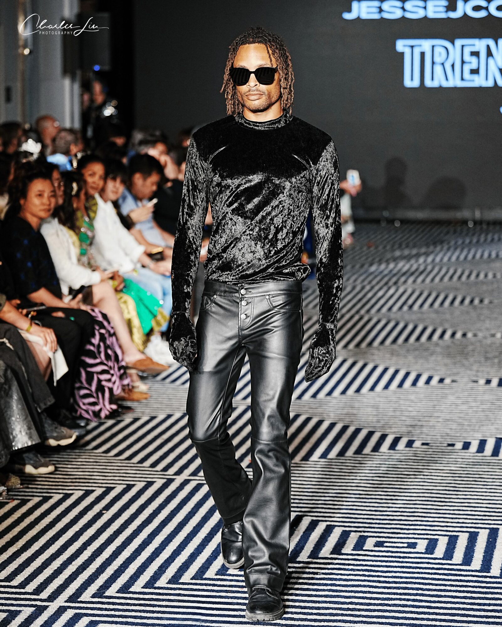 Black outfit, with shades, hair down – Charles Lin