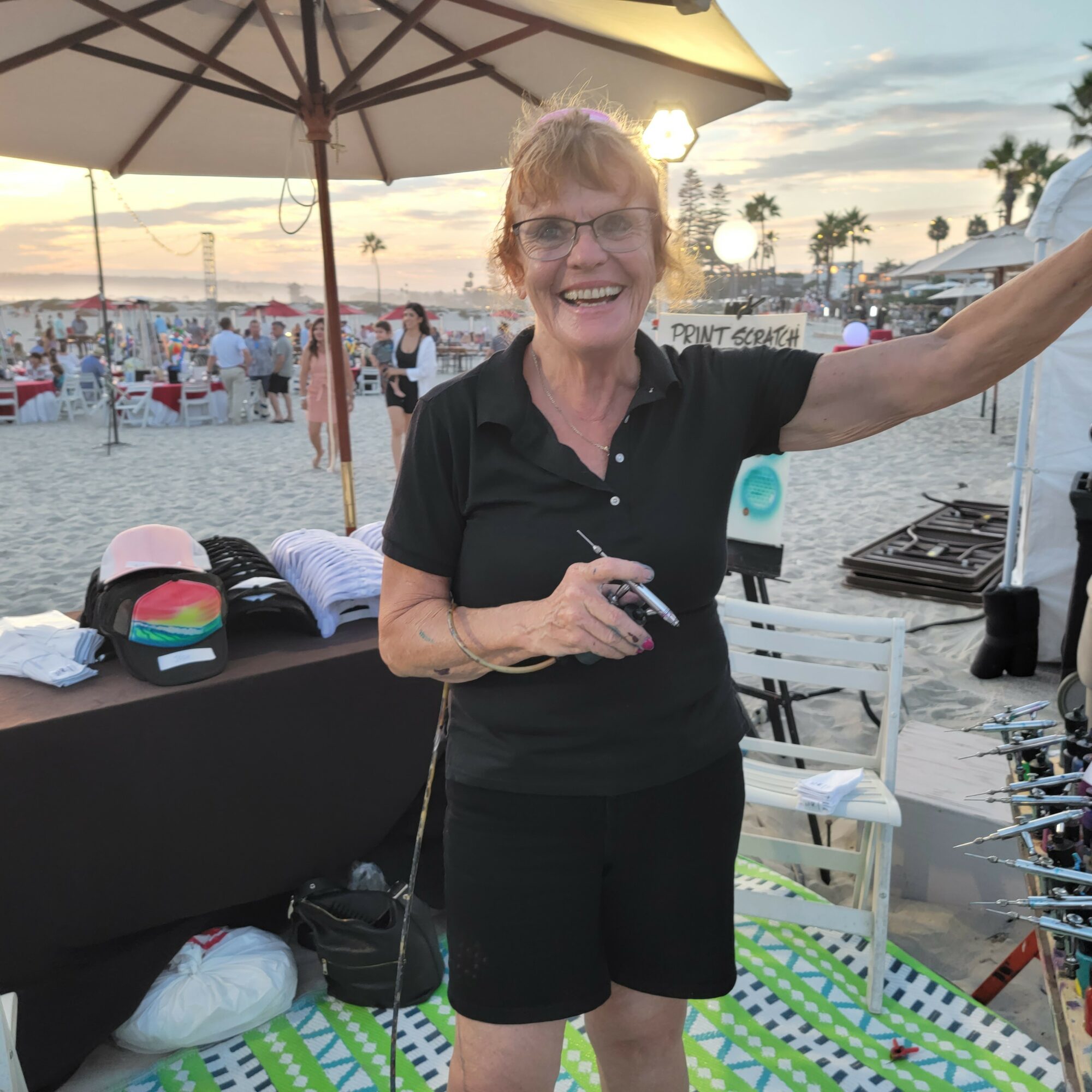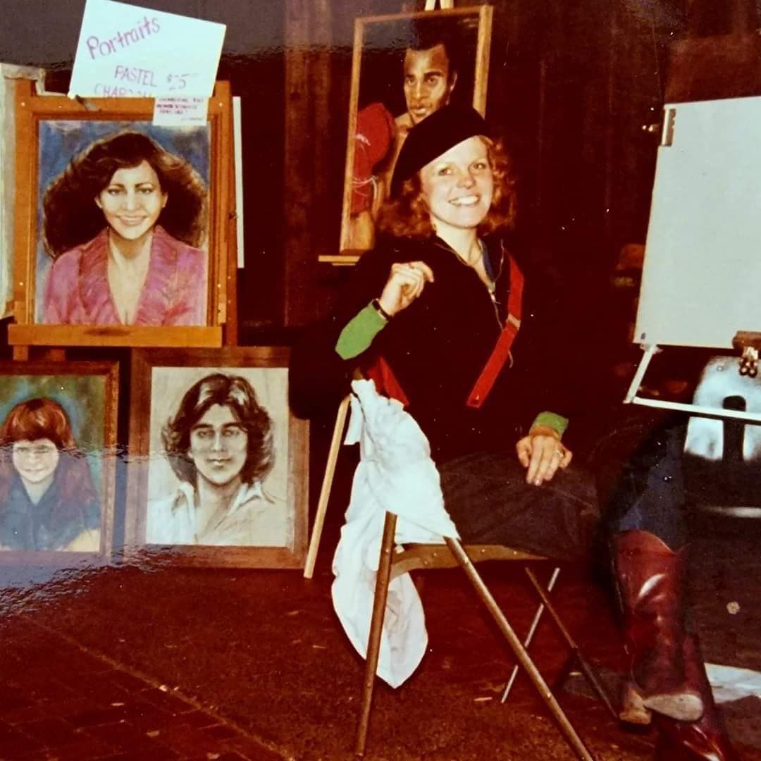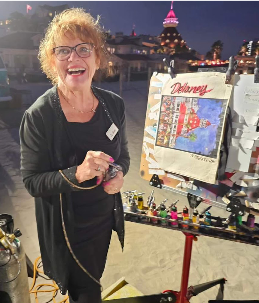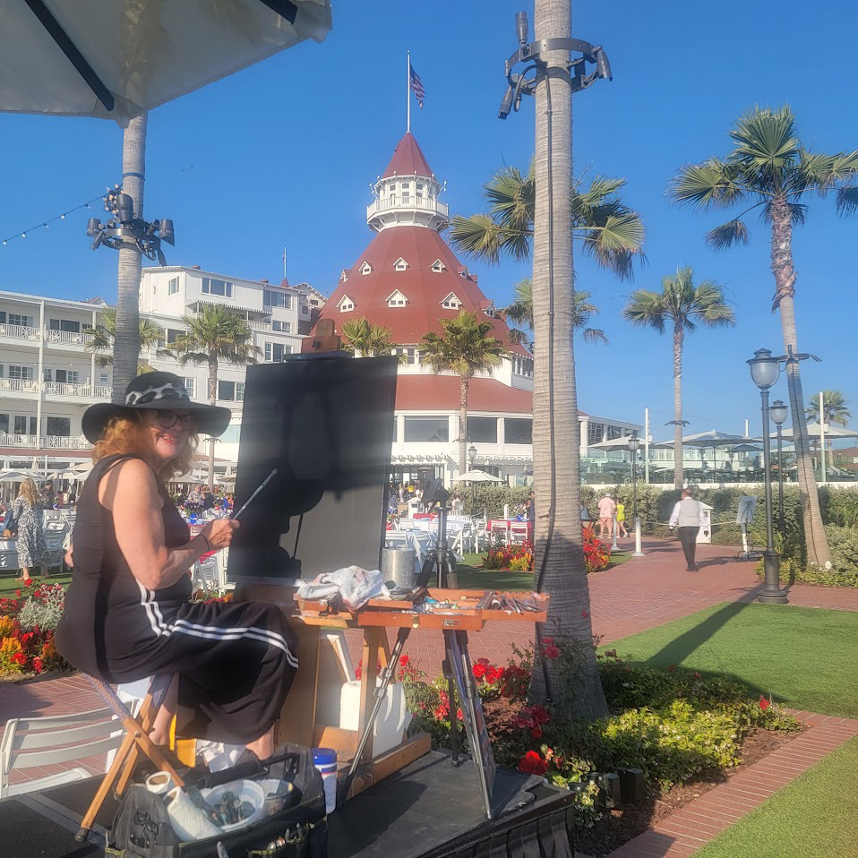 Let me introduce myself. My business is to draw pictures for people while they watch. I do it while you watch! So, as an art exhibitionist for the past 40 years, I have elicited a vast array of responses from my audiences, which vary from the carnival lots of America and Canada to the swank ballrooms where I am hired by corporations and Bar Mitzvah mothers alike to be a crowd pleaser! I have been a portrait artist in The French Quarter of New Orleans. “Painting mugs,” as John Singer Sargeant said as he tired of his illustrious career in Boston, painting the hoity toity stewards of industry and their wives. Underneath the space needle in Seattle, you’d find me in the summer, capturing those mugs of tourists, and at the rodeo in the Calgary Stampede, I’ve worked for McCann Erickson advertising in Tehran Iran, doing story boards and layouts for Coca Cola and various big clients in the 70’s, hand lettering the Coke logo in Farsi(which I cannot read.) ” It doesn’t say Coco Cola, Khanoom, it says something bad, we’re not telling you what!” my Persian colleagues in the bullpen, all male, by the way, would laugh uproariously at my expense. That office had its foyer bombed a few months later in the Marshall law days before the Shah left. If you want to hear more about that, you’ll have to read my book. Through it all, for 45 years, I have drawn, painted and sprayed pictures for money. I am an Art Whore. I need attention, constantly, or so I’m told. Well, 3 husbands have said so and now, so does my fiancée. But I’d say, I am an authentic artwhore. I give the people what they want. When I use my airbrush gun, I aim to please. So, when the Hotel Del Coronado hired me to paint a plein air large oil painting in 3 hours, on stage, of the Del and of the party at their elegant tables,of 400 exclusive members of the Del Club, I wasn’t nervous…I was terrified.! But… I did it! Even though the sky went from bright summer evening to a dark moonlit night in those three hours. Be in the moment, I tell myself when I’m painting Au Plein Air. Find the essence, the feel.. “If there’s one thing you can’t lose, its that feel” or so crooned Tom Waits and Keith Richards famously in a duet. I always love ugly guys with bad voices. My favorite rock stars. The painting was on the block this December at the Del Club’s charity auction. All the proceeds, which were respectable, went to benefit an orphanage in Baja. It’s come to me after all these years to try to do good jobs and make people happy (like an Art Whore should..) That’s a business value that’s important to me. I try to be authentic in my work while expressing a client’s unrequited desire. I come from a small logging town in southern Oregon. There I felt like I didn’t belong, I was an oddball, and I was always afraid of having a mundane life. Like I would die of ennui. So I bounced around the world , looking for the excitement of it all. Or…am I just ADHD? I try to help other artists and have mentored many as I was once mentored. I am proud to say that at least one of my protegees has become famous. Well, he outta, he’s way better than me! I always seek to hire artists who are better than me. That’s my trick! 2 Anyway, the Hotel Del Coronado is giving me a solo show for the Exclusive Member’s club this summer. I am up nights banging out preliminary drawings for a series of Impressionist style (apropos as the hotel was built in 1888) paintings of the Del featuring its legendary ghosts. I always hoped to be a fine artist someday, ( when I finally grew up), as my education ( BFA painting and Printmaking) warranted. But the pesky dilemma of making a living always loomed above my easel. I had a professor once who was a famous northwest abstract expressionist. He would growl, “women can’t make it as fine artists, they don’t know how to suffer, as artists must. Frank Okada was a tough teacher, always carried a jug of cheap Gallo wine around the studio with him at the University of Oregon. Frank was imprisoned in a Japanese internment camp in Washington State as a child during WW II. As a matter of fact, today is the day FDR signed Executive order 9066 which ordered all residents of Japanese descent into camps in 1942. I saw him make a grown man cry in a critique in Watercolor class once. ” You have no business being in art class!” He scolded the poor guy, I stayed after and asked him, why did you embarrass that guy? ” I’m doing him a favor; he is wasting his time.” It dawned on me, I should be a professor, make grown men cry! I forgot to go to graduate school, instead, followed my architect graduate student boyfriend, heretofore referred to as “The Great Satan”, to his homeland, Tehran, Iran. A year later, I was on the last Pan Am flight evacuation flight out…The Ayatolla Khomeni (or as they said in New Orleans, when i arrived there 48 hours later, the” I dun tol ya” had triumphantly returned after 40 years. The Sha-han-shah Ariamehr (King of Kings Light of the Aryans, as he affectionately required to be addressed, had been driven to exile. So, when I got to New Orleans, they called me “Jo-Ann from Eye-ran”. How I do go on. It will all be explained in the book I am writing,” The Art Whore’s Sketchbook” an autobiography of a deranged traveling artist. 3 I forgot to go to graduate school and couldn’t find a job with my fine art degree, which qualifies you for nothing, in the working world, when I returned to the Pacific Northwest. I joined the circus instead. Travelling full-time in an RV for 7 years. Motoring to State Fairs, airbrushing “fantasy portraits” to the amazement of the fair goers in 40 states and 3 provinces in Canada. I sprayed fantasy drawings in big state and provincial fairs for almost 40 years, production airbrushing, making my hands as gnarled as my heartthrob, Keith Richards. I met my husband, second year in, he first was my manager, then my husband and