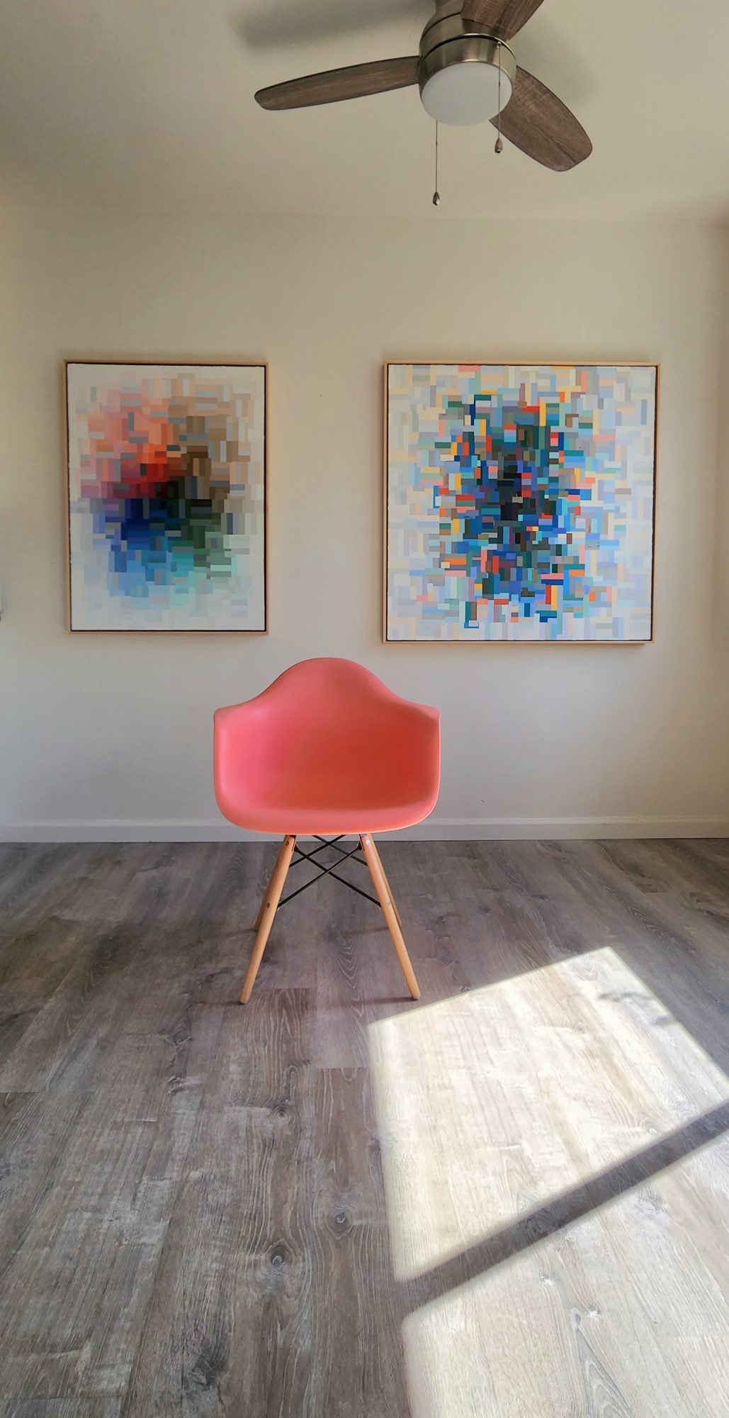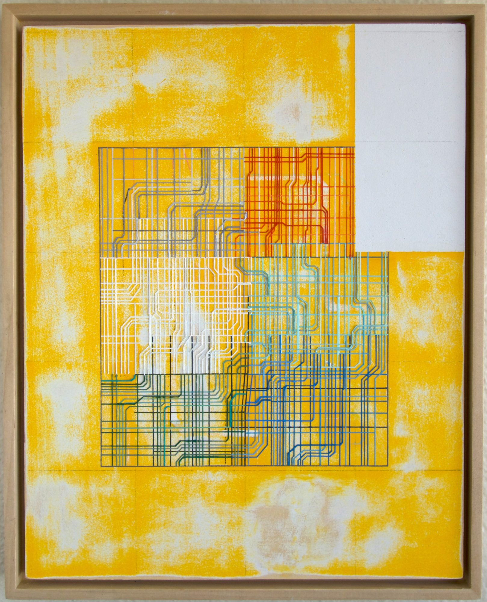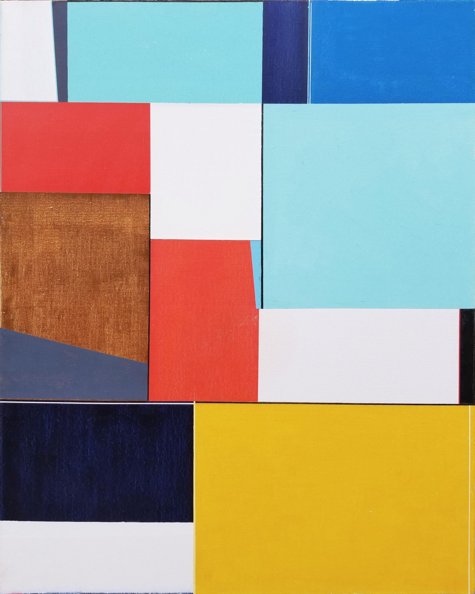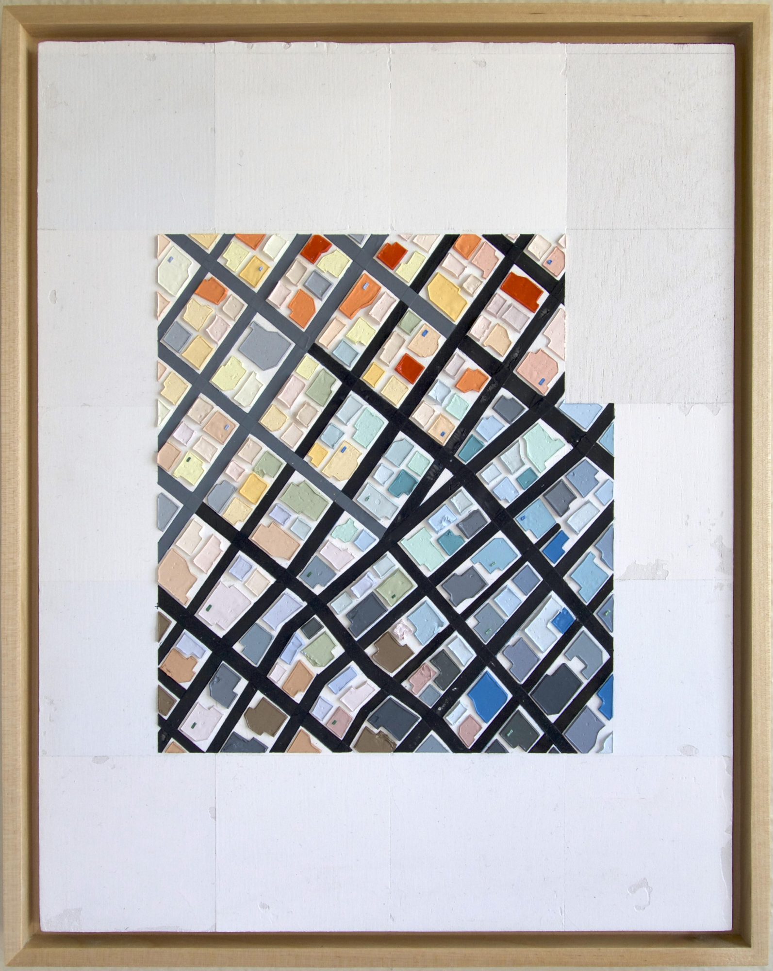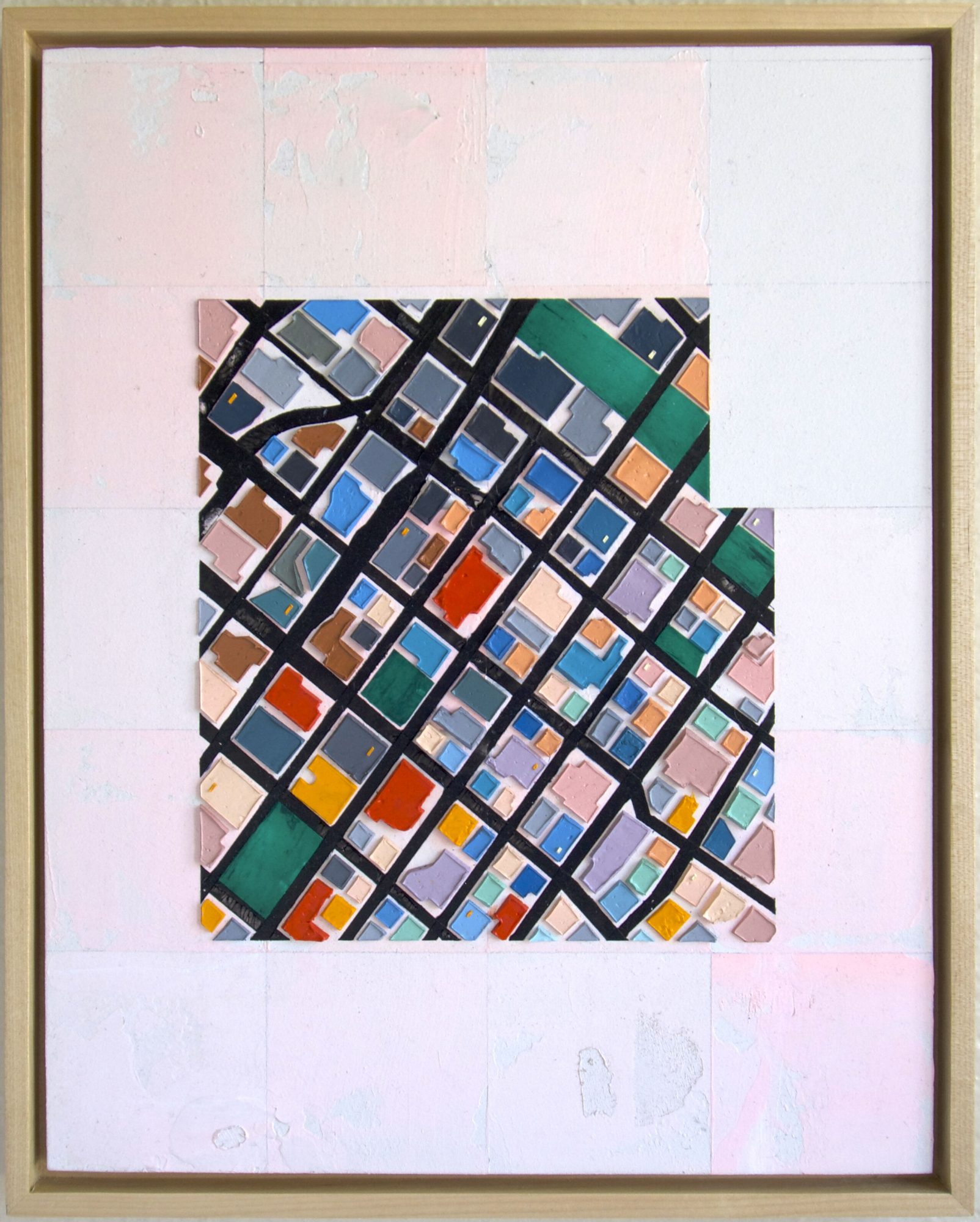 Hi Voyage LA, my name is Justin N. Kim and I paint contemporary abstracts and map paintings with my palette knife. I was introduced to drawing as an extracurricular activity in Korea. Which I continued to do even after my family moved to the States in the year 2000. I kept drawing and I got really good at it and thought I would draw for a living. It was in college when I was introduced to painting. This encounter changed my life. I was dealing with not only new material and rules but also color. It was challenging but I was fascinated by oil paint. Then I saw an abstract painting in a tv show called Mad Men and that opened doors for my painting trajectory. I enjoyed exploring the unknown and creating something out of nothing, but I didn’t enjoy the brushstrokes and the hand in the paintings. One night in an empty classroom, I found a palette knife that was left behind and started to use that as my main painting device. I really enjoyed the smooth paint that’s applied rather than paint that’s painted on with brushstrokes. I tried to master clean lines and my application, which took a lot of work. But I was getting good at it. Then I discovered tape and how taping provided a clean look, this neat look that I was going for, and allowed me to save a lot of time working. This combination has been my preferred choice since then. I continue to make work this way and I will probably keep doing it this way.