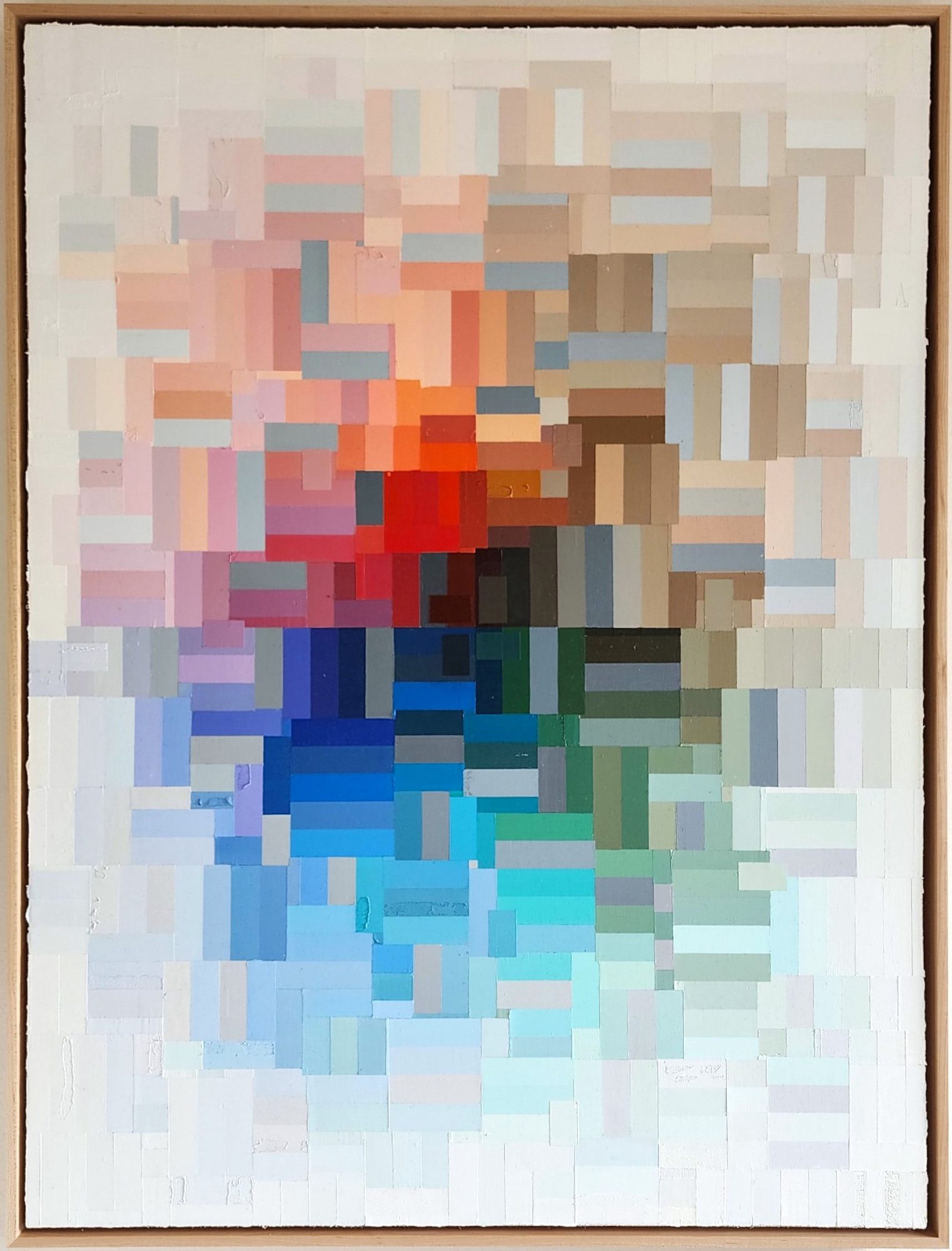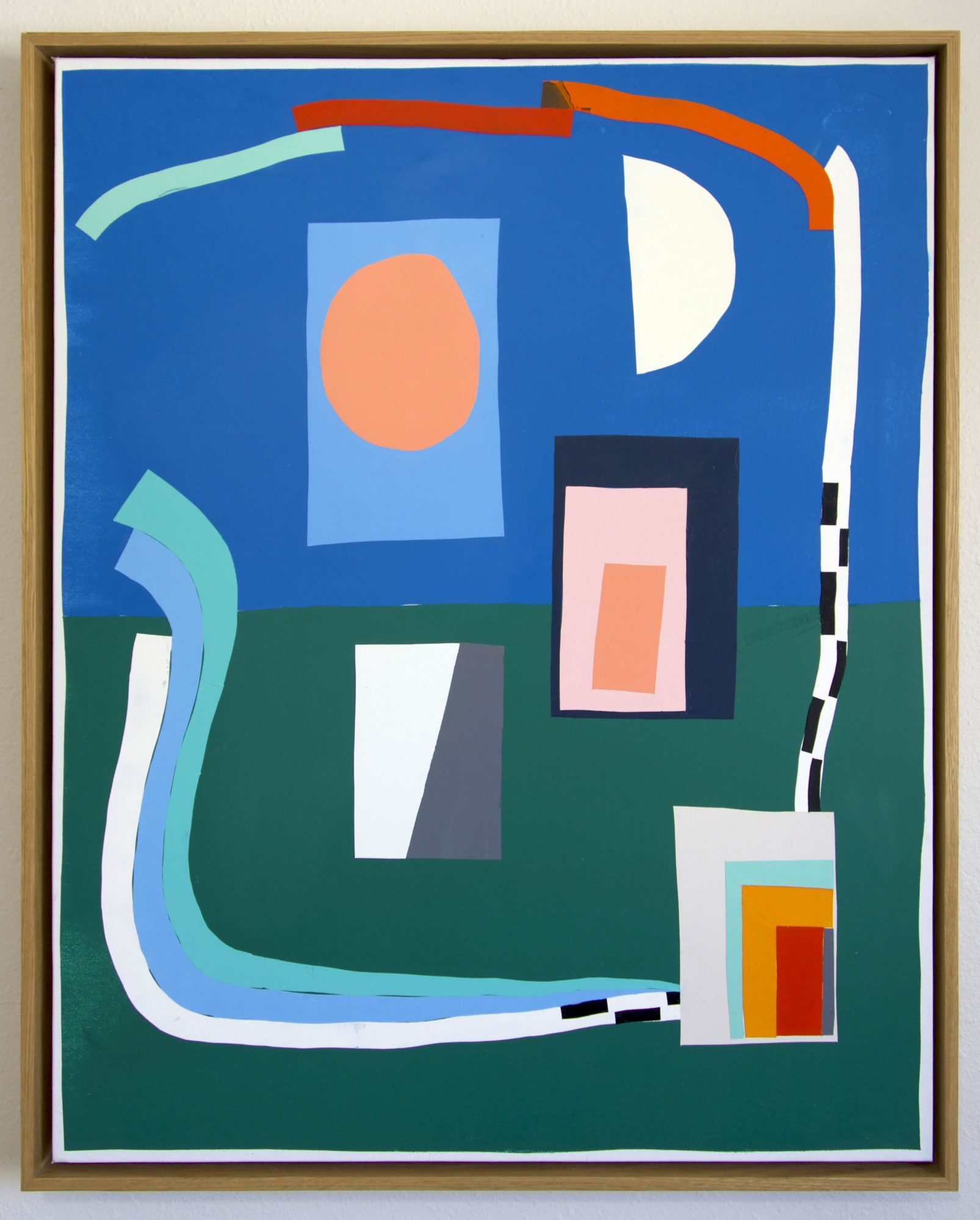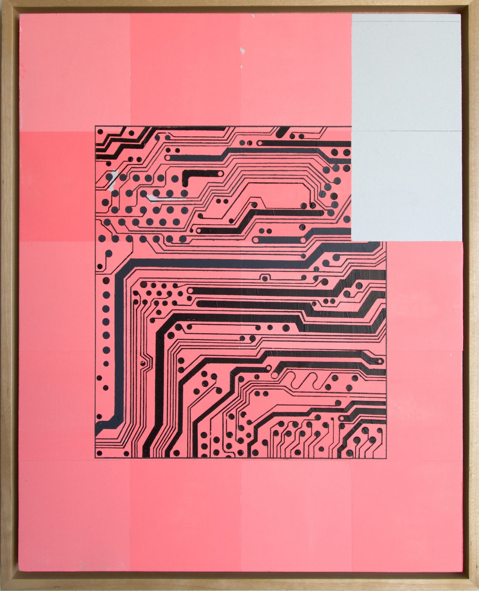 My work varies in appearance because I work in multiple series of work at the same time. Still, I believe they are all coming from the same source, which is people, connection, and interconnection. I work in hard-edge abstract style using rolls and rolls of masking tape and multiple blades to screed the oil paint to apply paint onto the surface. I don’t work with brushes to paint because I didn’t get into seeing the brushstrokes when I was learning to paint. I’ve come to appreciate seeing the brushstrokes in paintings, but I still don’t use them because I prefer the smoothly painted painting and the process is very soothing and fits well with my personality. There are definitely moments where I am hindered by my own process, but I enjoy the challenges even to this day, they keep me grounded. They also remind me that you can’t create something without having a dark side or without going through some obstacles to get there. I keep replaying this saying that somebody said in grad school “you can’t spell painting without pain.”