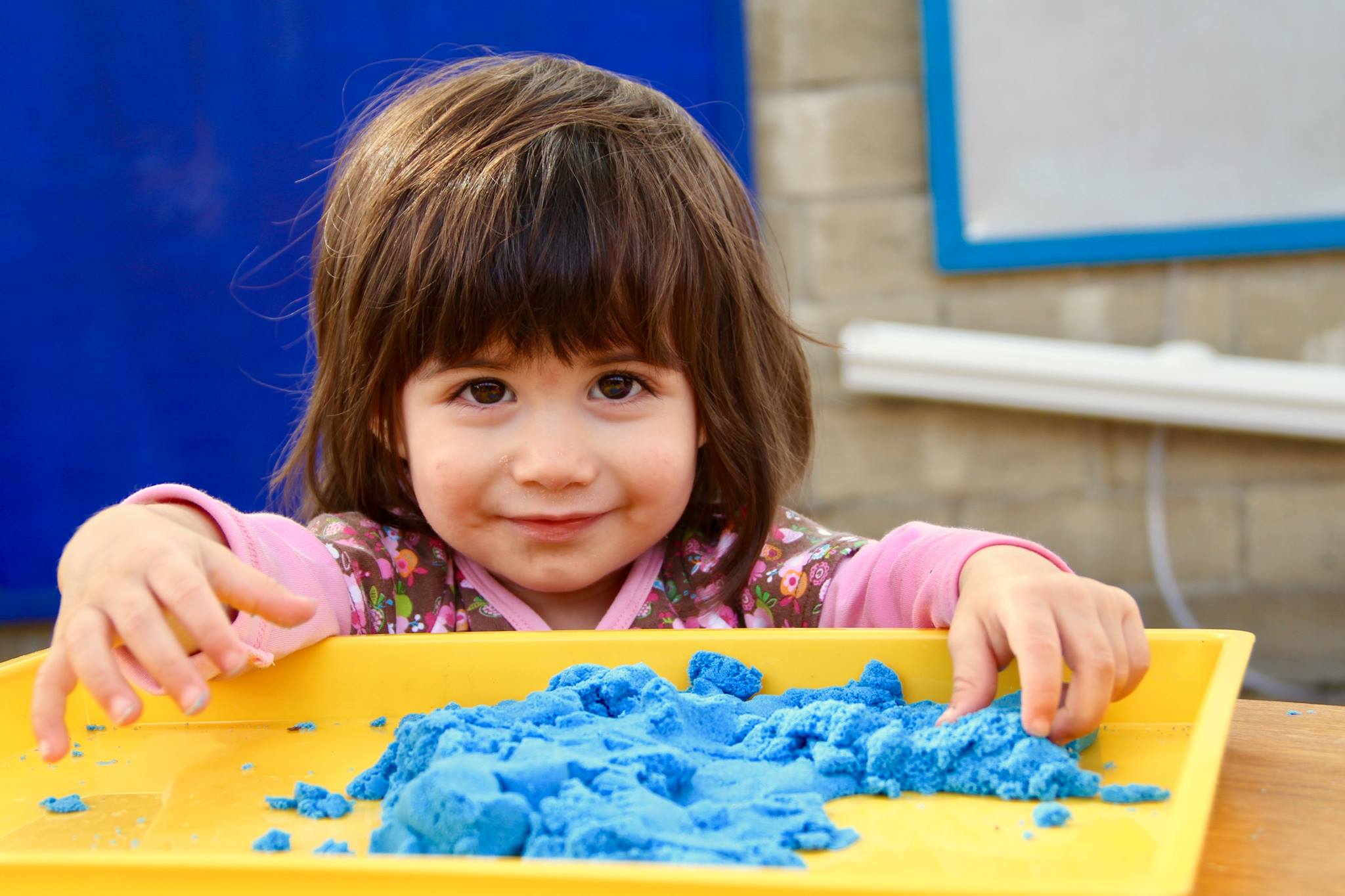 Young girl smiling and reaching under a table, wearing a blue shirt with a cartoon character.