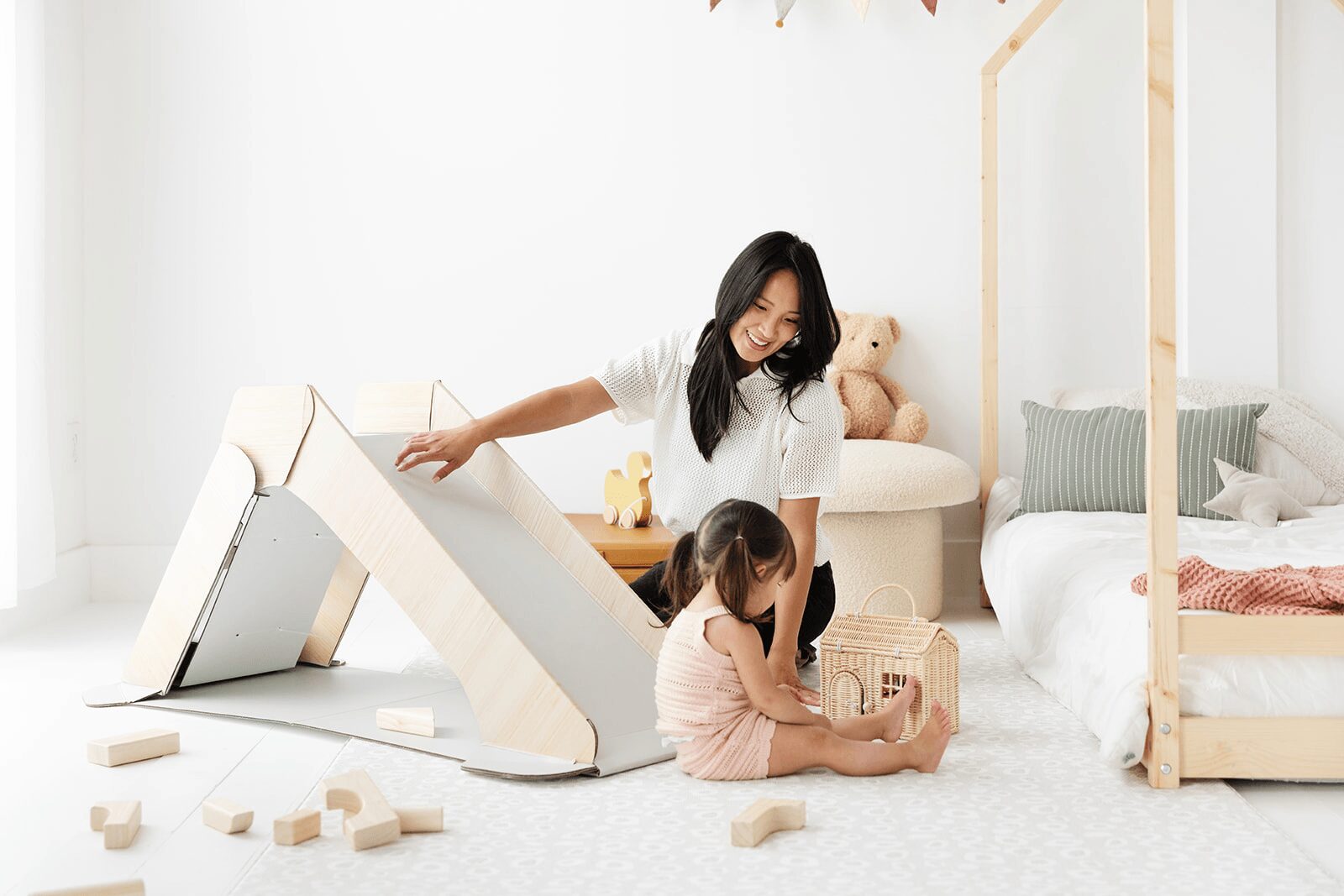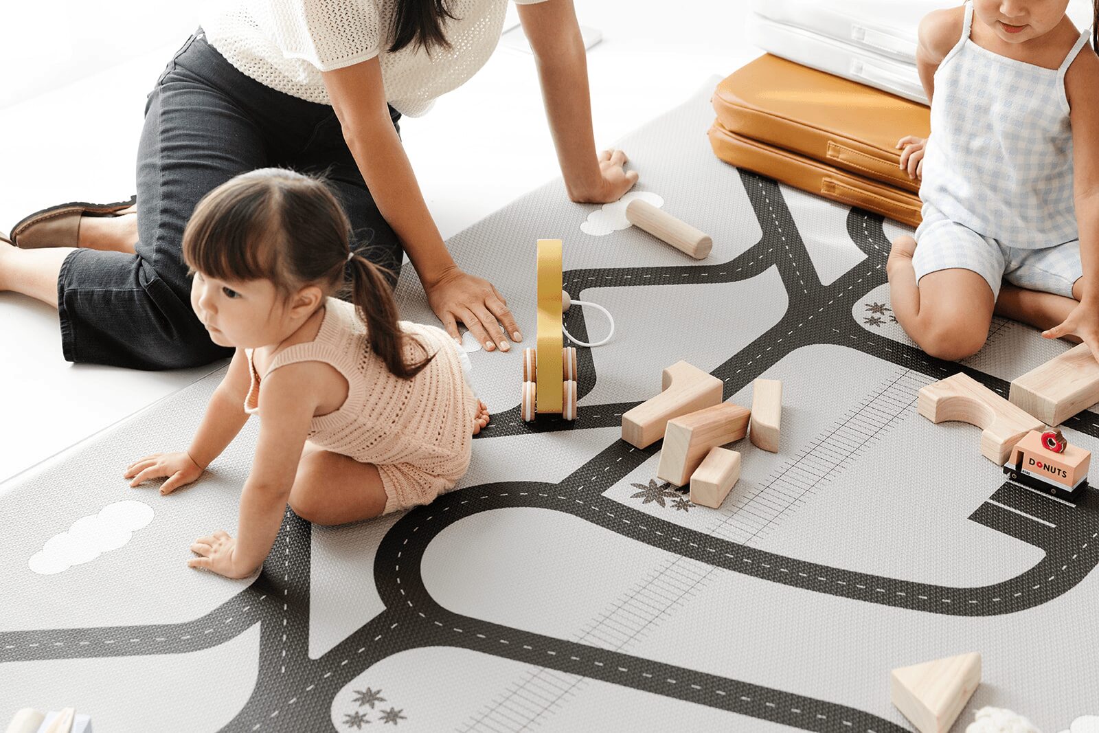 I am originally from New Jersey and moved to Los Angeles as an Interior Designer about 15 years ago. When I became a new mom in Santa Monica, we lived in a small city apartment, my son’s nursery was also our home office and guest room, so we had to be selective with every item we chose. I assumed that we would have to use a bright, busy play mat or worse…foam tiles. In addition, we found that those products don’t actually provide much cushion, they are easy to pull apart by little ones, and they collect crumbs, dirt, and liquid in the cracks.