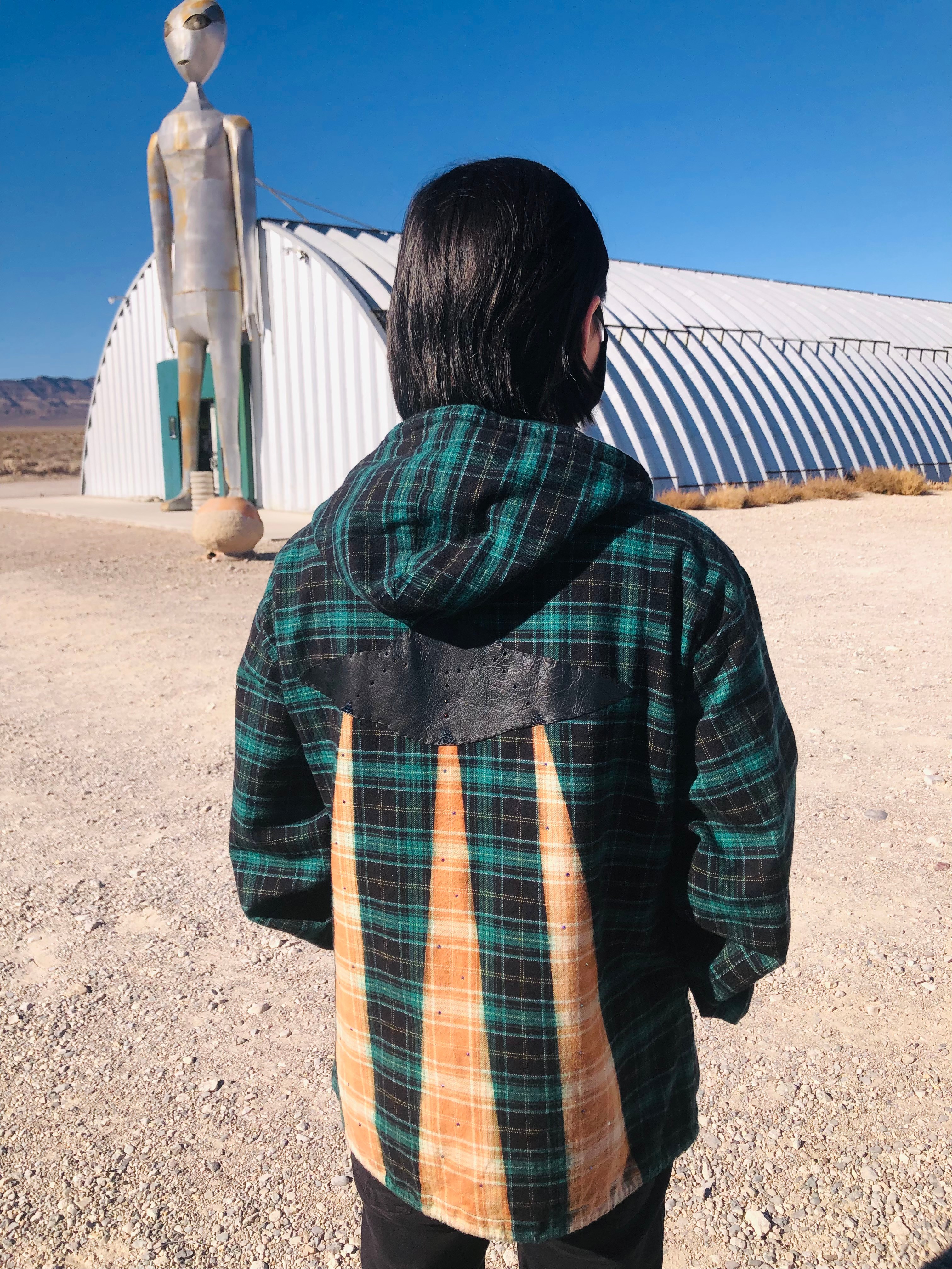 S-H-E-N is known for sustainability and hand-crafted heirloom statement pieces. As the creative director, I am inspired by epic stories such as extraterrestrial encounters, global climate change, and the beauty of religious belief. We source our flannel shirts, denim jackets, and leather for patches in Hollywood vintage shops, creating a very small carbon footprint. At the same time, we hand-embellish these pieces to a luxury standard. Our intention is for the pieces to embody slow, classic fashion that will be passed on for generations to come. I am proud of this entire process, end-to-end.