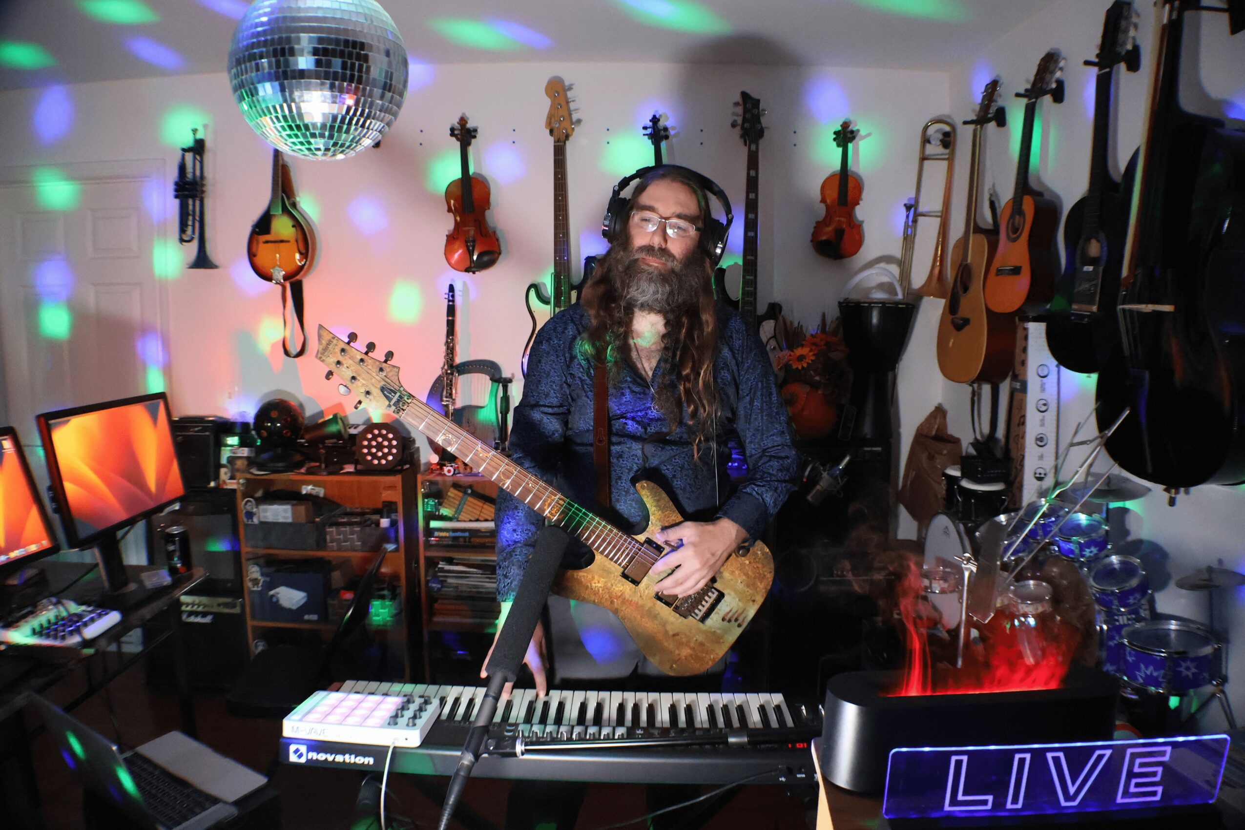 I started off learning trombone long ago in elementary school. I loved playing music and I taught myself bass guitar to jam with a friend later in high school. After clashing with my band director I went on to take some voice lessons and sang in choir. After that life got busy. School and work took up most of my time. My love for music grew hearing all sorts of new types of genres and sounds. Like many others- listening to music refueled me, and was there to support my ups and downs in life. Slowly, life got so hectic that listening to music was not enough to soothe my soul, I had a need to create. At that time I thought that the violin was a voice that could mirror my own, so I bought my myself a serviceable violin and taught myself to the best of my abilities. At the time I was working on an ambulance and I practiced in various abandoned parking lots in Los Angeles at night between runs. I wanted to share my music, but I did not feel what I played was anything special. A neighbor sold me an acoustic guitar, and then my cousin brought my old bass guitar and trombone from my parents basement back to me. I saved up a bit more and bought an electric violin as I thought it would be easier to perform for an audience, and I thought it sounded cool. Life slowed down a bit and I thought of how I could share my music and I taught myself how to record, but I was not sure how to write a song. I have many single riffs still saved from those early days that I did not know how to integrate into anything more. My desire to perform got stronger, but it was hard to find time, I started to collect more and more instruments, thinking the next one would get me to practice more and write, or inspire me at least. Finally I had so much gear that I would either have to use it, or get rid of it. I gave myself an ultimatum to release something on some platform. Not quite knowing much- I recorded a cover of “Spooky, Scary, Skeletons” for Halloween. I was not humiliated with the experience and I have heard worse, so I started on my first original song, “Power and Fable”. For the first time I felt heard, but it was a very slow process to write music and release it. I was not sure how to keep up the momentum. I released a few others, “Lava Burn” and “Magic Invite”, and then I made a Christmas medley, but I started rushing to get material out only for the production quality to drop. I had fun making music videos and releasing my music on all the streaming platforms, but it was a lot of work to release one thing and then I had to start over again. Telling myself that each new song would be fulfilling and getting excited to share it with the world was not enough, it took me months to barely cobble together a new song. Then not long ago, a friend gave me a piano keyboard, and I bought a professional camera to help with social media. Soon after, I discovered the musical community on Twitch. Performers do all sorts of things, perform covers, jam, and chat. I took some time to get myself acquainted with all the software, and joined in. This was the key for me, it gets me to practice, and write new material. I have improved my song writing craft and recoding skills in bounds.