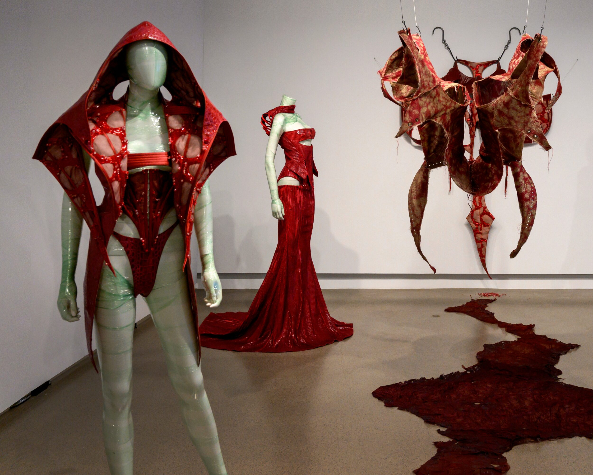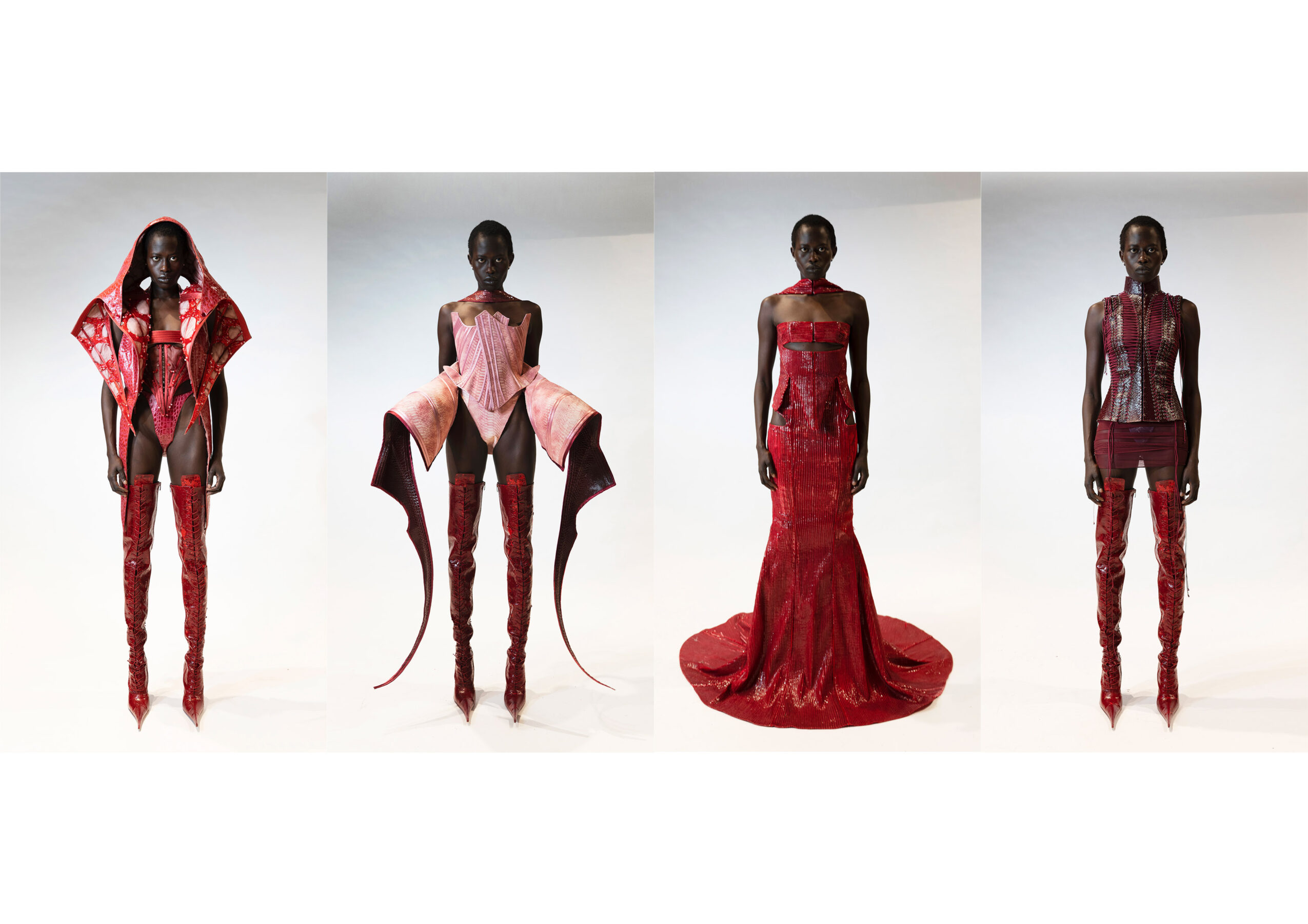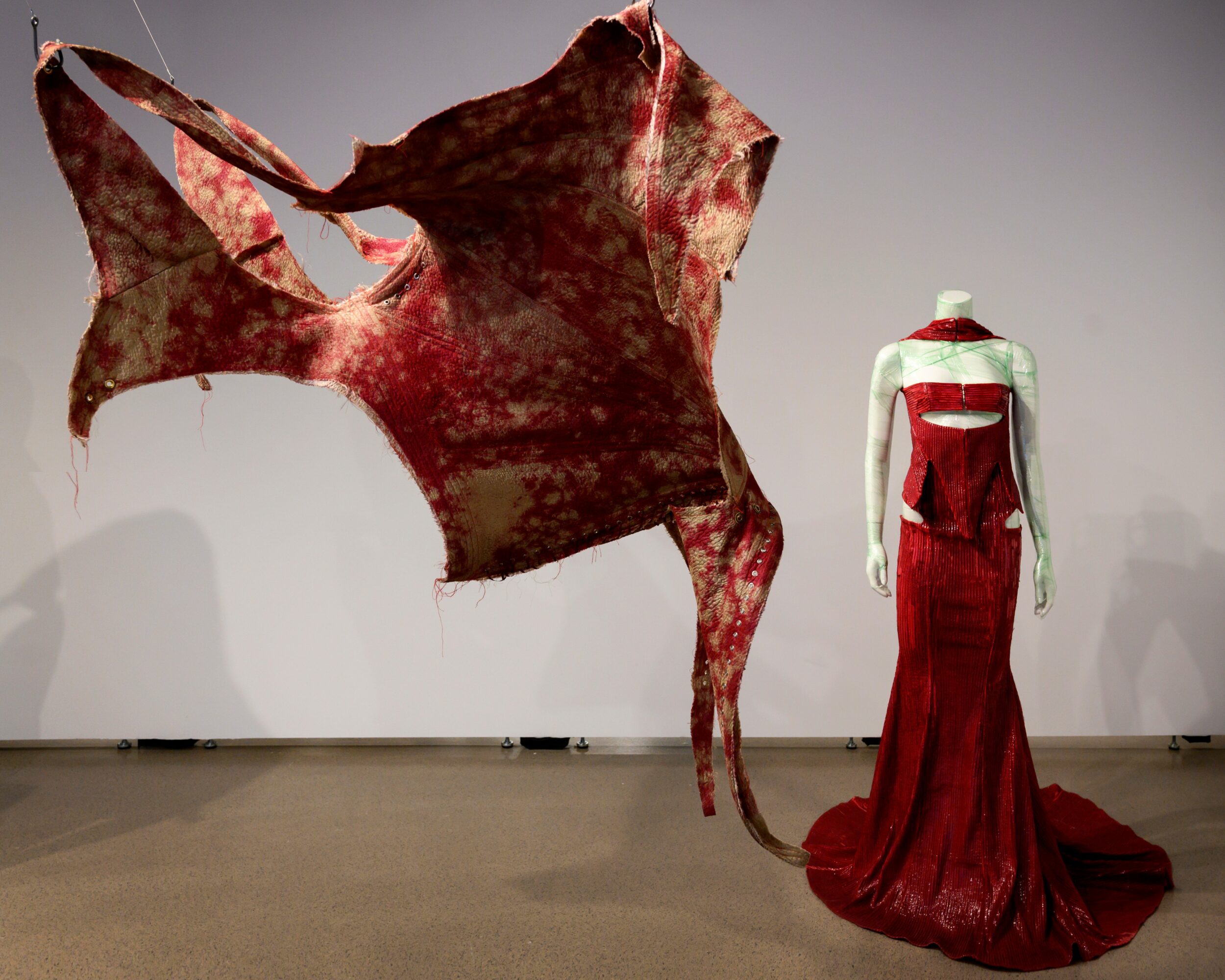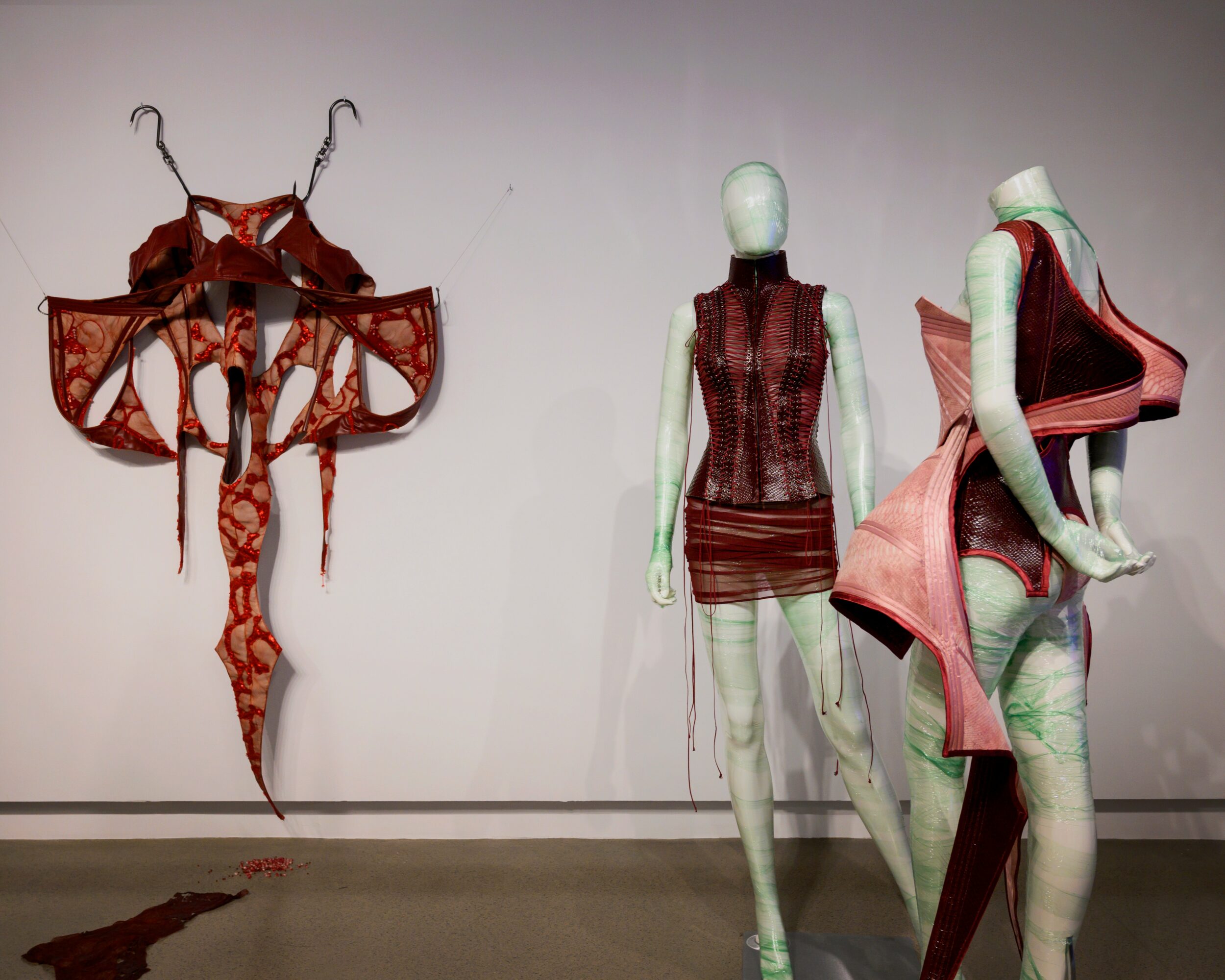 What sets me apart is that my work isn’t just about aesthetics—it’s about storytelling. I use fashion as a medium to provoke conversations about deeper, often uncomfortable themes like power dynamics, societal anxiety, and gendered violence. My designs are sculptural, and I often present them alongside sculptural elements like meat hooks, creating a jarring contrast between beauty and brutality. I want people to not just see the clothes but feel the message behind them.