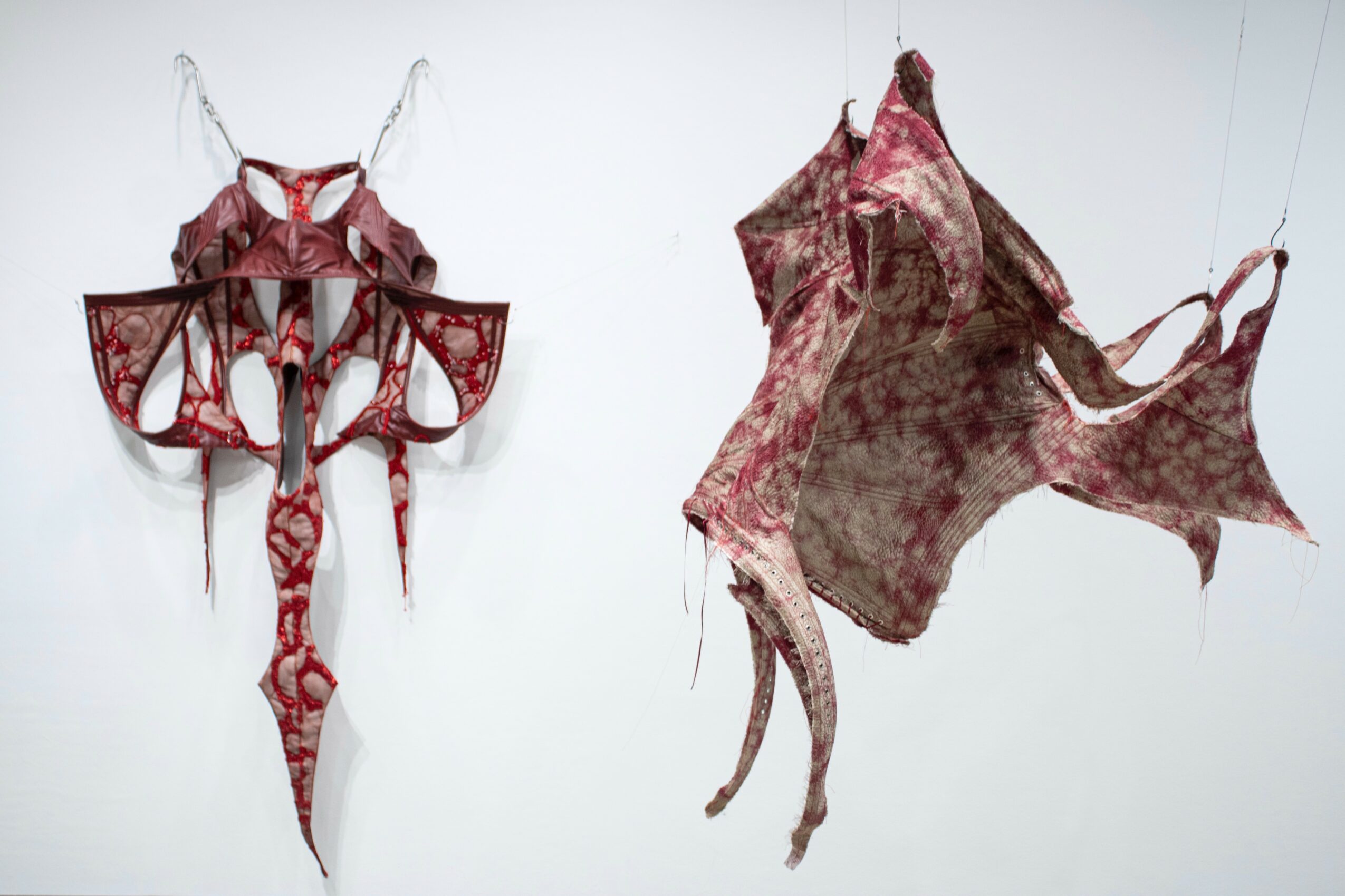 My work centers on exploring the psychological and societal pressures placed on the body, particularly the female form. I’m fascinated by how history and culture have distorted the image of femininity, and I express this through garments that blur the lines between fashion and art. A lot of my pieces draw inspiration from historical silhouettes like corsets and crinolines, but I deconstruct and reimagine them in ways that challenge conventional ideas of beauty. I use materials like leather, wool, and organza, often incorporating raw, visceral textures that mimic the harsh realities women face.