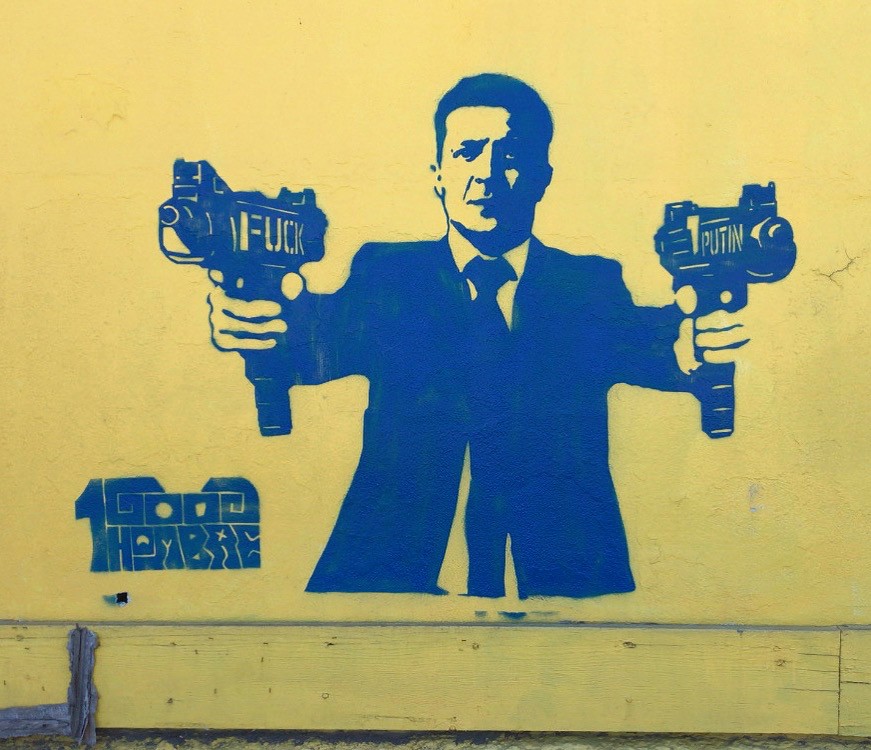 However, the pieces that I am most proud of, that were picked up by national and international press, including the Associated Press, Washington Post, Huffington Post, and more, and subsequently printed and shared around the world, were two pieces that I made in response to the war in Ukraine. The first piece I put up around LA was of President Zelenskey, in the blue and yellow colors of the Ukrainian flag, holding two Uzi’s with the words Fuck Putin written across them. This piece was photographed and published by Getty Images, the Kiev Post, and eventually, I gave an interview to the Associated Press which was published across the country and world.