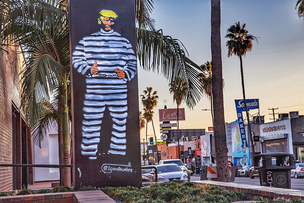 During the summer of 2020, my new public art was seen throughout Los Angeles, various cities and towns throughout California; San Diego, Santa Barbara, San Francisco, Napa, Humboldt County, and up through to Eugene, OR. The first recognizable piece I was putting up was a stencil of Donald Trump in a prison outfit. This piece was filmed and used in part three of the Kanye West’s Netflix docuseries.