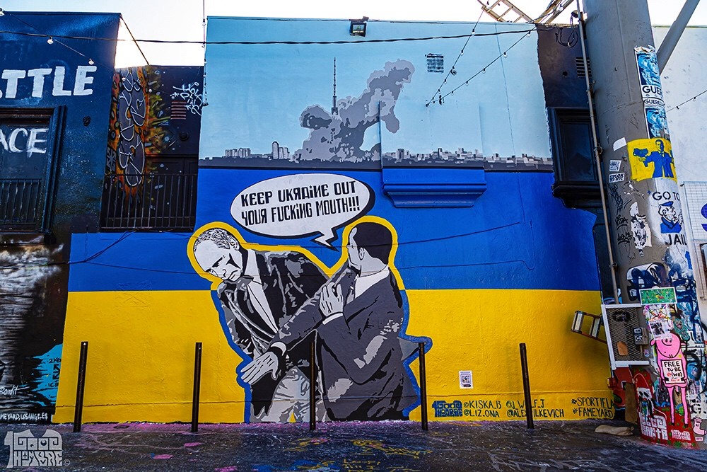 Having received mountains of press for that piece, I was offered the opportunity to paint a giant Ukraine-themed mural at the Fameyard on Melrose Ave. which is an iconic graffiti and mural space in the parking lot of Sportie LA. This opportunity came to me the week of the Will Smith Oscar slap, so I used that moment to create a mural portraying Will Smith slapping Vladimir Putin, with the words “Keep Ukraine Out Your Fucking Mouth!!!” This image was set over the Ukrainian Flag and sitting below a landscape view of Kiev on the day it was invaded, and their iconic radio tower was bombed. This piece was quickly picked up by Huffington Post and once again published by news organizations around the world.