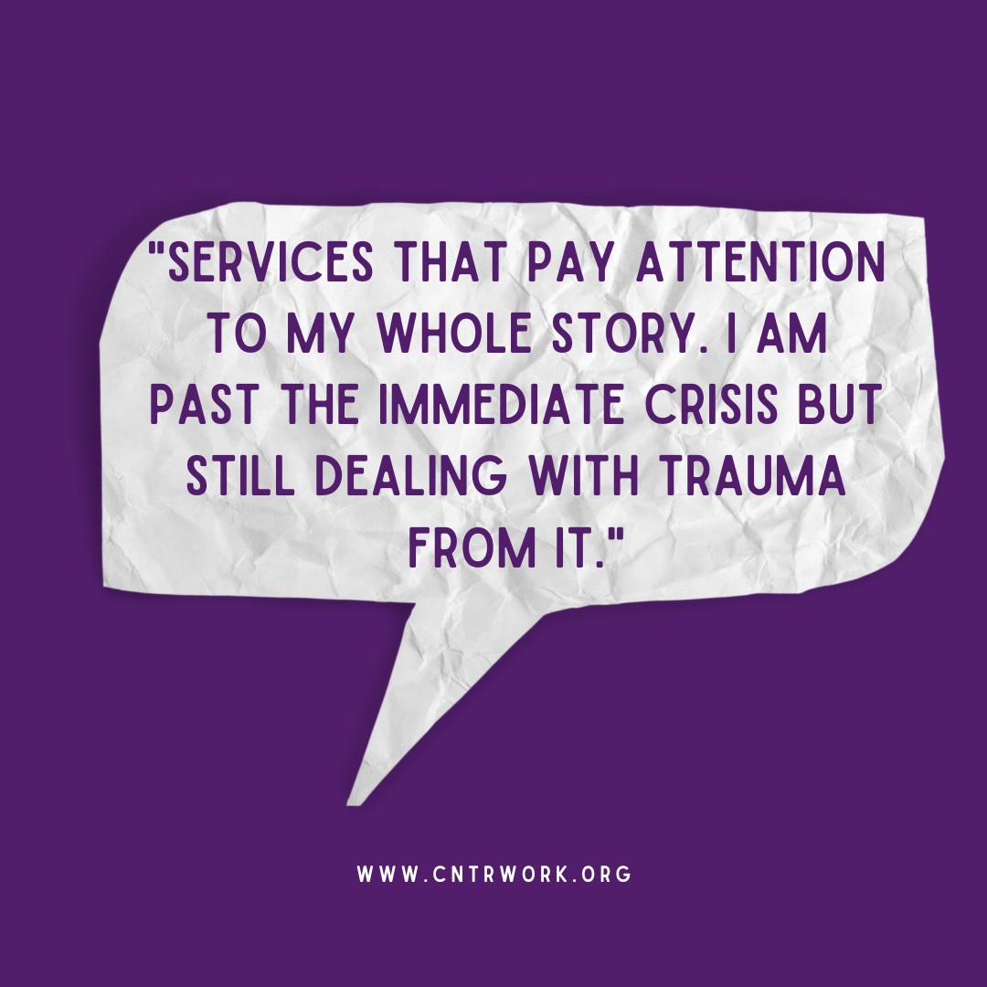 None of this has been smooth. As a survivor I received services from many different agencies, but after surviving the immediate trauma I was forced to try to reenter society and continue business as usual. Eventually, I decided to enter the DV field to gain some relevant professional experience and I began to see how crisis management was just that – managing crises but not ultimately changing the cycle. I saw the same thing again and again. Due to a lack of funding, people were receiving immediate crisis services and were then left to fend for themselves. Our current services cannot cover all the bases.