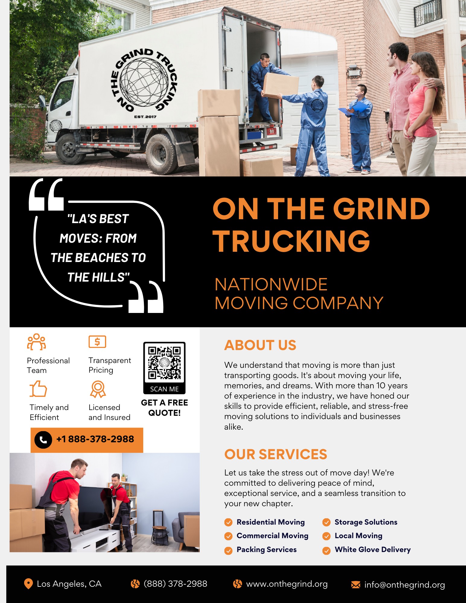 On The Grind Trucking is a premium moving company. We are proudly black-owned and operated, based in Southern California with a hub in Atlanta. We specialize in local and long-distance moves, handling everything from small apartment relocations to large corporate transfers, coast to coast. Our services extend beyond just moving; we offer storage solutions, packing services, and debris removal, ensuring a comprehensive package for our clients.