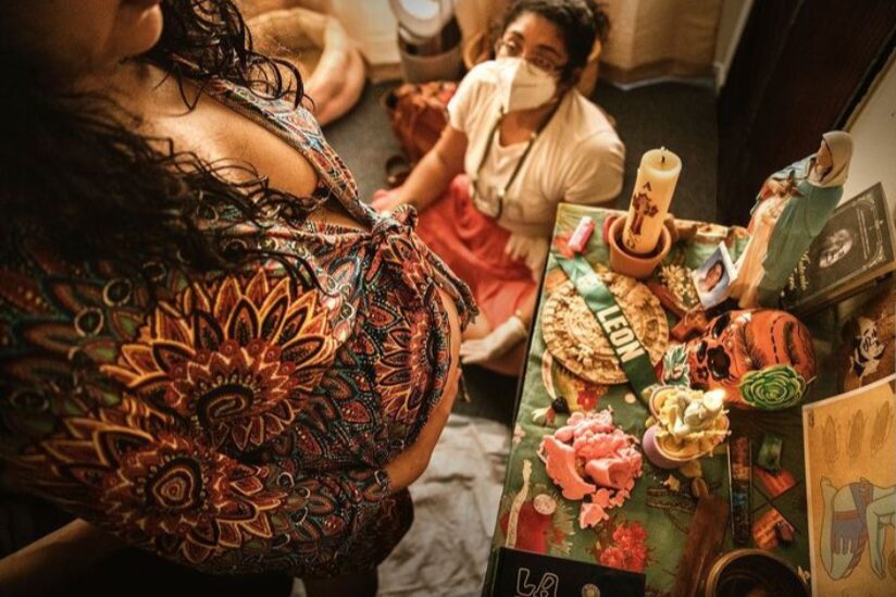 Imagine of pregnant mom in front of her altar, me kneeling on the floor looking up: Credit Karissa
