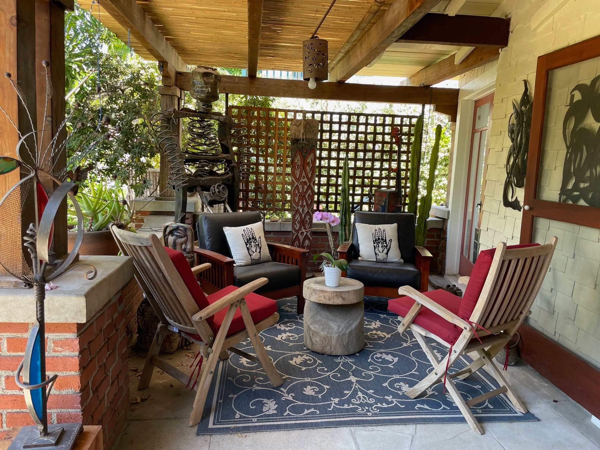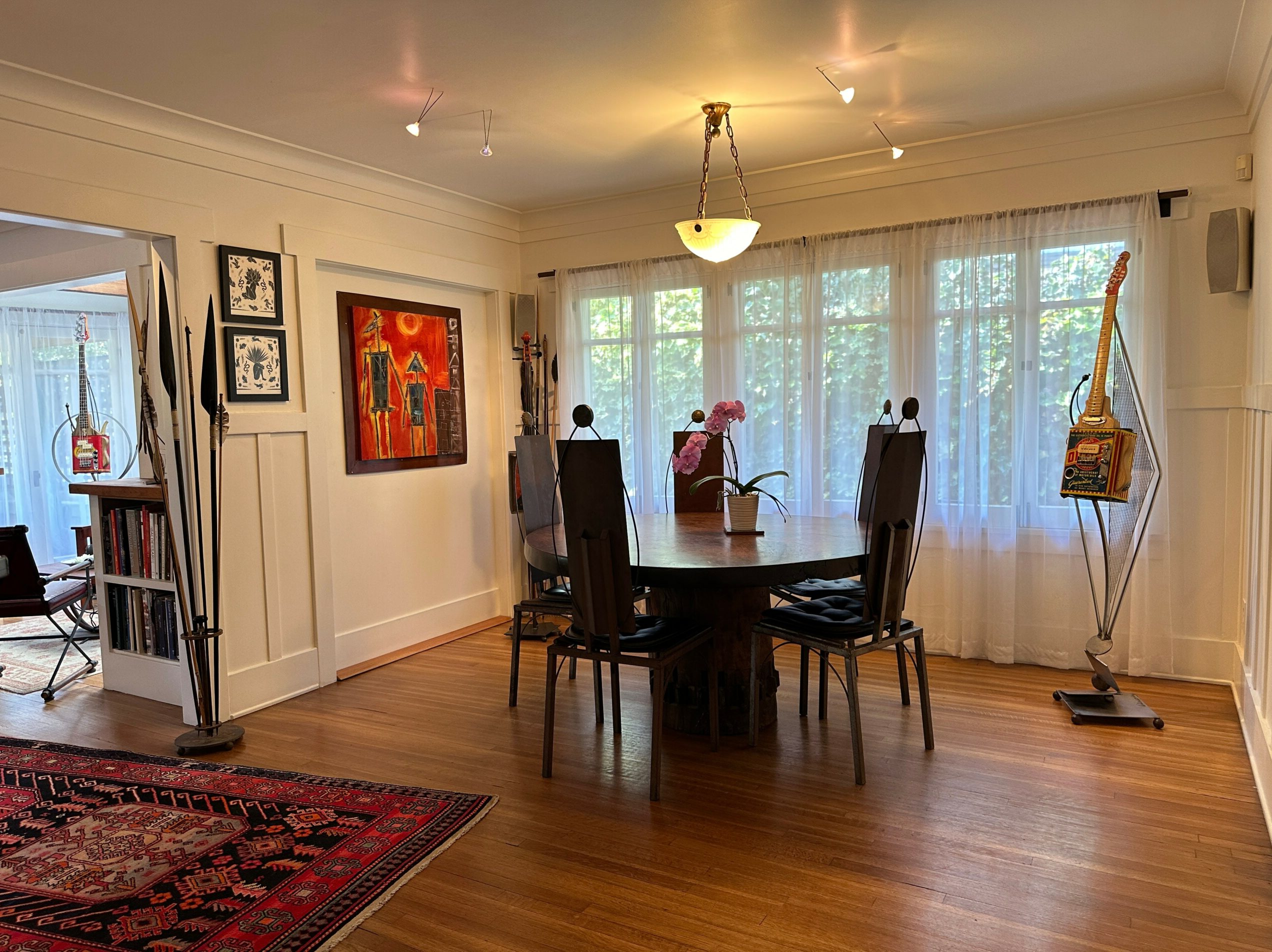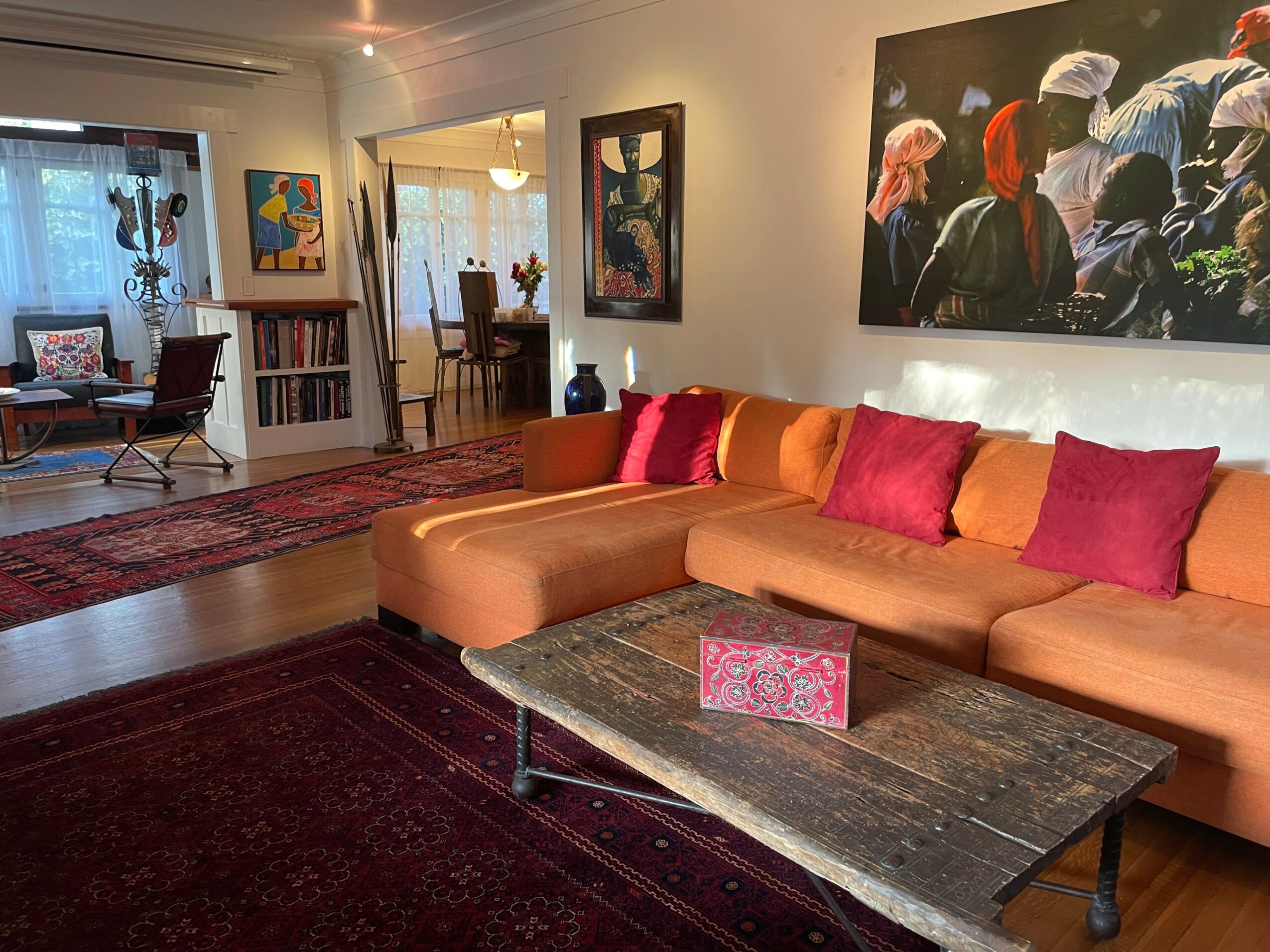 So off we went on our first buying trip. When we came back, we realized we had no lighting system, everything had to be framed, there was no mailing list, and we had no clue about how to operate an art gallery! So, we got to work figuring it all out, and within a couple of years, we had been written about in the Los Angeles Times, Vanity Fair magazine, Bon Appetit magazine, and featured in various television outlets. The gallery really took off. Today, although we are known for specializing in Haitian art, I think of us as a contemporary ethnic art gallery, which features works by artists of color from around the world. Our home has doubled as a private art gallery for 35 years (we’re open by appointment). It operates out of our Craftsman style house with two sculpture gardens. There is art everywhere.