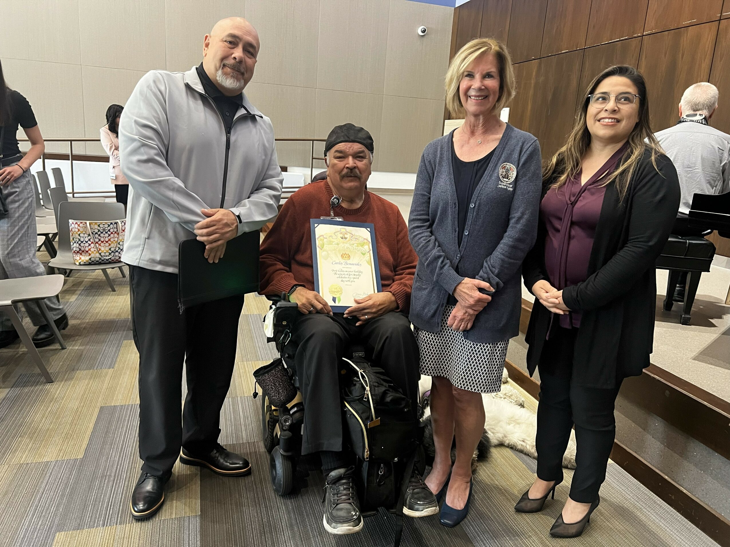 While I may not fit the traditional “professional” mold, I am a dedicated volunteer at Rancho Los Amigos, having contributed over 25,000 hours. I was honored by Supervisors, Janice Hahn, and the Rancho Administration with the naming of the Carlos Benavides Amphitheatre in my honor, a truly humbling experience. I am a passionate advocate, often attending meetings with my service dog, Vito, to champion positive change. Additionally, I am an artist.