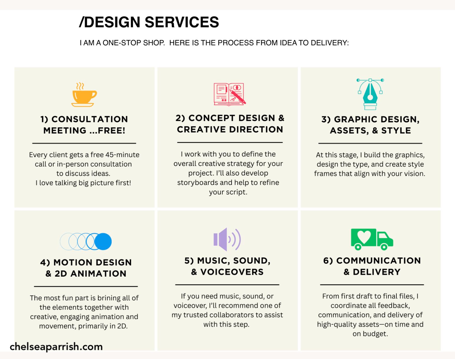 I offer a free one-hour consultation to anyone interested in discussing a project. Whether it’s over the phone, on a video call, or in person over coffee, I like to start by talking big-picture. Tell me about your business, your goals, your ideas—everything. From there, I’ll help you work backward to find the best way to bring it all to life through motion design and visuals.