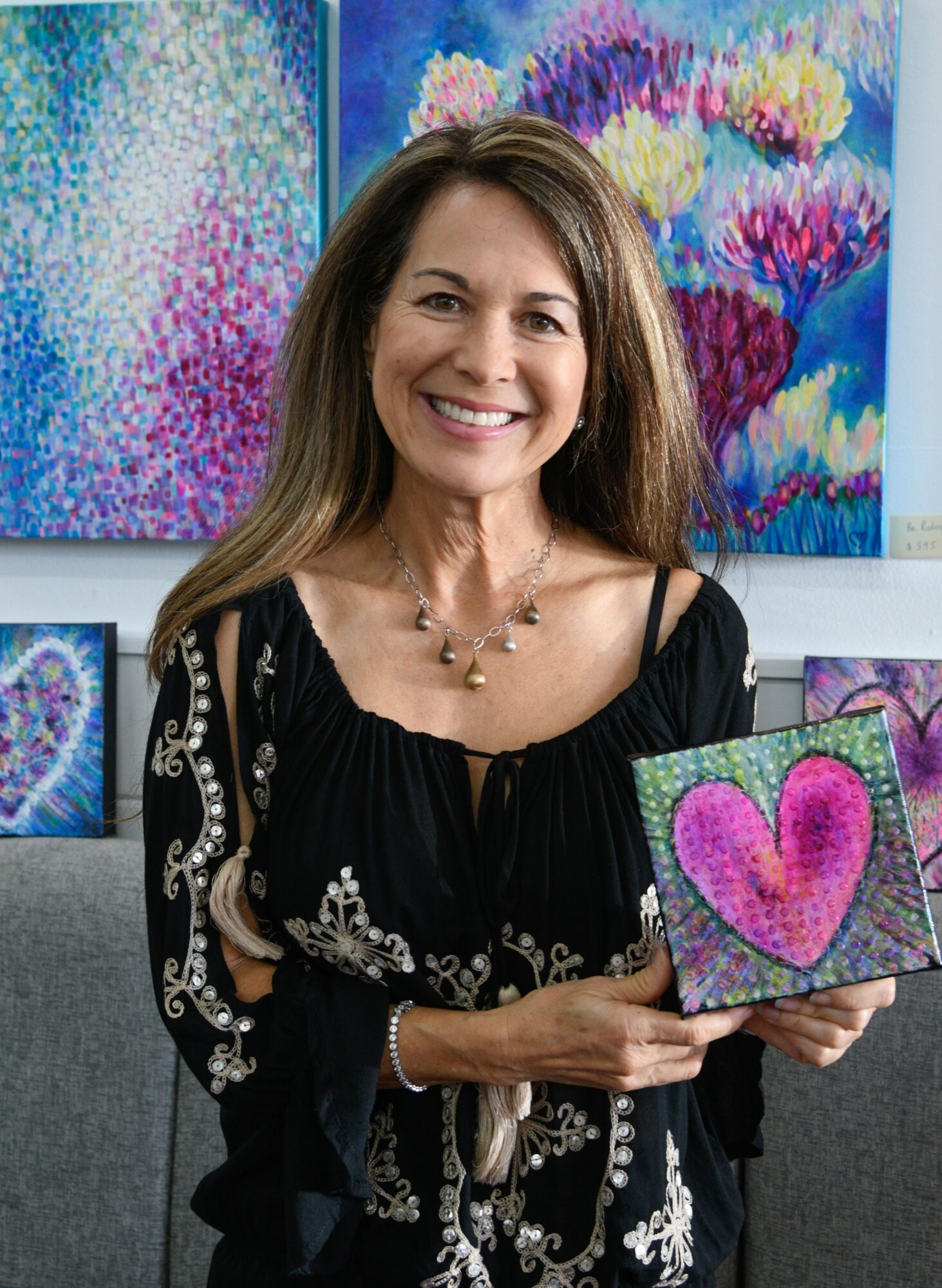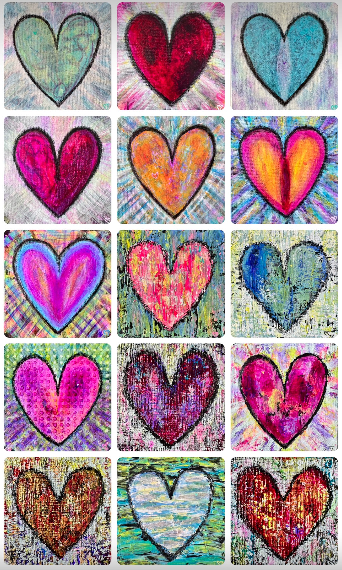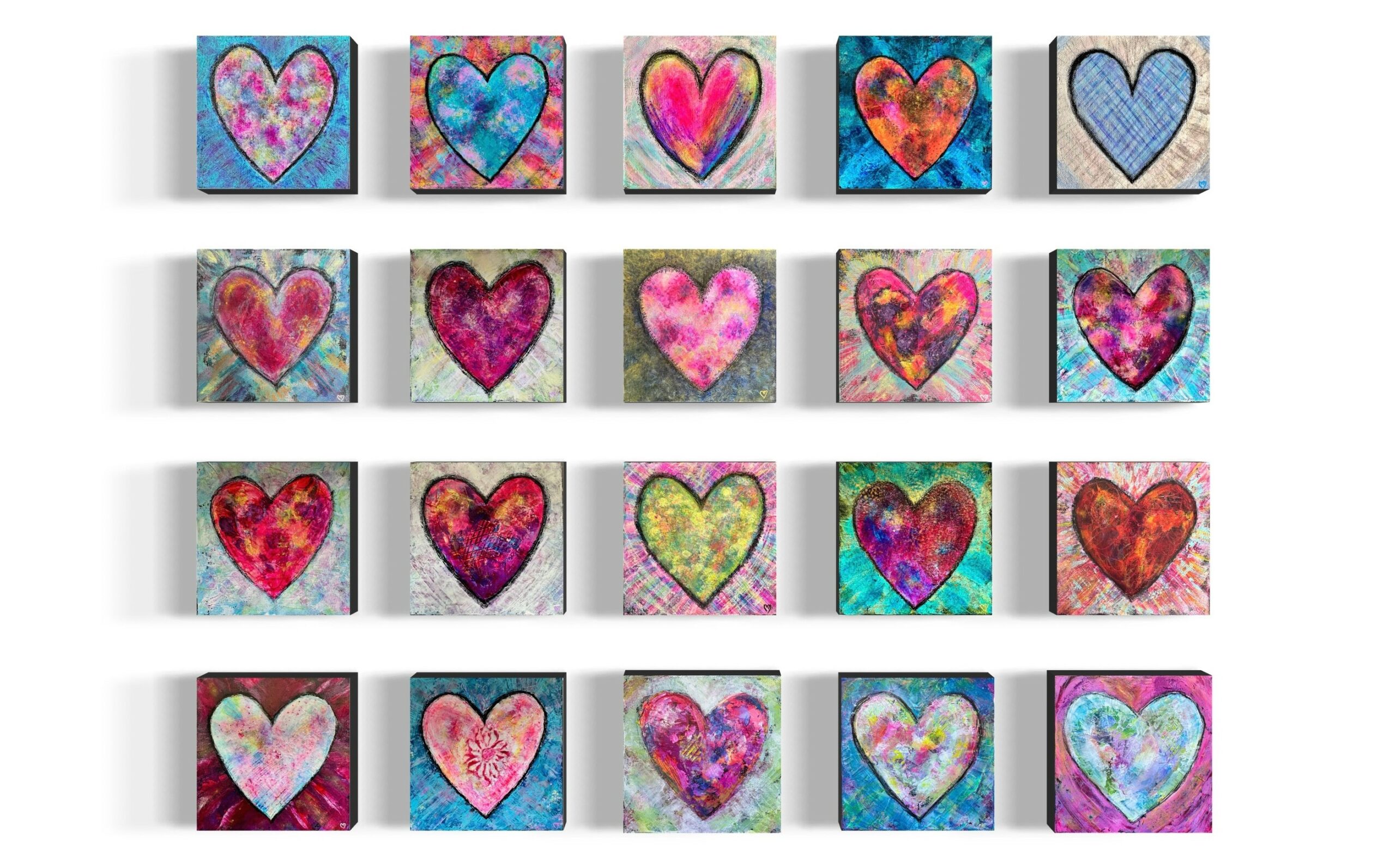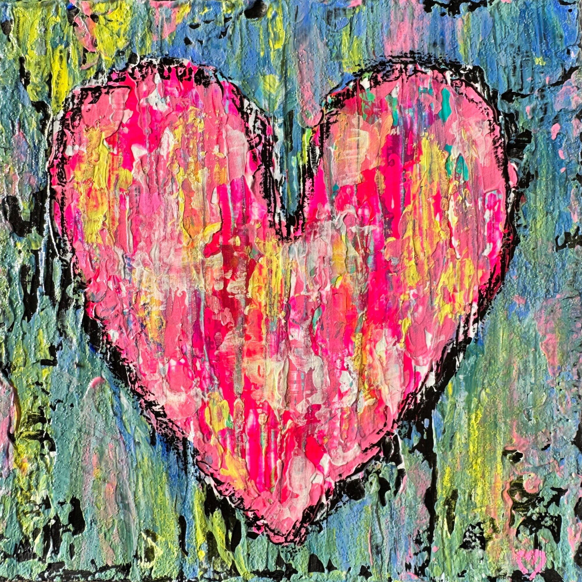 I’m best known for my Happy Heart Series, especially my small 6×6″ and 8×8″ pieces. Each one includes a hidden mini heart within the heart and a happy face on the side, adding a touch of fun and surprise. They can stand on their own or hang on the wall. These hearts symbolize love, positivity, and connection—reminders to find beauty in life’s little moments.