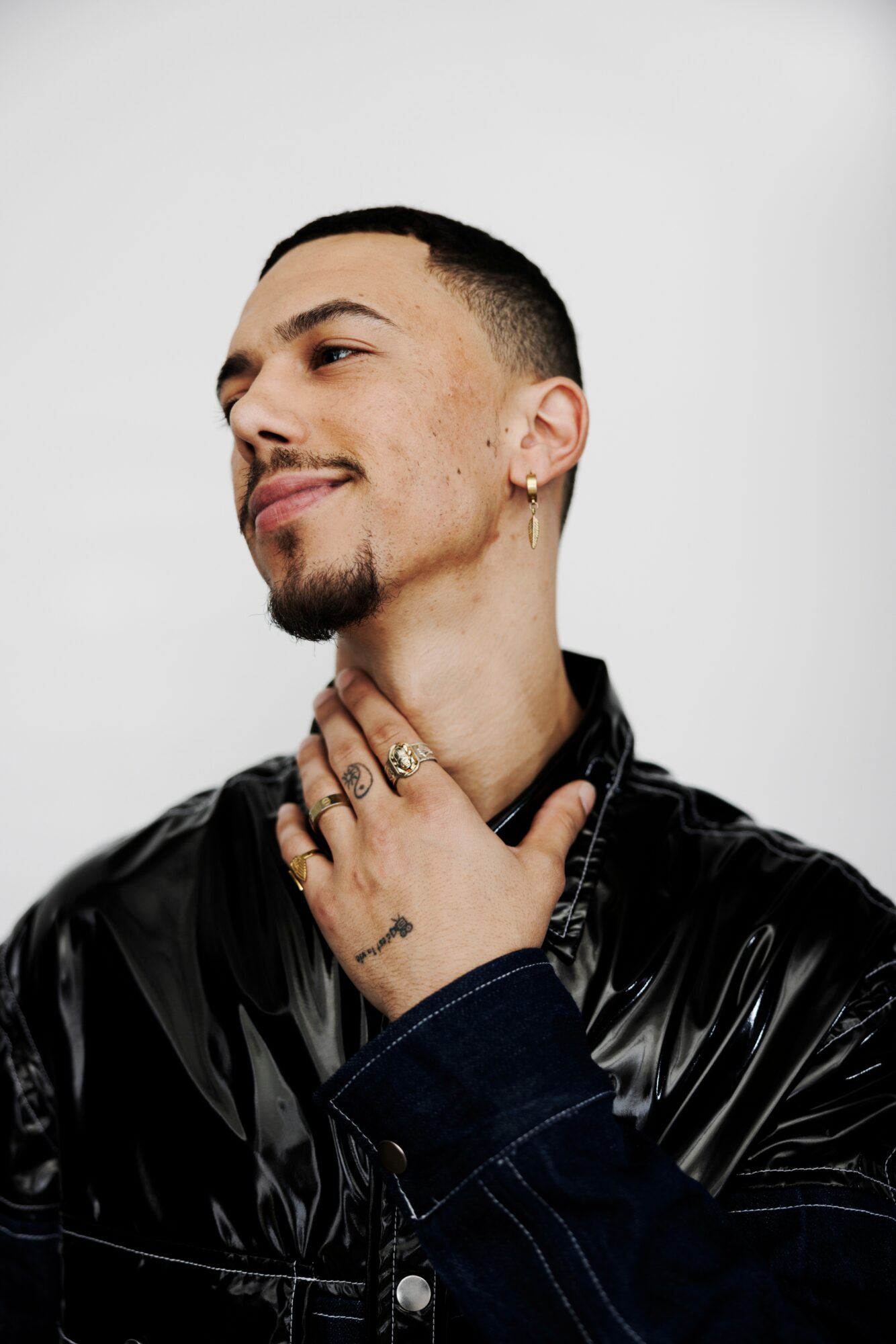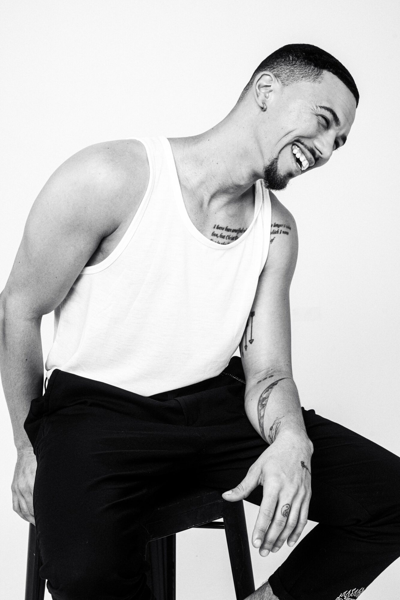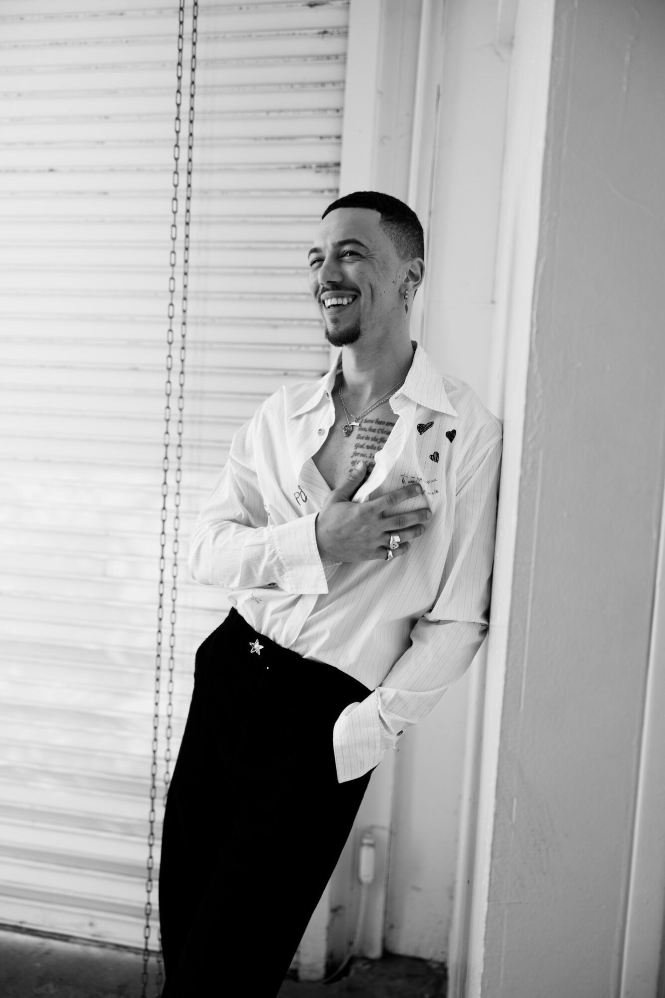 Black and white photo of me standing with a white dress shirt / close up with black jacket with my hand on my neck