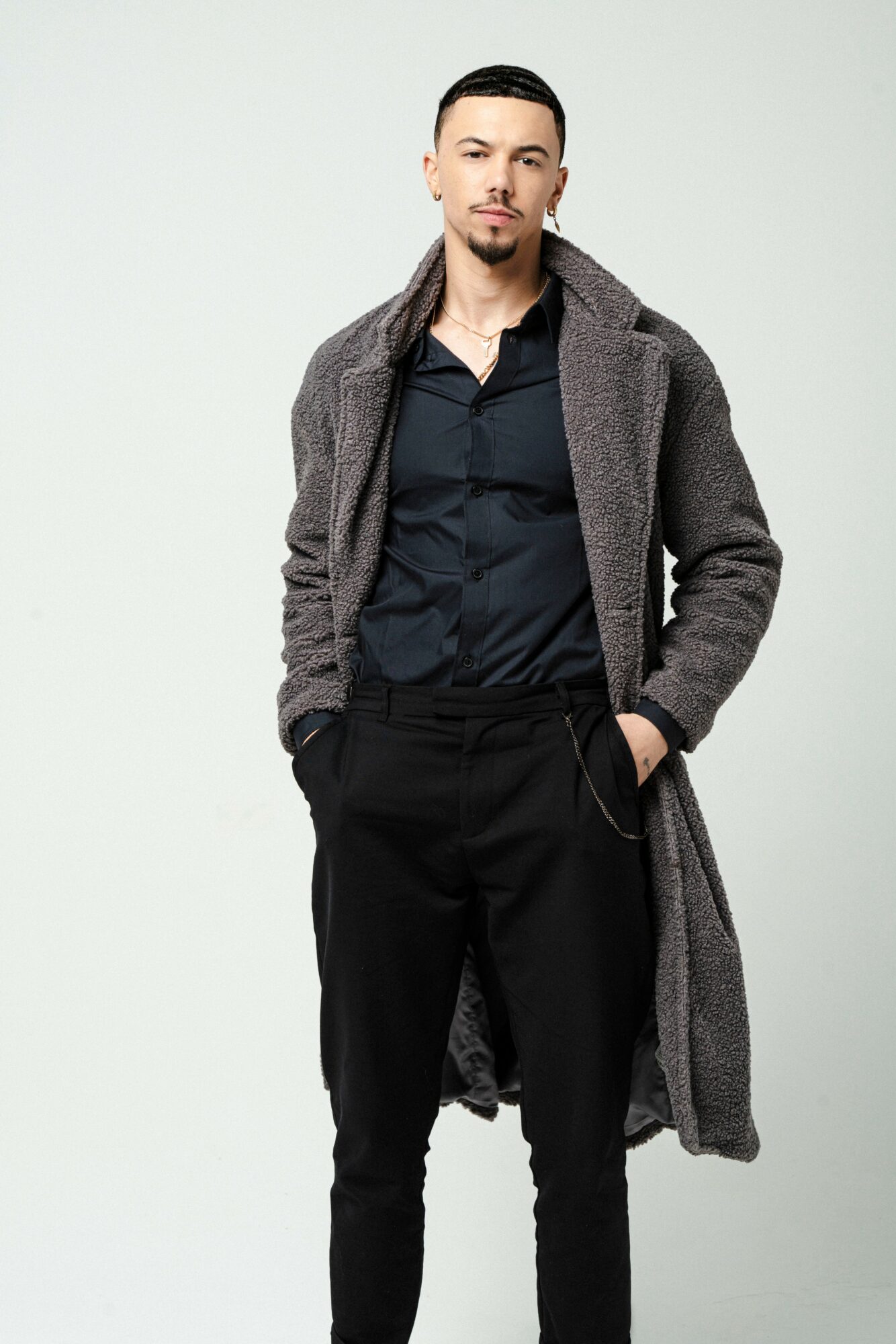 Photo in brown trench coat/black and white photo of me smiling on the stool