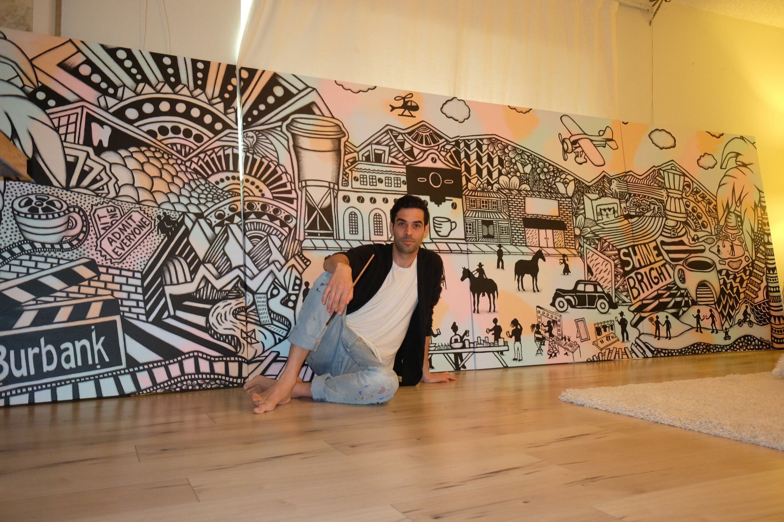 In those 20 years, I tasted the limelight through acting in various commercials for AT&T, Mercedes, Trojan, Miller Lite, and more, while also modeling for Apple, Volkswagen, Target, Sony, and more. I painted large-scale murals for Starbucks and different cities in LA while traveling to over 37 countries for months at a time and maintaining a steady job (the shoedesk)for 17 years at Lucky Strike Lanes Bowling Alley in Hollywood. That shoedesk job was always my anchor as the waves of an artistic career ebb and flow. It also provided me with some of my best friendships, and where I eventually met my wife.