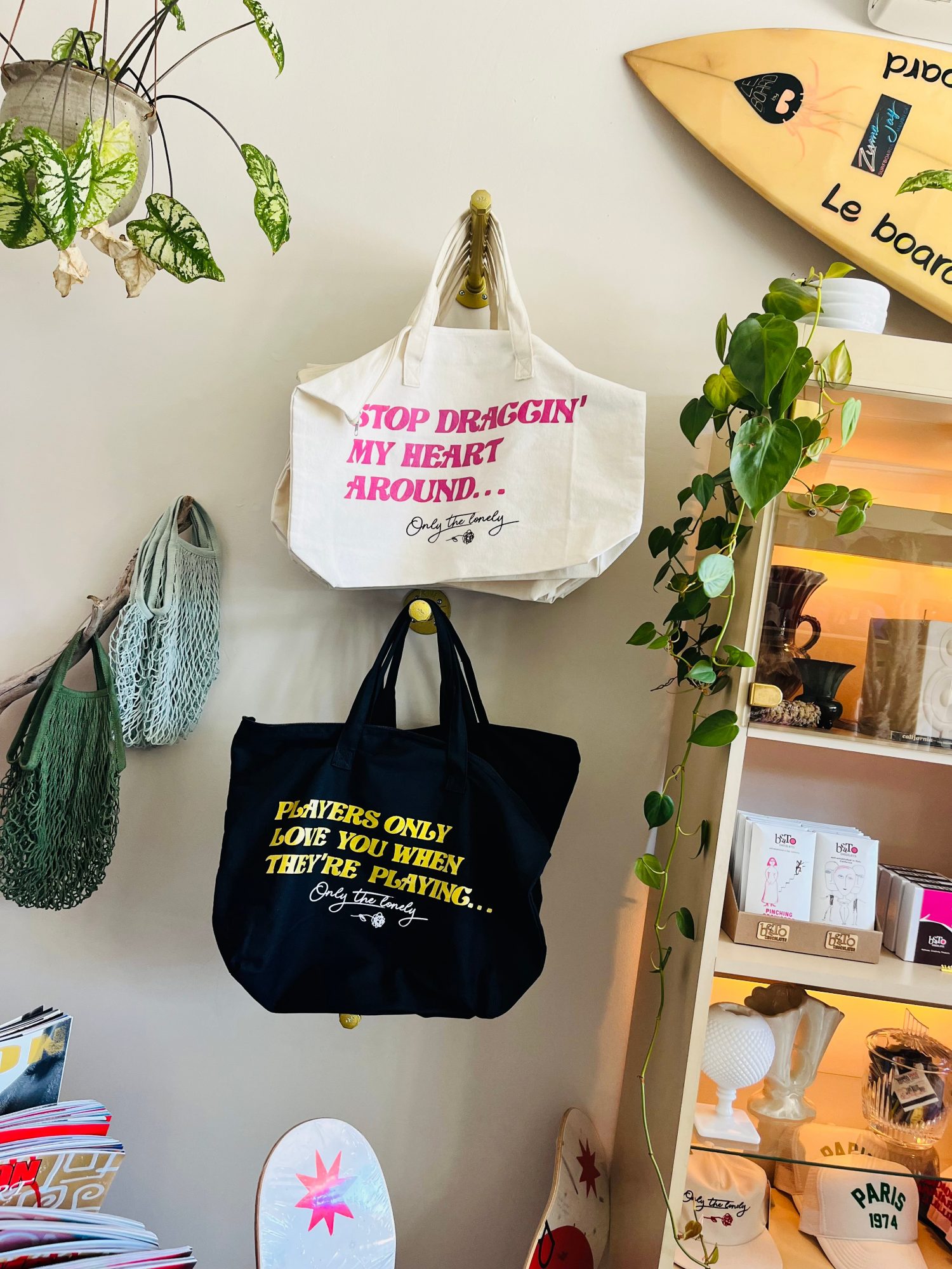 So my partner Bernard Denney and I were school parent friends for years, our lives fully came together though after covid, some life shifting and heartbreak. The universe brought together our common values & creative sensibilities in a really positive, meaningful way. With collective skill sets (Krisha-aesthetician, artist, stylist & mom to three boys…Bernard-chef, retail creative, screen printer & dad to 4), we knew we could have a lot of fun collaborating & showcasing our cool, fun, nostalgic style with the community. Today, we are so excited to be sharing our brand, Only the Lonely, a retail storefront full of general provisions & cozy apparel for all!!!
