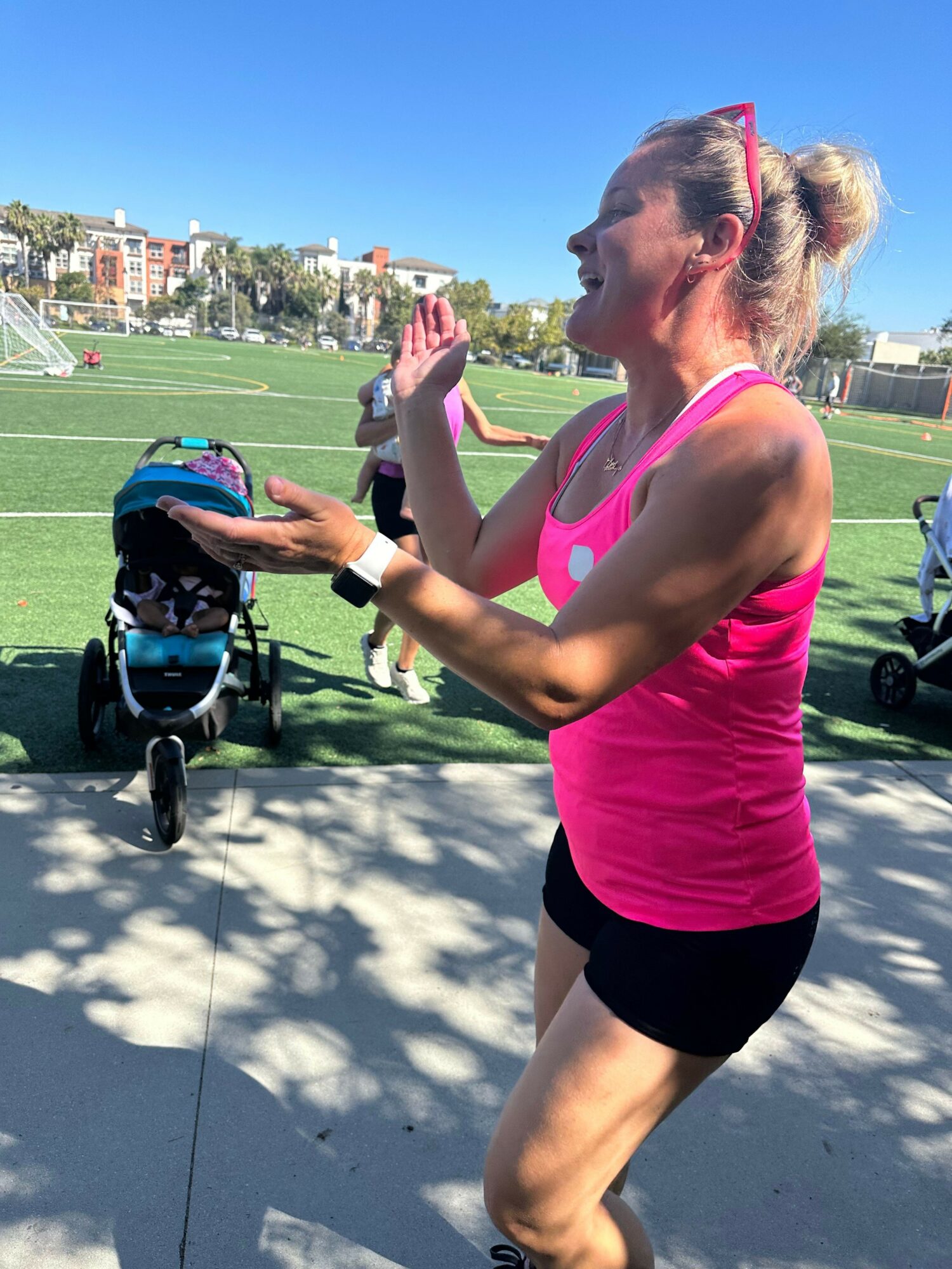As an instructor with FIT4MOM Westside, I teach the Stroller Strides, Stroller Barre, and FIT4BABY (pre-natal) classes that we offer. My classes are filled with a variety of exercises and movements specifically designed for pre and postnatal health, including modifications and progressions to serve women at all stages of motherhood and fitness levels. I also include songs, movements, and props like puppets, scarves, and musical instruments, that keep the little ones entertained so mom can relax a little more during her workout and really get in some much needed “me” time. While it is important to get an exercise in, I also make it as fun as possible for the moms and try to get them laughing. If I can get your mind off both “momming” and how hard it might feel to move your body, I feel like I’ve taught a successful class.