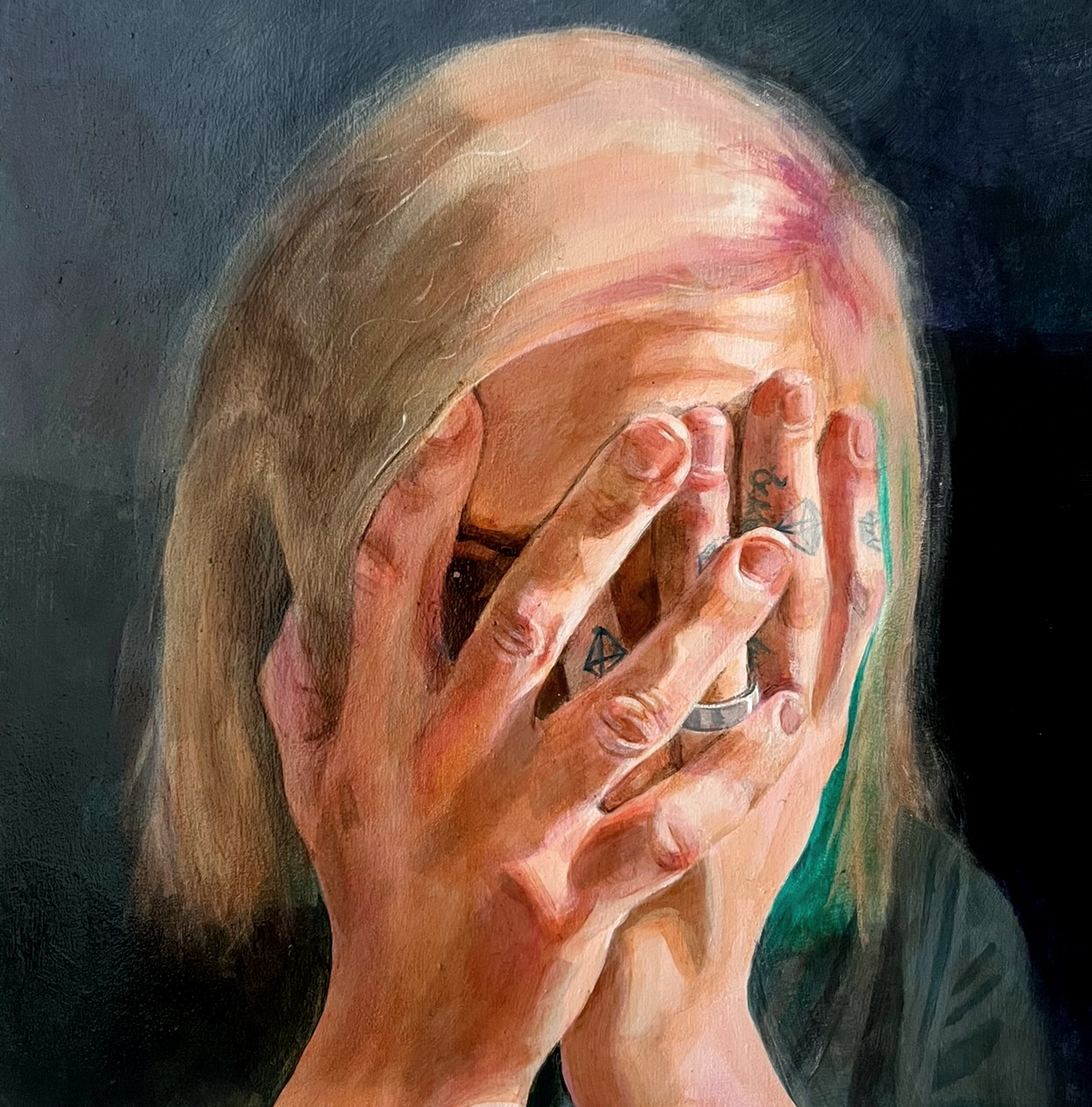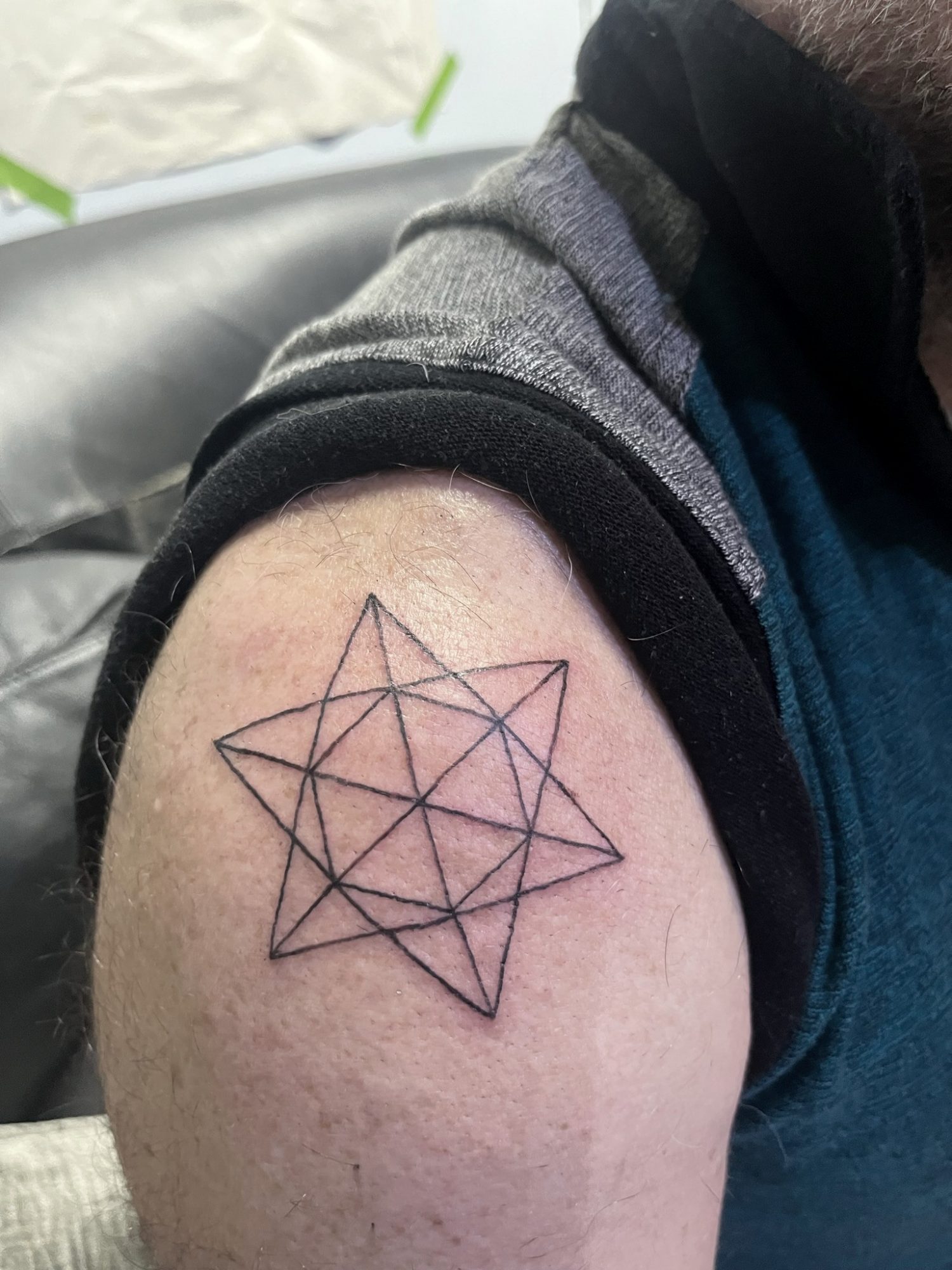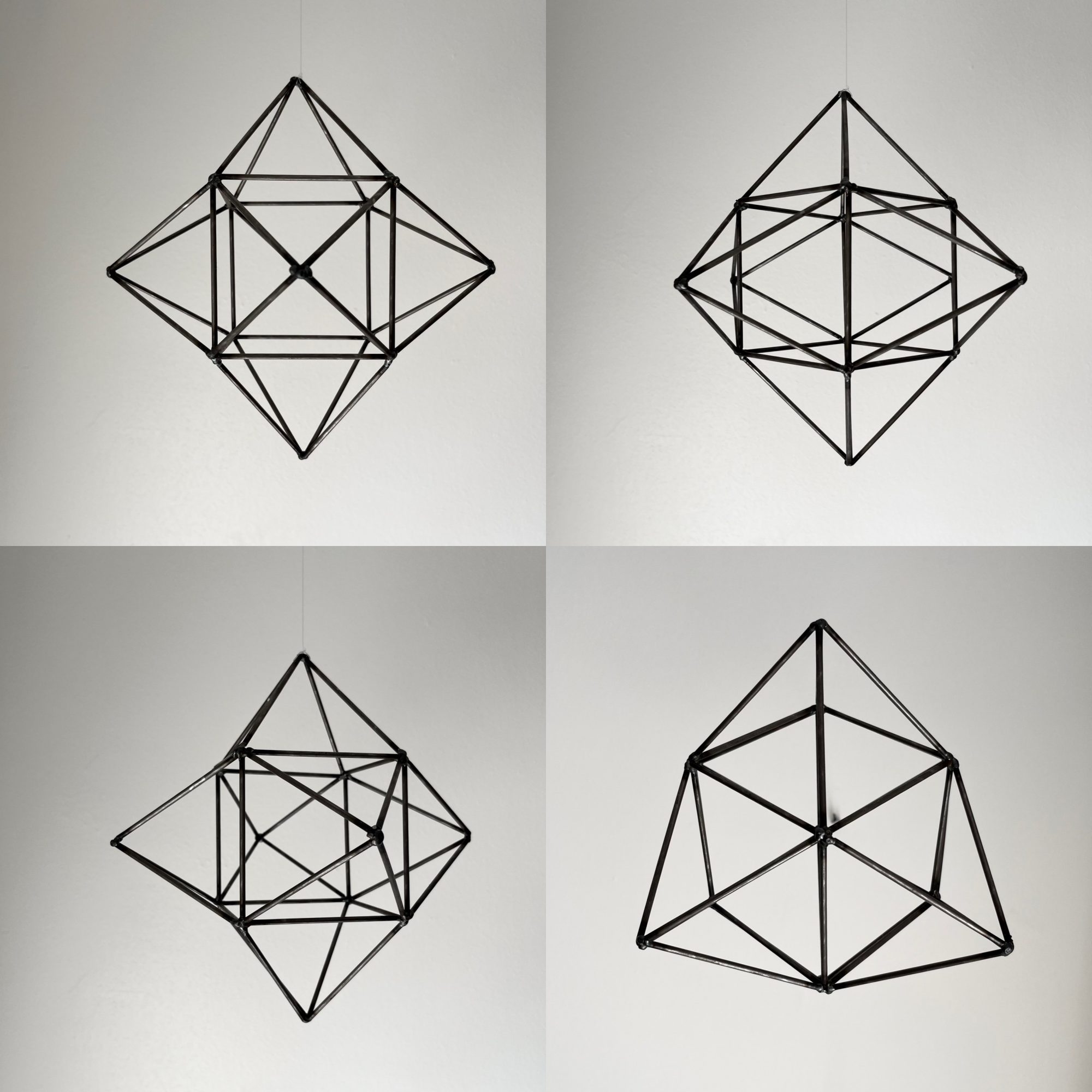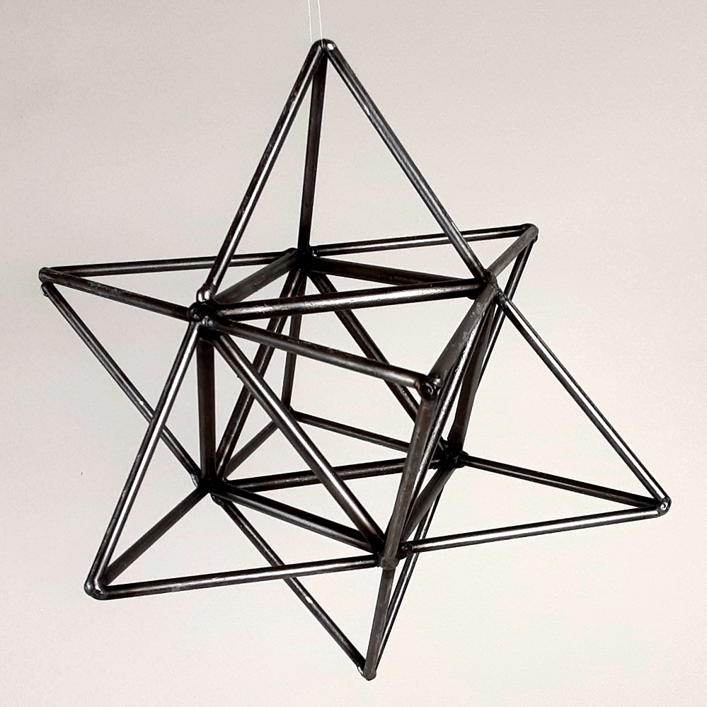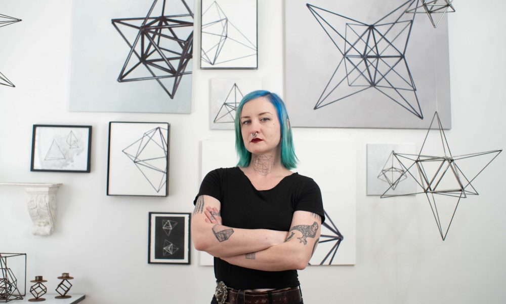 In this dance between the abstract and the concrete, I explore form, structure, and existence. Every line, angle, and intersection in my geometric compositions is a deliberate effort to capture the universal essence found in our physical world. For example, how is it possible that hexagonal molecules of ink can be drawn into a two-dimensional octahedron on a shoulder, and how does that octahedron pull one into thinking about how that crystalline shape aligns one’s skin with diamonds and fluorite? Or imagine a steel hexahedron sculpture hanging from the ceiling, casting shadows that stretch and dance across the room. It hints at perfection, but its position purposely introduces imperfections, making us oscillate between different possibilities.