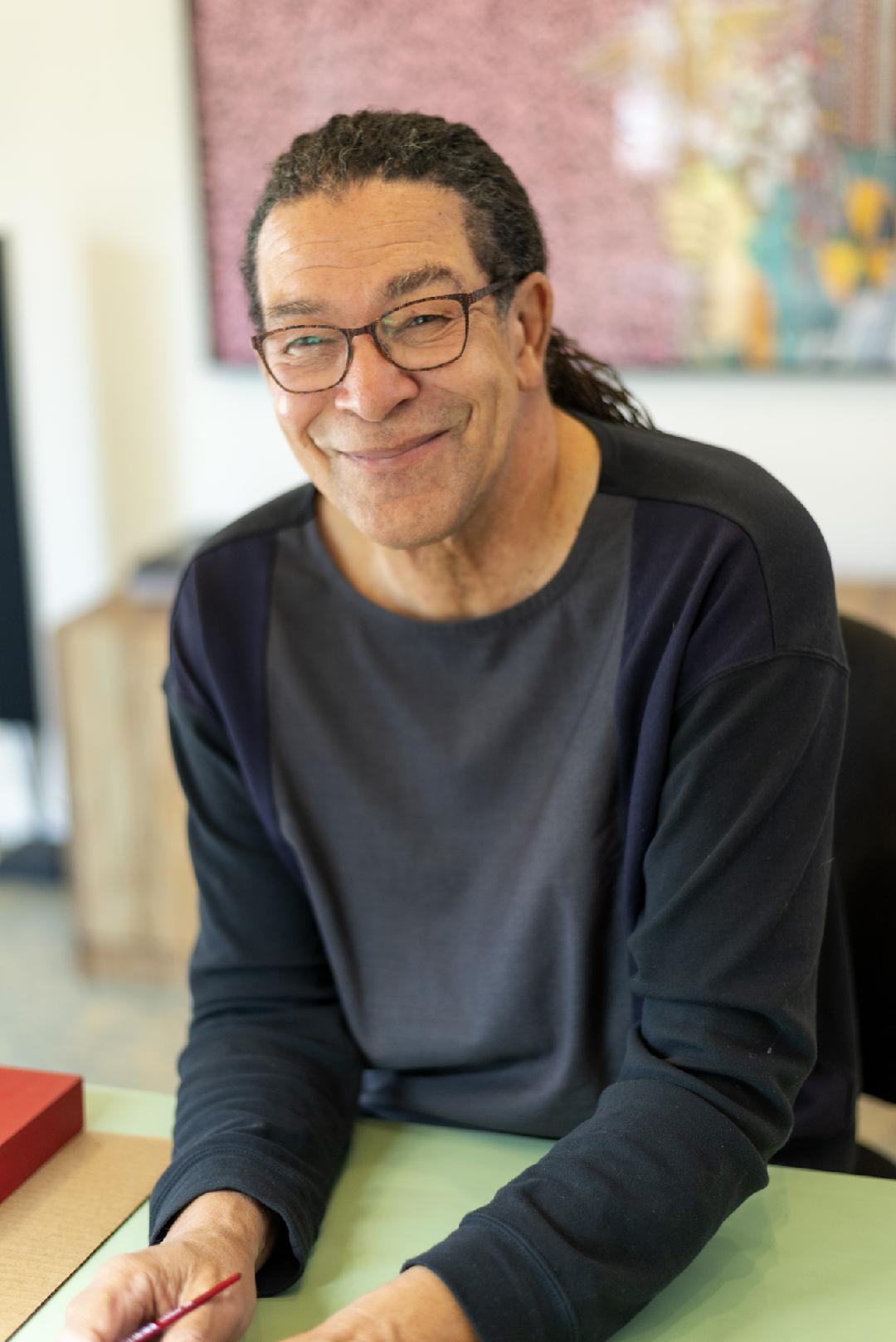 Mark Steven Greenfield was born in Los Angeles, California in 1951 to a military family; a factor that would be of considerable importance in his development as an artist. Living in Taiwan and Germany, he was exposed to both eastern and western art and philosophy at an early age and these experiences have had profound influence on him ever since. He attended California State University at Long Beach, graduating in 1973 with a bachelors degree in Art Education. He later earned a Master of Fine Arts degree from California State University at Los Angeles in painting and drawing. Over the past thirty-five years he has established a reputation as both a curator and a fine artist, having exhibited extensively in the Southern California , Europe and Asia. One of his most notable exhibitions entitled “Crenshaw Consciousness” chronicled the artist, musicians, poets, dancers and eccentrics that live in the Leimert Park area of Los Angeles. In recent years he has been exploring the effects of African American stereotypes, from blackface minstrelsy to the racists cartoons of the 1930’s and 40’s, African based spirituality and iconography