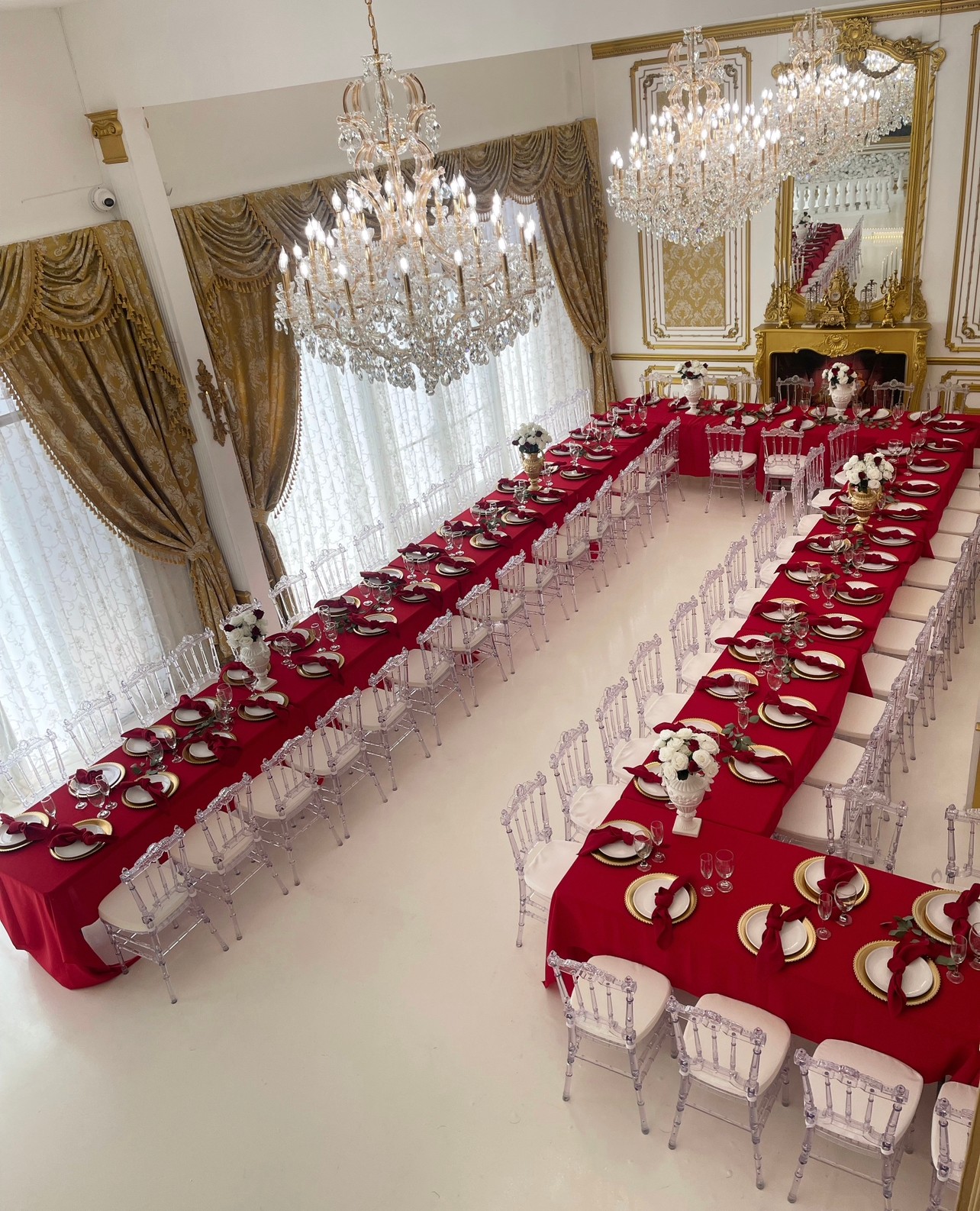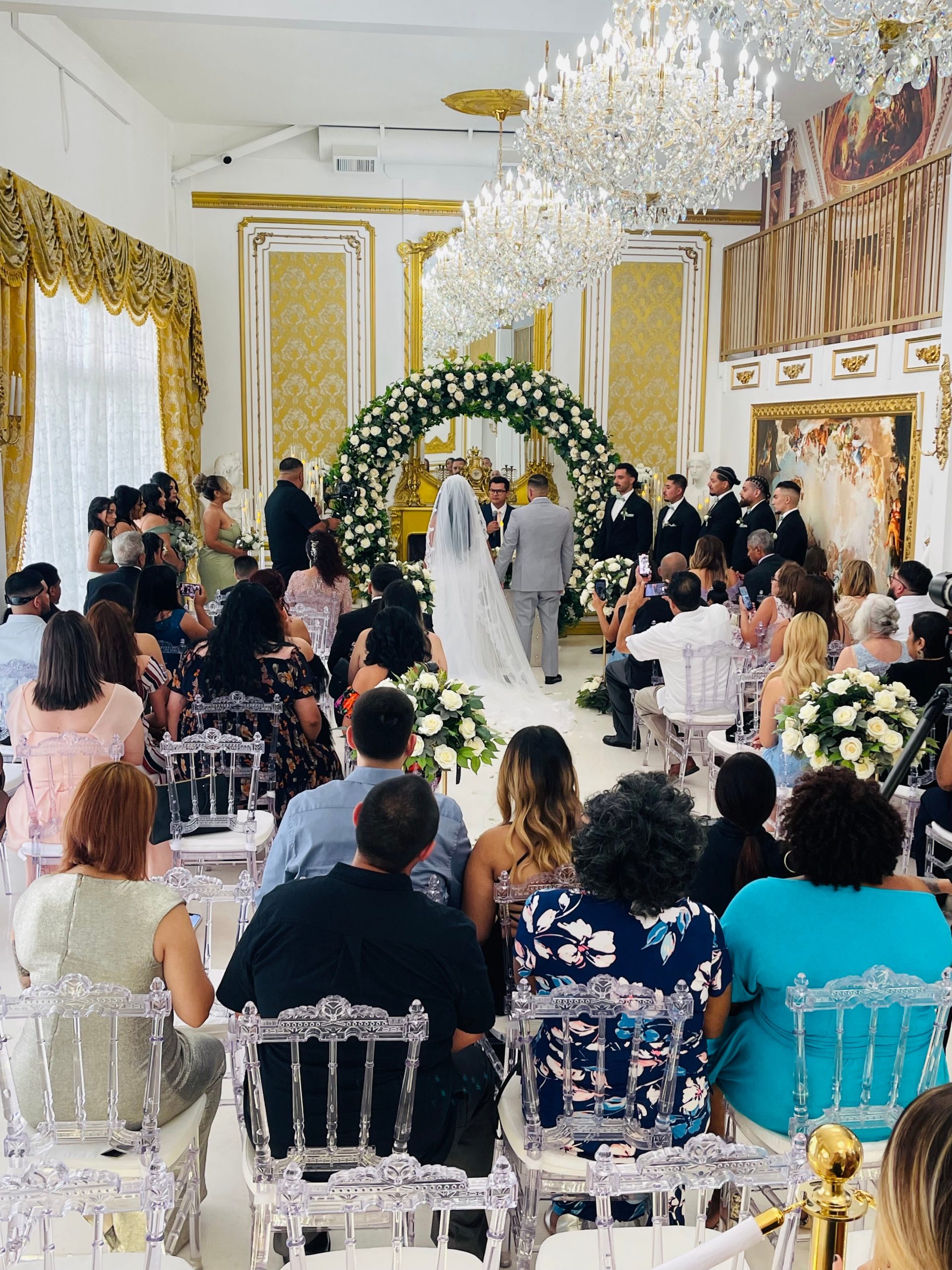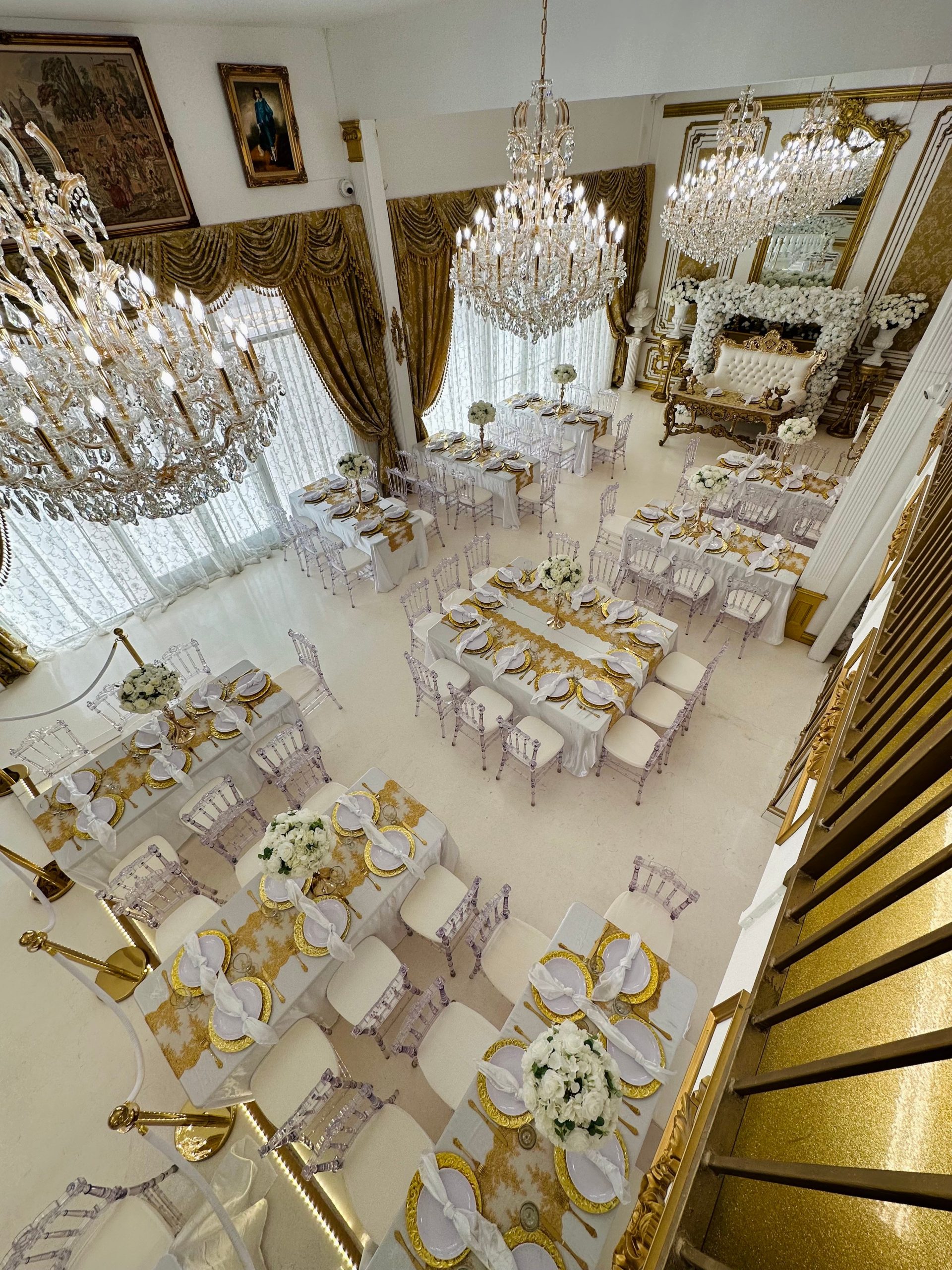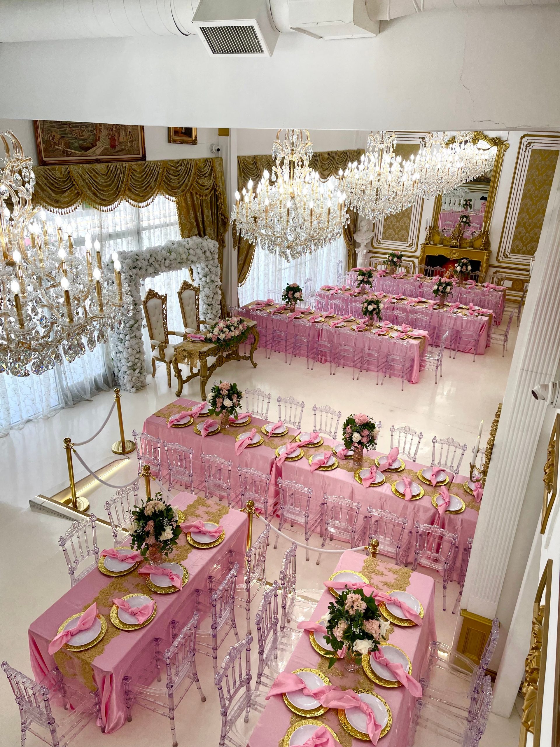We are Michael and Amanda, the Owners of The Glass Slipper Palace. We started off looking for a Venue for our own Wedding. We couldn’t find anything we loved or envisioned anywhere in Los Angeles. We built an office in our basement with a vision board and planned for two years during the pandemic. Everything we wanted at our Wedding Venue was on this board. White and Gold esthetic, White Glitter Floors, Gold Glitter Floors, a Swarovski Glass Slipper, Huge Crystal Chandeliers, European, Palace of Versailles inspired but after everything opened up, we found a place in Los Angeles. Everything that was on the vision board has come to life at The Glass Slipper Palace. It’s like a dream come true…