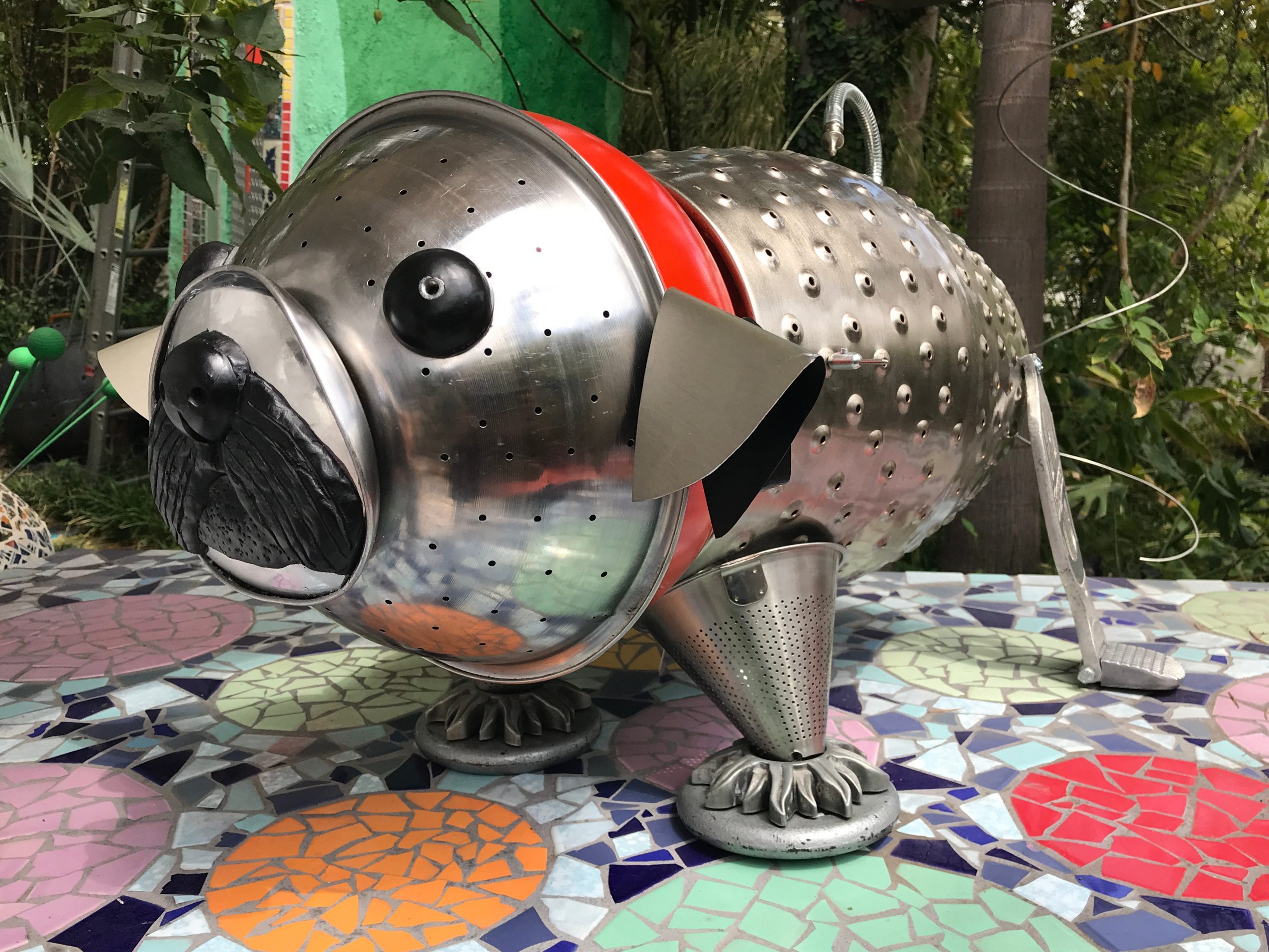 When computer software replaced many prop and miniature-making skills, I decided to have my own machine shop and bought a lathe, milling machine and other machine tools. I got more and more into non-functional art and started building sculptures. I also got heavily into mosaic art. Not only did I tile our whole house but was commissioned to create mosaic tile treatments in other homes. Today I am building sculptures out of both found objects and custom-fabricated parts. I like the idea of using objects that people discard and giving them a new life. I am also working to combine my two passions: art out of metal and ceramic tile mosaics. At this moment, I am going big, building my third tower at 15′ high and about 6′ in diameter. I used steel, wire, concrete and mortar to build the structure. This one will have white stucco and colorful concrete spikes on the outside and tile on the inside. In the center, I am building a spiral staircase to eventually go up to the roof of our house. The last tower also had an actual function since it has a roof garden which I always wanted to have.