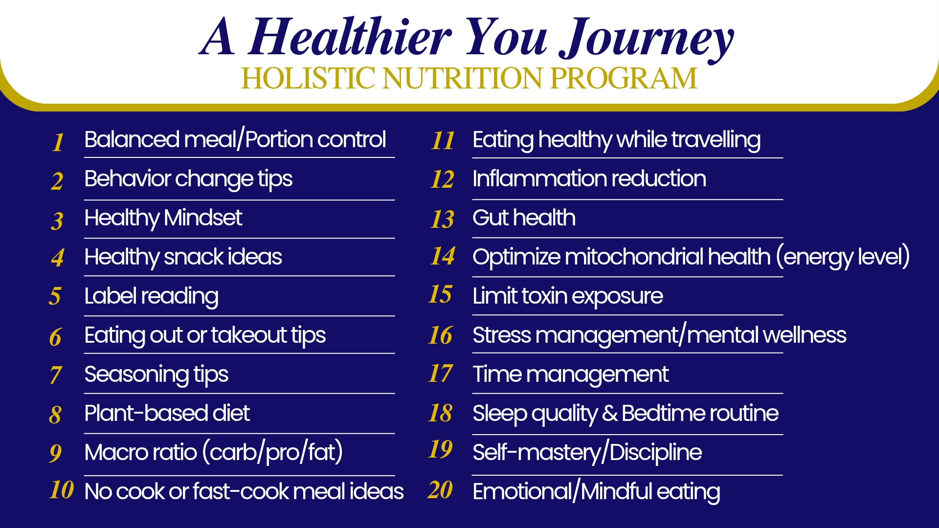 Also, my program has a very comprehensive holistic approach that focuses on Identity-based Habit Change in order to achieve long lasting results. Besides nutrition, I also cover other dimensions of wellness including Fitness, Mental Health, Toxin Free Environment, Stress Management, Time Management to prioritize health, etc. Please see below for some of the topics I cover in my coaching program:
