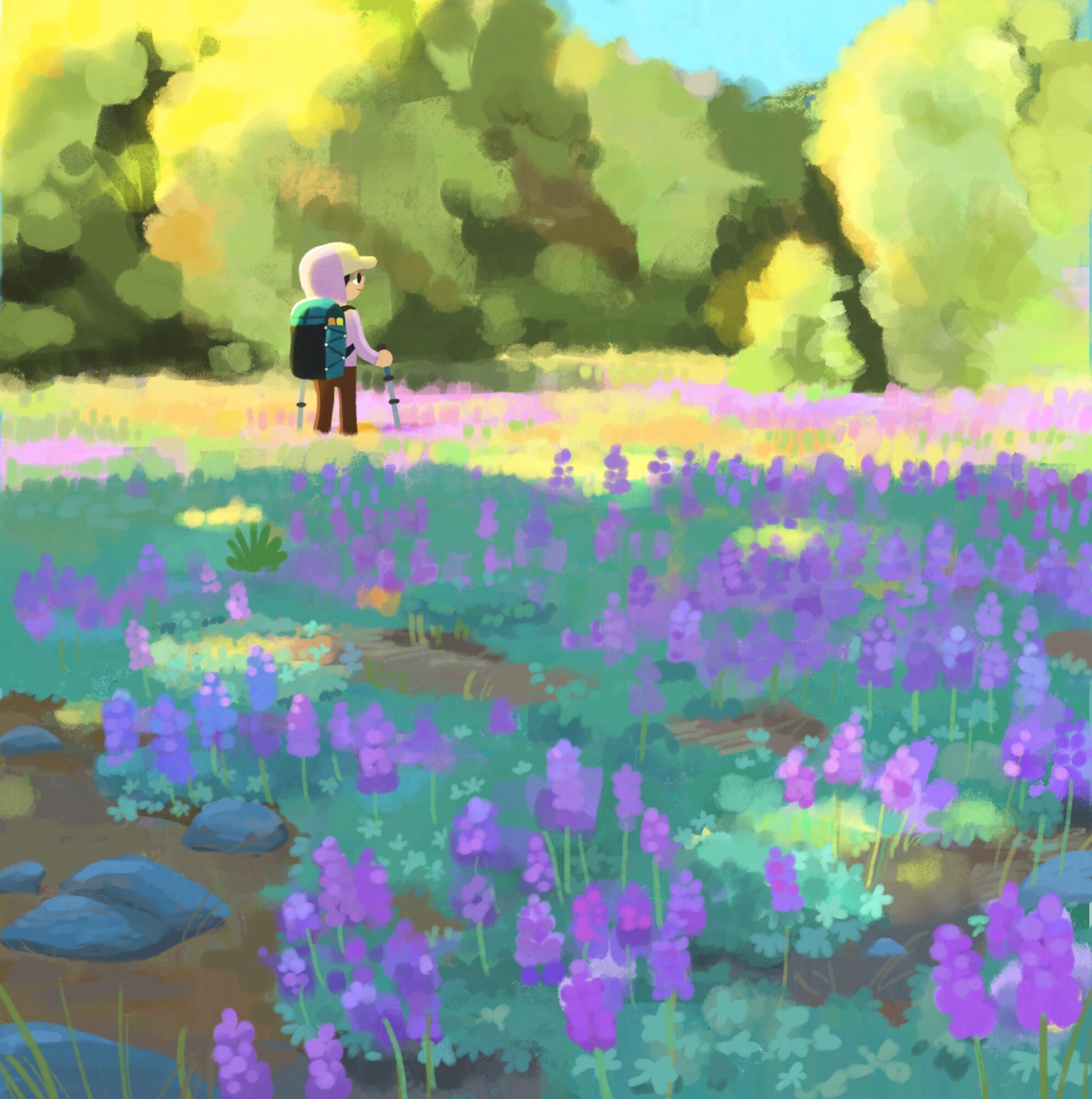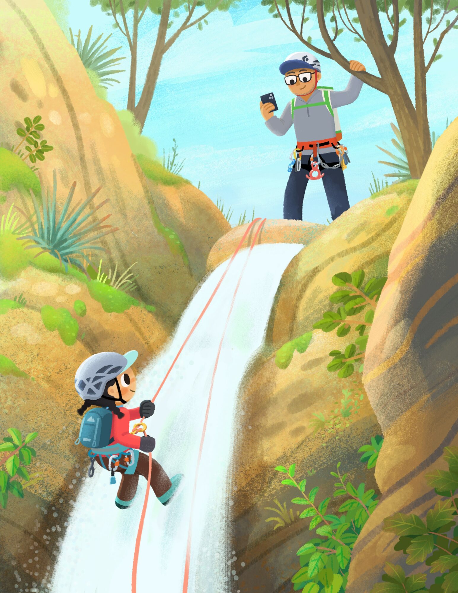 People who only know me through my art account probably don’t know how much time I spend pursuing my outdoor hobbies. I grew up whitewater kayaking in the rivers of Nor Cal with my dad and our family would camp, hike, and ski. I stopped doing those activities when I got more into art as a teenager, but after turning my hobby into a job and spending the majority of my week at a desk, I started reminiscing on those childhood days again and yearned to be active outdoors. I got back into those childhood activities and added backpacking, scrambling up Sierra peaks, sport climbing, bouldering, and canyoneering to the mix. It’s my greatest source of inspiration and a good way to give my eyes some rest/stretch my legs after starting at a screen for so long! My recent favorite thing is backcountry skiing, and I’m hoping to make an illustration of it soon.