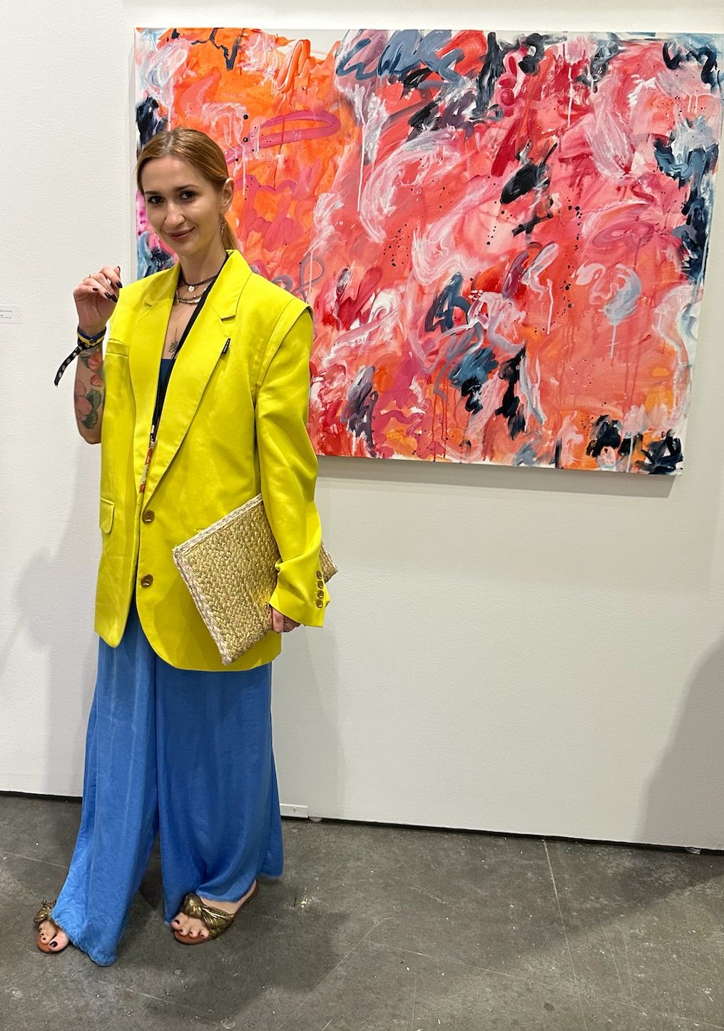 When it comes to my artistic process, I am captivated by the large-scale art. I allow the motions of my body to guide the composition, infusing my work with an organic and fluid energy. It’s almost like a visualization game to me, where I explore the potential of colors to evoke different emotions and sensations. To add depth and texture to my pieces, I employ mark-making techniques using oil pastels. Mixed media is my preferred medium, as it allows me to combine acrylic, oil sticks, and soft pastels to bring my artistic visions to life.