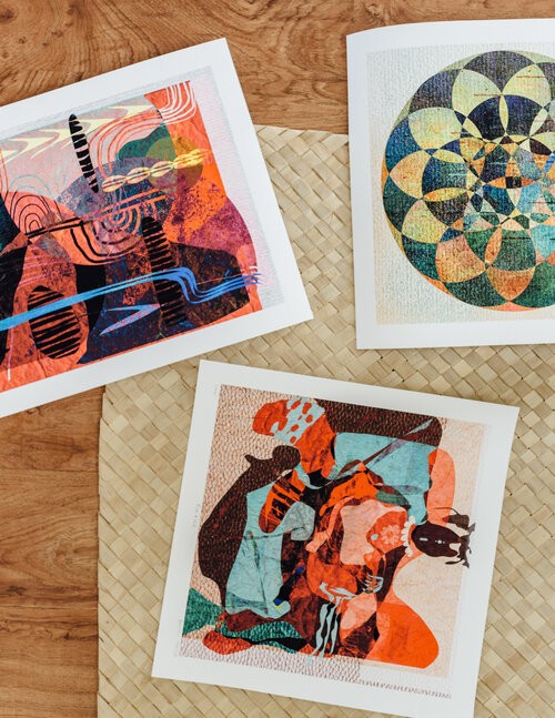 Matisse has always been one of my inspirations and in particular his cut-outs from later in his life where arthritis prevented him from painting. I love the minimalism of his work during this period and what he is able to convey in the simplest of shapes and imperfect forms. I always had several of his prints around my bedroom growing up like the “Tree of Life,” “the Fall of Icarus” and “Woman with Amphora and Pomegranates” and always wanted to make art that paid tribute to his work. It was from there that I began “collecting” images of paper, cardboard, wallpaper, and rust in different textures, colors off of google searches and brought them into Photoshop. Much like printmaking, I lay my papers in different layers and create my compositions by carving, drawing, copy and pasting, playing with the saturation and opacity of how each layer interacts with another to create my work.