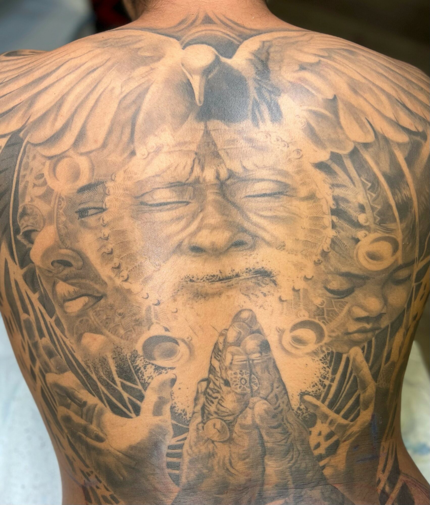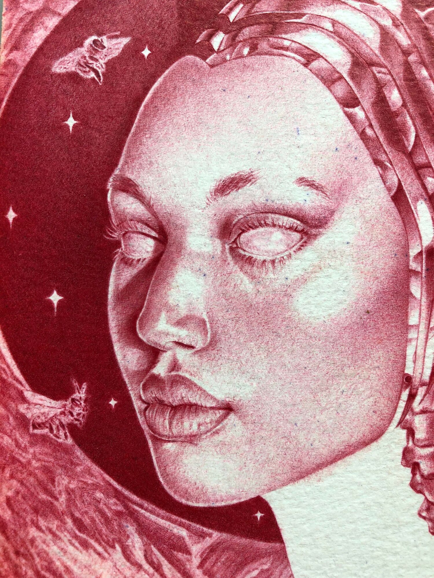 Being deeply perfectionistic at heart, settling into tattooing was a natural fit! When I began taking art very seriously, my husband handed me a ballpoint pen and told me this would be my trusted tool from that point forward. I would do gradients, anatomical and lighting studies, portraits, letters— everything— with the ballpoint pen. I would make full drawings with the ballpoint on napkins, learning how to use the tool without tearing or damaging the napkin. Later, we would go on to create our first collaborative series together, called The Bee and the Butterfly, in which my husband would draw iconic figures in black ballpoint, and I would draw bubbles in an anatomical cross section style in red ballpoint. This is what most people began to know me for. Even after I’ve moved onto different mediums, my love for the level of accuracy and attention to detail—on a pixel level—that working with the ballpoint pen instills will always shape my work. Once I switched over to tattooing, all of the hard and careful work that the ballpoint pen requires translated into a diligent care of creating images on skin. These days, we are constantly expanding our portfolios and stylistic scope. I am pursuing more color tattoo work, and together my husband and I work as a team to create large scale murals—exploring the combination of storytelling and art to enhance community engagement and immersion.