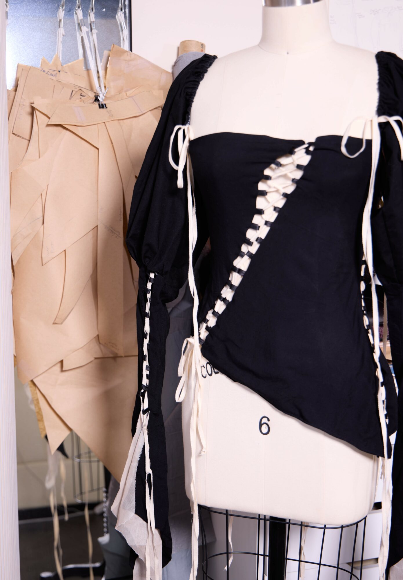 My work is reminiscent of the 1950’s, 1980’s, and 1990’s. These aspects include angular shapes, detailed trims, and larger than life silhouettes. I love to take aspects of these times and put a postmodern twist to it. I often work with wool and prefer to use natural fibers if possible. Texture is essential to my work, as I love to use black fabric.