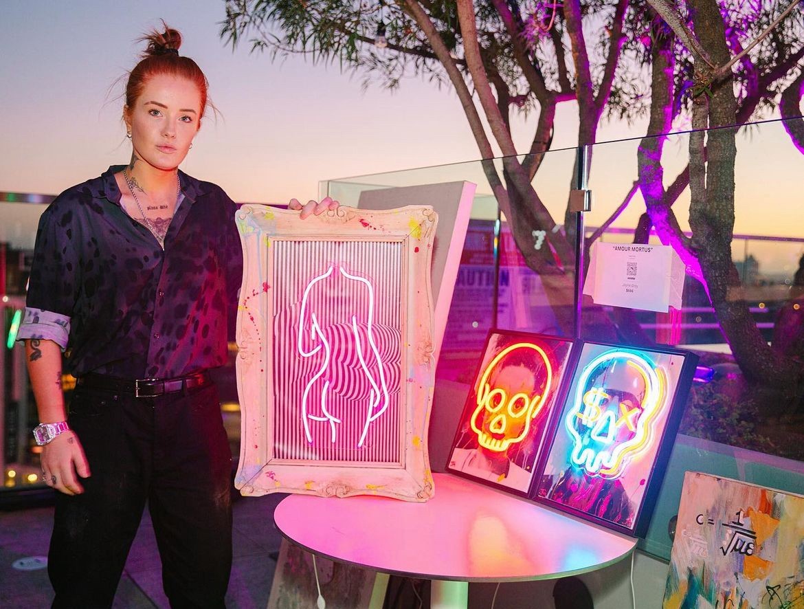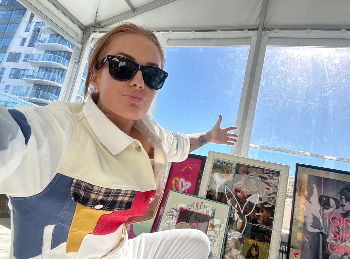 I have always created mixed-media pop art pieces to hang around my own house because I wanted a certain aesthetic that I wasn’t able to find elsewhere. In 2023, I created Queen’s Habit Collective and began publicly selling my art. Queen’s Habit was the name I went by back when I was releasing rap music on Soundcloud as a teenager, so it’s meaningful to me to be able to honor that era of my life without still being a Soundcloud rapper. Currently, LA Fashion Weekend manages me as a visual artist, and my art is displayed at their gallery in Hollywood at the Godfrey Hotel. My art has become known for its incorporation of popular culture, fashion, vintage Playboy elements, dark narratives, and bright neon imagery. I am currently taking classes at the Lili Lakich Neon Studio in DTLA to further develop my design skills as a neon artist. She is a legend in the neon community, and it’s been an honor to learn from her. I am grateful that the art has been selling really well, and I can’t wait to see what we come up with this year.
