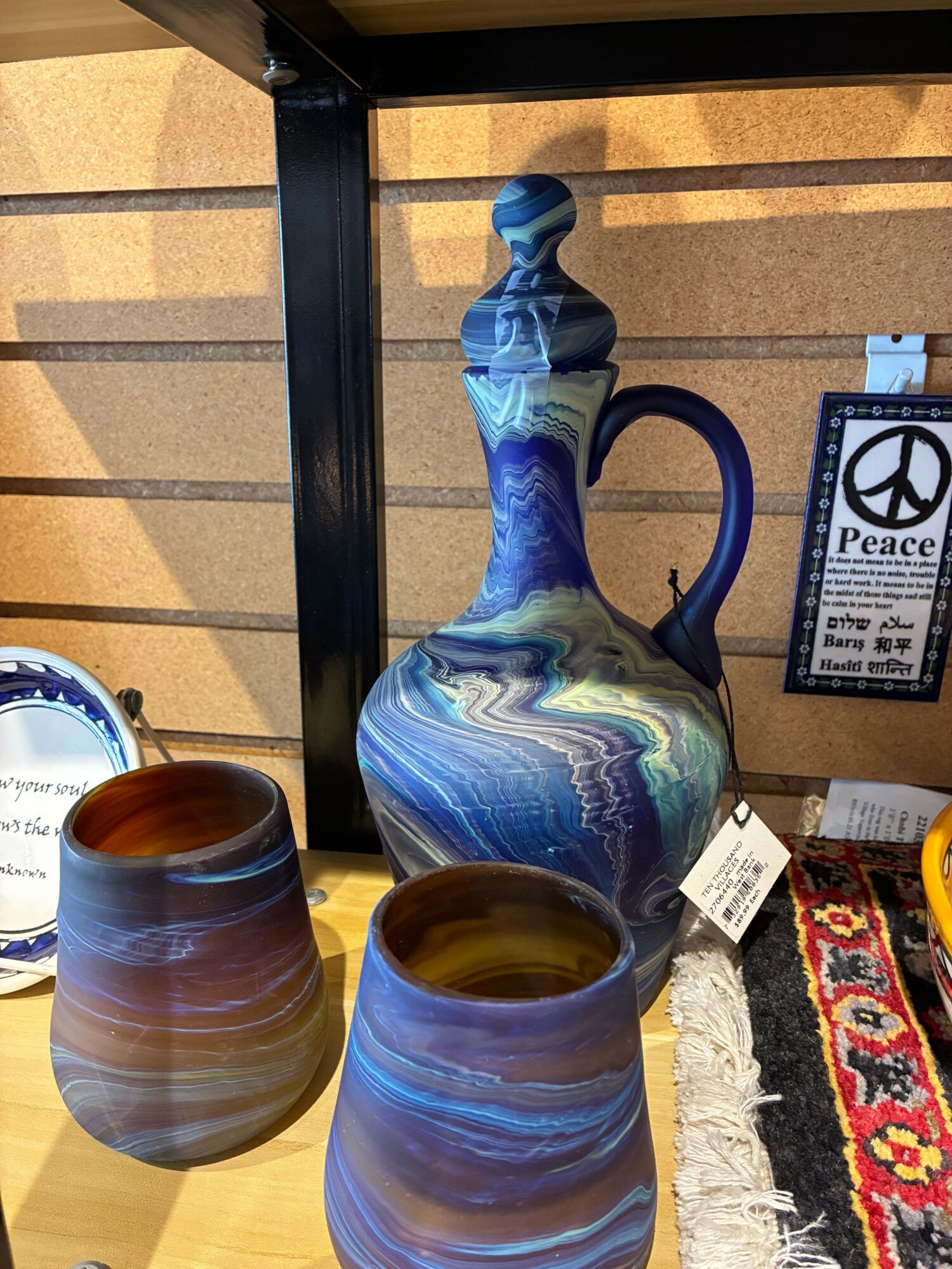 In our 1500 square foot shop we represent over 30 different countries around the world from glassware hand blown on the West Bank to good luck pigs from Chile.