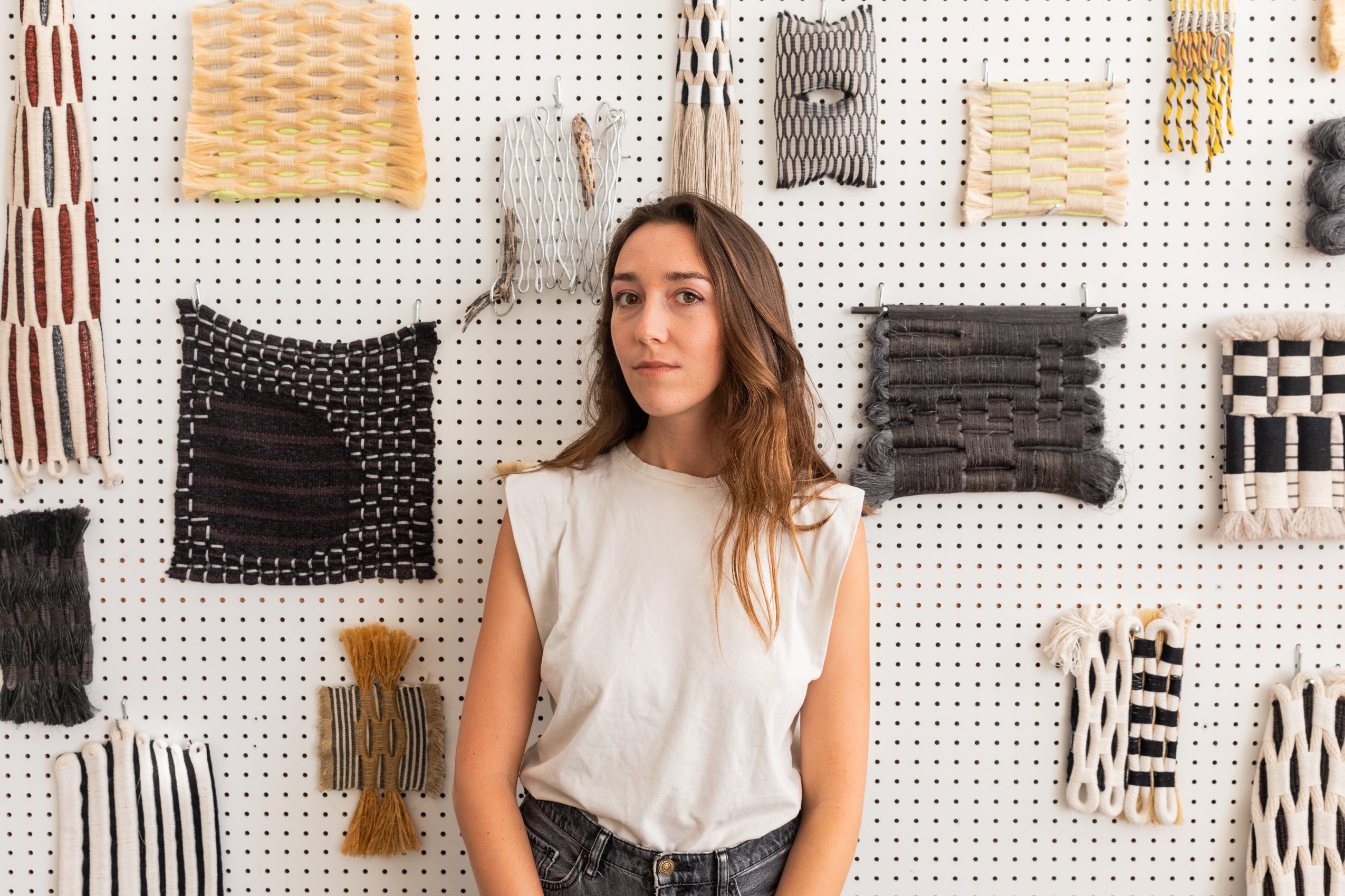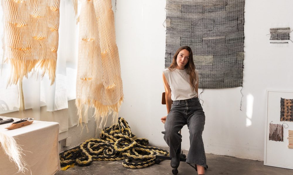 I work on a floor loom to weave sculptural works that explore structure and materiality. I’m known for making complex, tactile surfaces that blur the line between natural and human-made. Depending on the materials I use, they can resemble architectural grids and nets or appear more like organic natural systems. The work finds harmony in the tension between humans and the natural world and uses weaving as a metaphor for the ways we distort the order of nature.