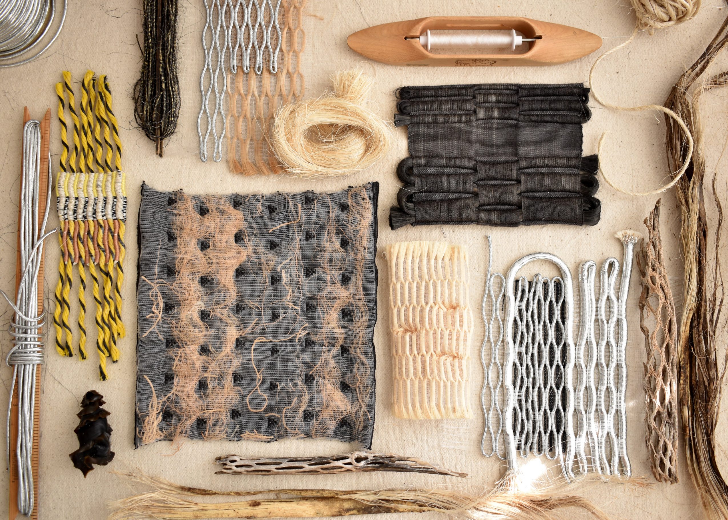 I think what sets me apart from others is that I’m very experimental with my work, but have a clear language. I primarily use a weave structure called “deflected wefts,” which I learned at RISD and later saw used in the textile industry. I have an insatiable thirst to try new materials and am willing to work with “difficult” materials such as clear fishing lines and unprocessed plant fibers which take time to master. My work is recognizable for the way I control and distort these materials during the weaving process, bringing tension and order to chaos.