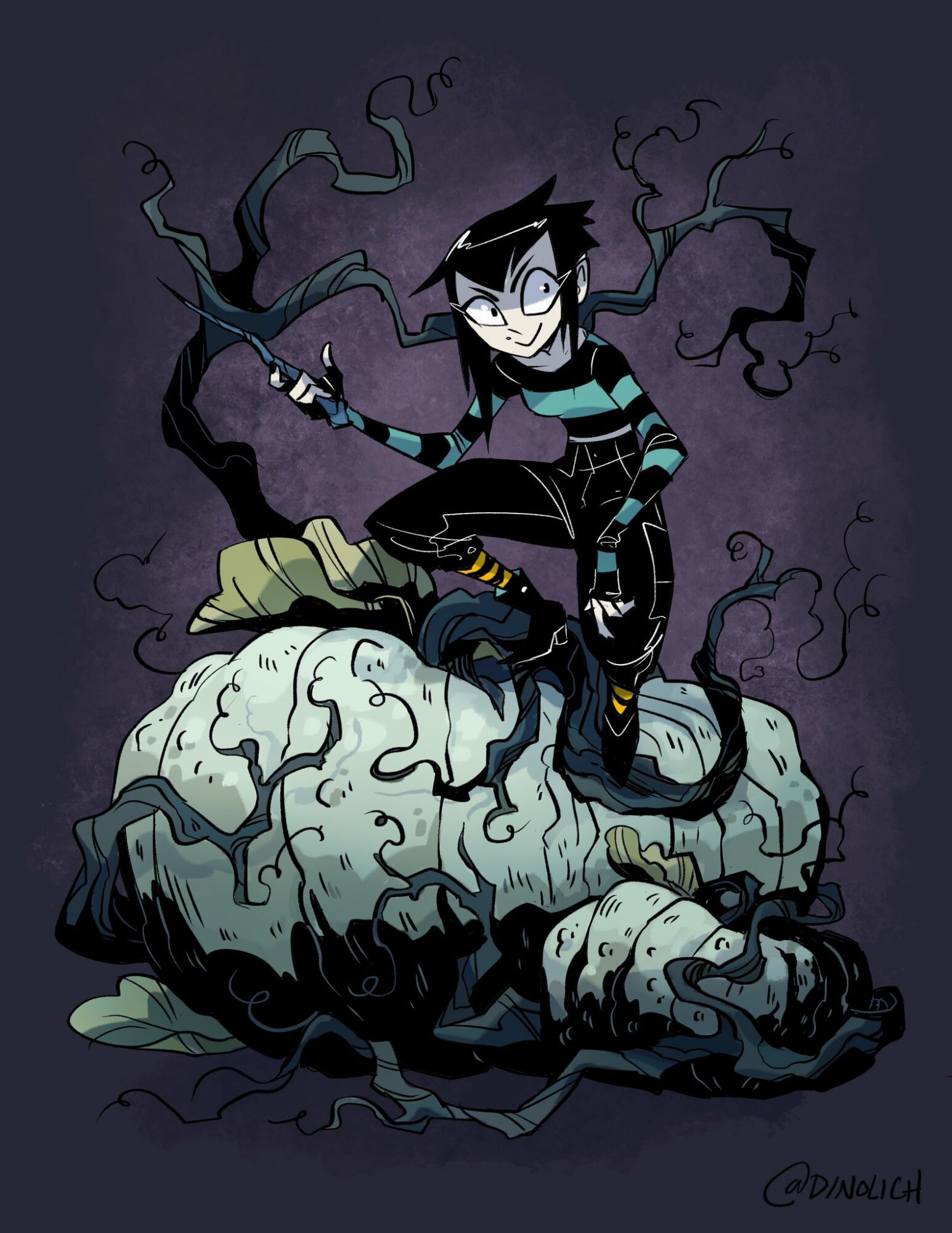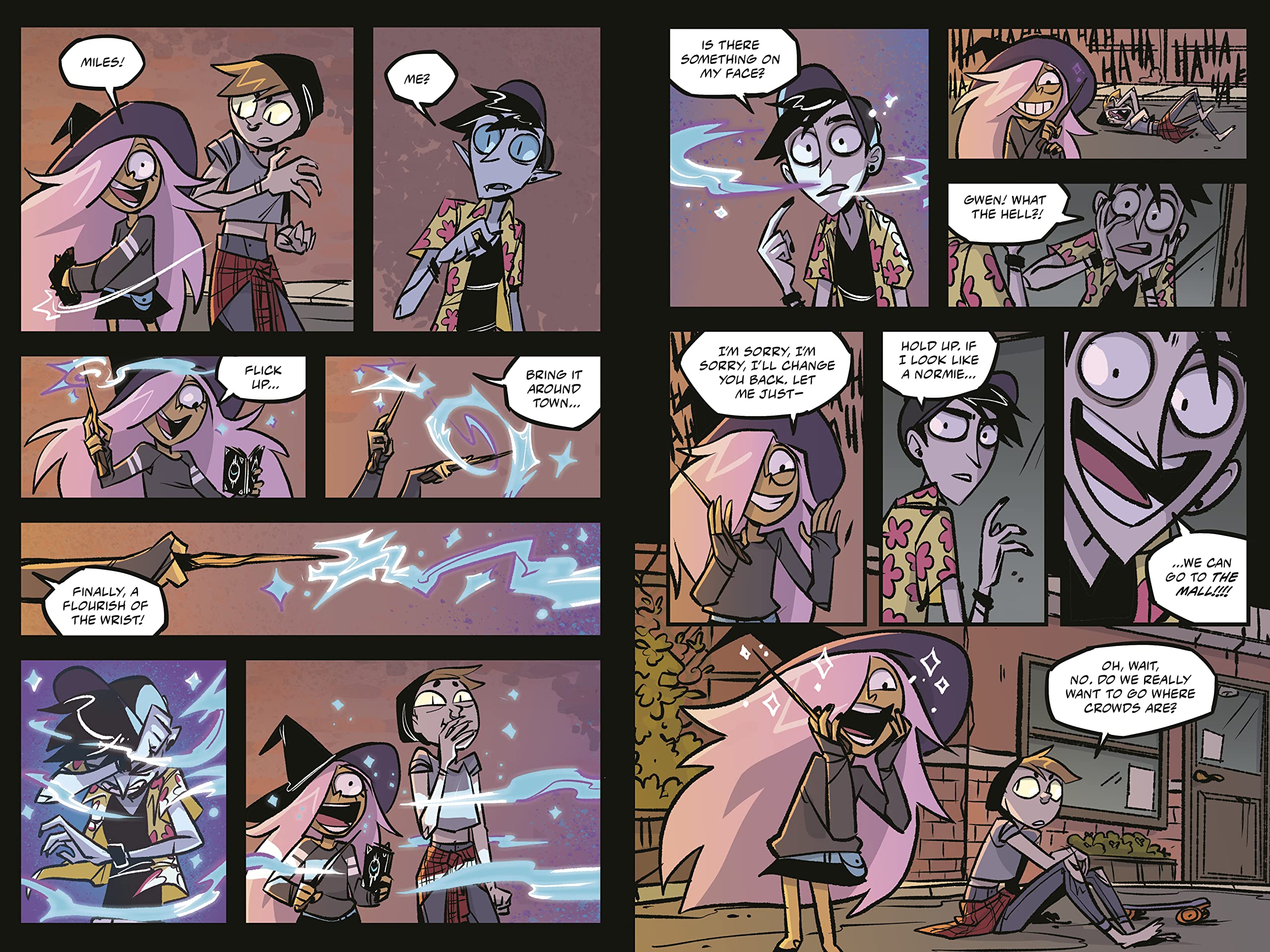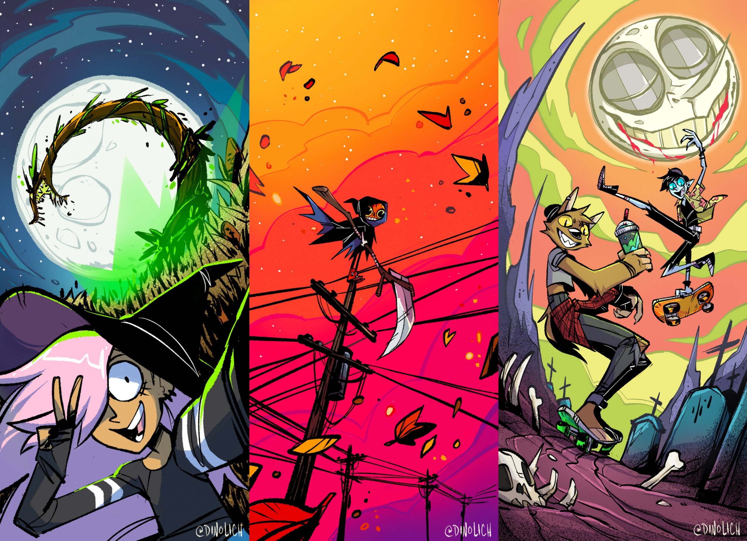 In tandem with my storyboard work I was also developing my voice as a creator. I came up with pitches for shows to share with studios and drew comics for my online platform before landing a two book deal with Penguin Random House for my graphic novel series HELLAWEEN. Through my comic I was able to combine everything I had learned from animation with my experiences growing up in California. It’s a celebration of alternative culture and the thrill of having a holiday that revolves around the strange and unusual, combined with the emotional turmoil of being a teenager without the right outlets for your emotions, and struggling to express an identity you don’t have the words for yet.