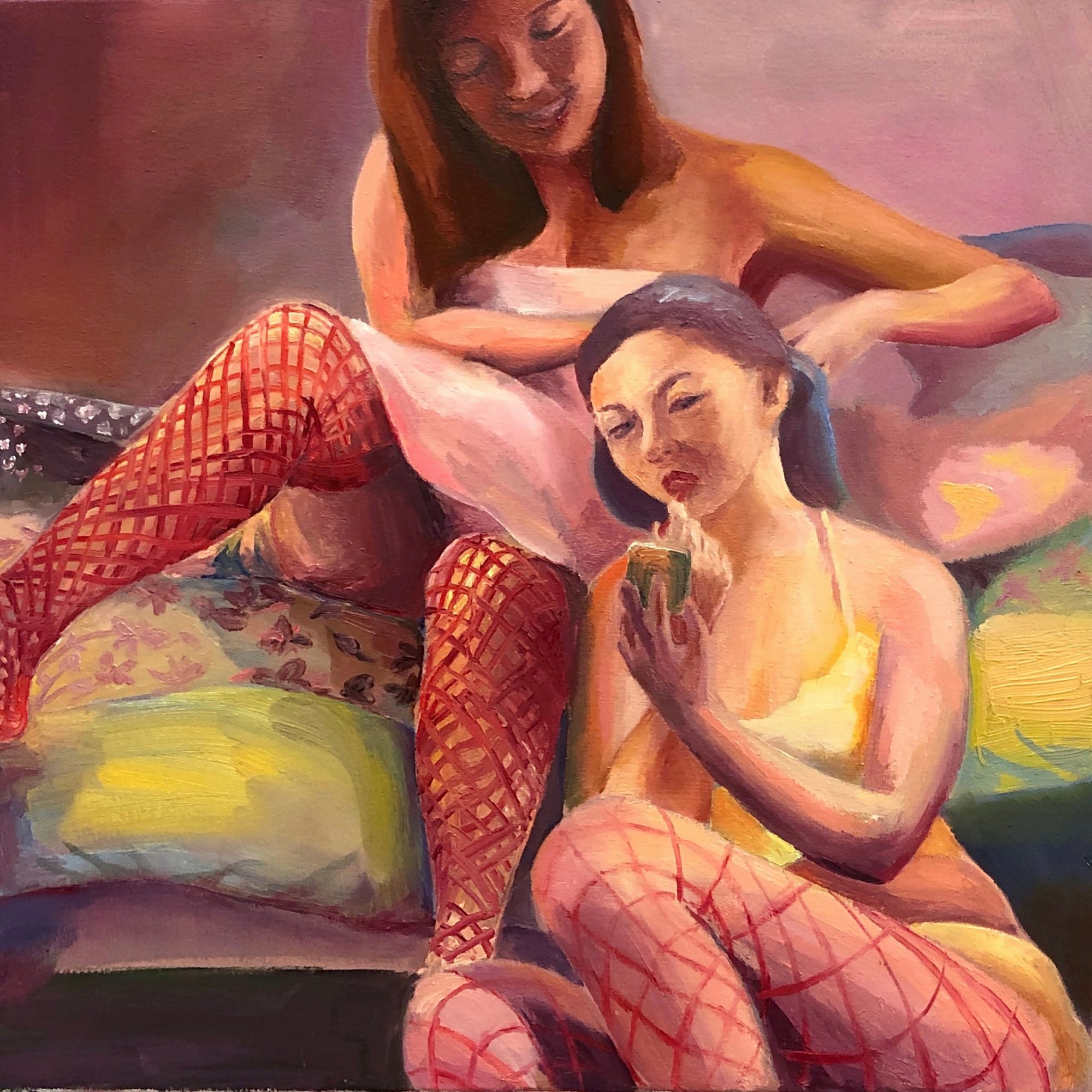The females I saw while growing up have also inspired me, such as my grandmother, my ballet teachers in my childhood, women I saw in the shopping mall or on the subway, etc. I found them beautiful in their own ways. As an Asian-identified woman living in Western society, I’ve realized that most of the time Asian women are being perceived as agreeable and minding our own business, which sometimes our voice is easy to be translated as insignificant. My current focus in my work is to give the selfhood and agency to the women in my paintings – they can be soft and sensual, they dream, but they are also resilient, rebellious, comfortable in their own skin, and so many more.