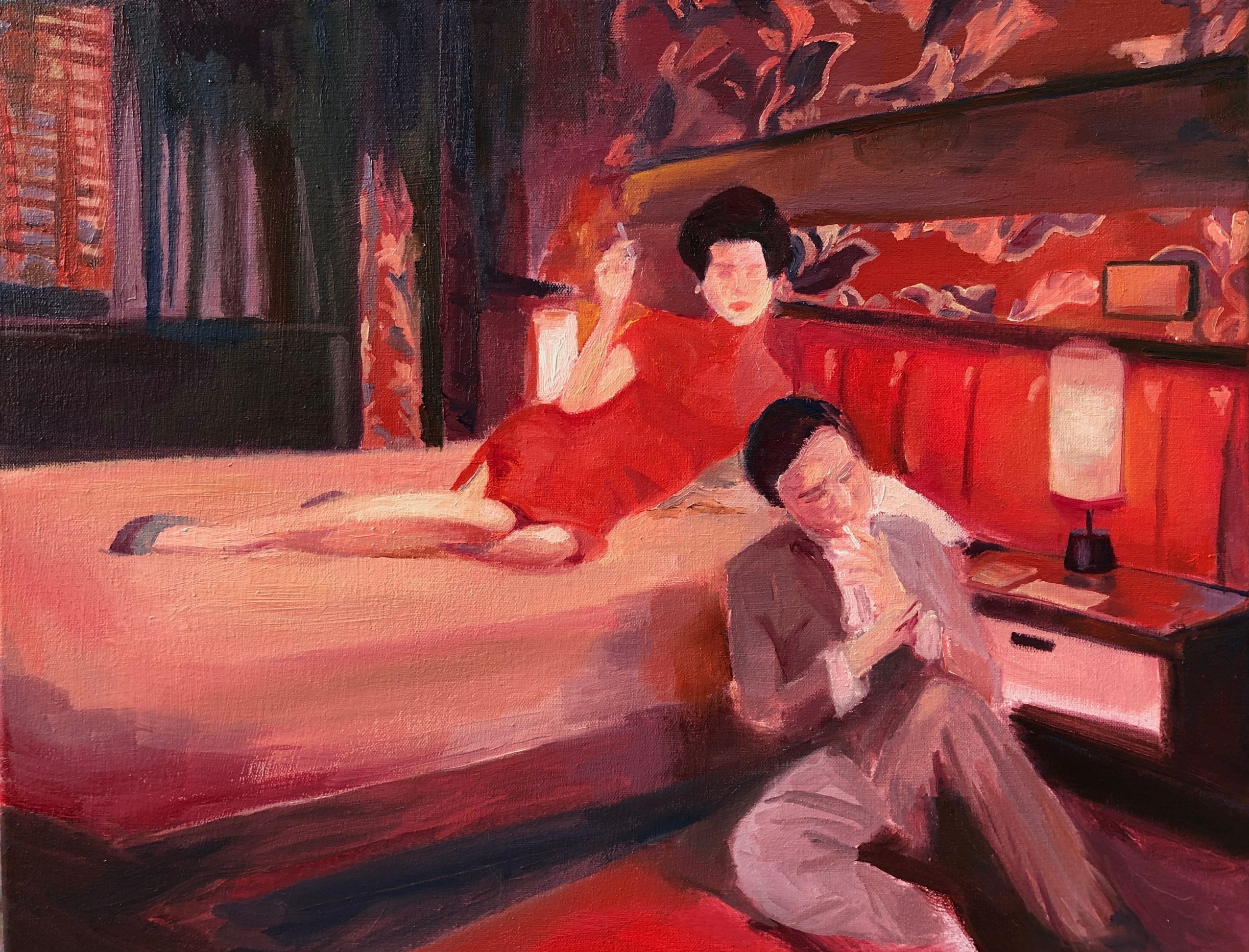As a multi-disciplinary artist, I work primarily in drawing, painting, and writing. The subject of my artworks mostly concentrates on exploring women’s self-identities, as well as human psychological activities, while facing collective and personal traumas. Drawing inspiration from photographic source materials and films, my work creates surreal settings with the use of vibrant, playful color palettes, conducting open discussions on the idea of femininity through different fictional characters. Lying between realistic and representational artistic styles, my paintings capture female figures in a variety of actions that further reflect women’s deeper insecurities and uneasiness through a voyeuristic lens. Subject matters like the introspection of being in a woman’s physical body, fantastical delusions and rampant emotions, which are difficult to be delineated through words are able to find their way in stories in the paintings.