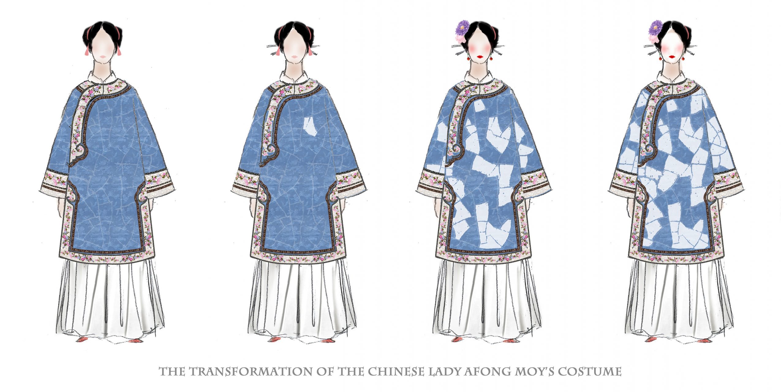 In my recent design, The Chinese Lady, the actress’s costume gradually sheds in harmony with the evolving storyline and the character’s inner transformation. The costume’s patterns and colors slowly decay and fade as the narrative unfolds, offering a visual portrayal of the characters’ internal melancholy and desolation in a non-realistic fashion.
