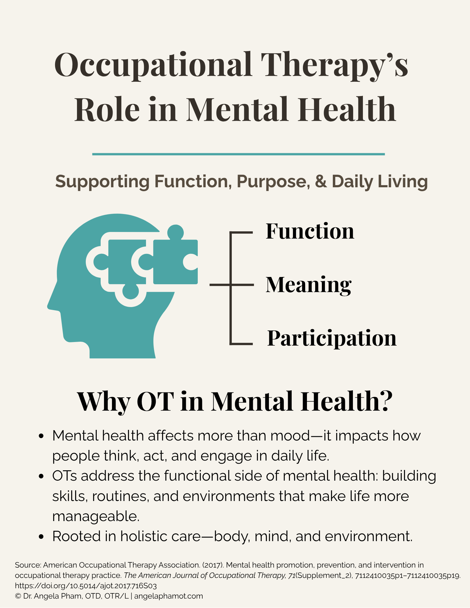 As mental health awareness continues to rise, the demand for services that address both psychological well-being and daily functioning is expected to grow. Occupational therapists are uniquely positioned to meet this need, given our expertise in supporting individuals in meaningful activities and promoting functional independence.